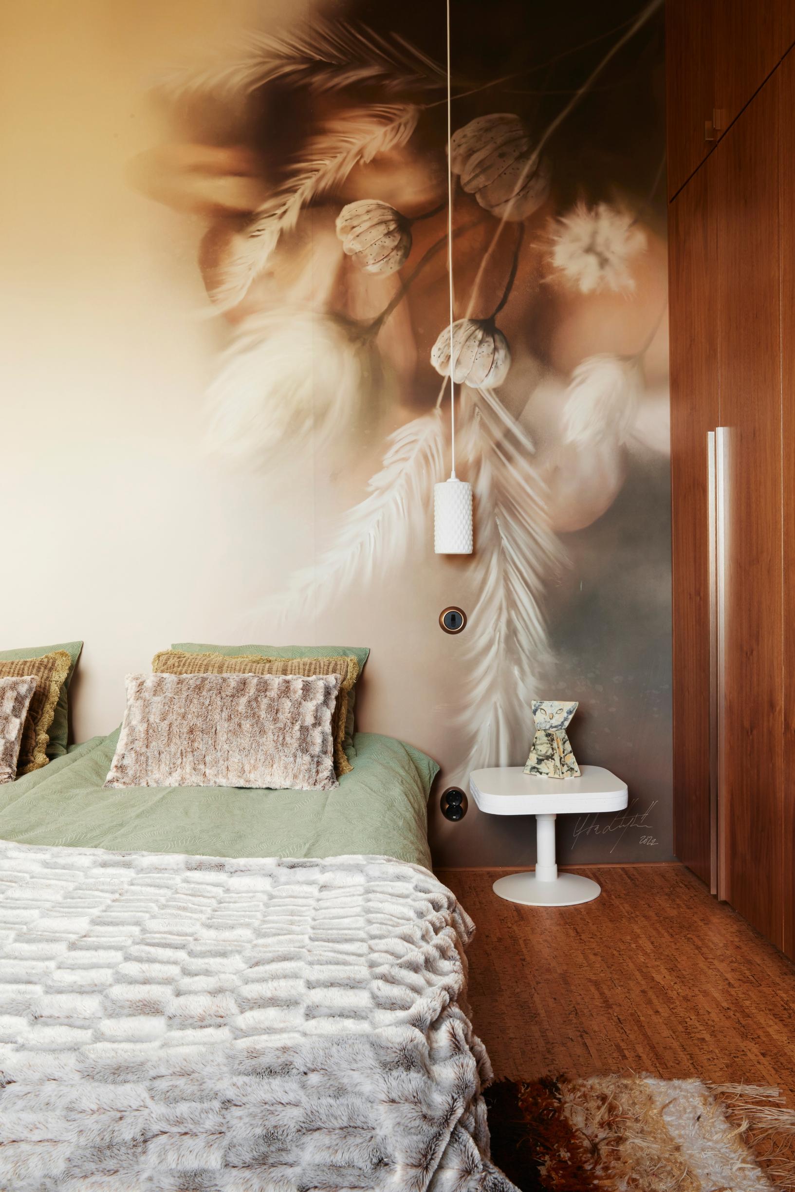 Olohuoneen vieressä sijaitsevan päämakuutilan säilytys on ratkaistu seinän kokoisella pähkinäviilukaapistolla. Kaapiston reunaan on jätetty noin metrin levyinen ja pronssipeilillä taustoitettu syvennys, jota voi käyttää laittautumispaikkana tai työpisteenä.