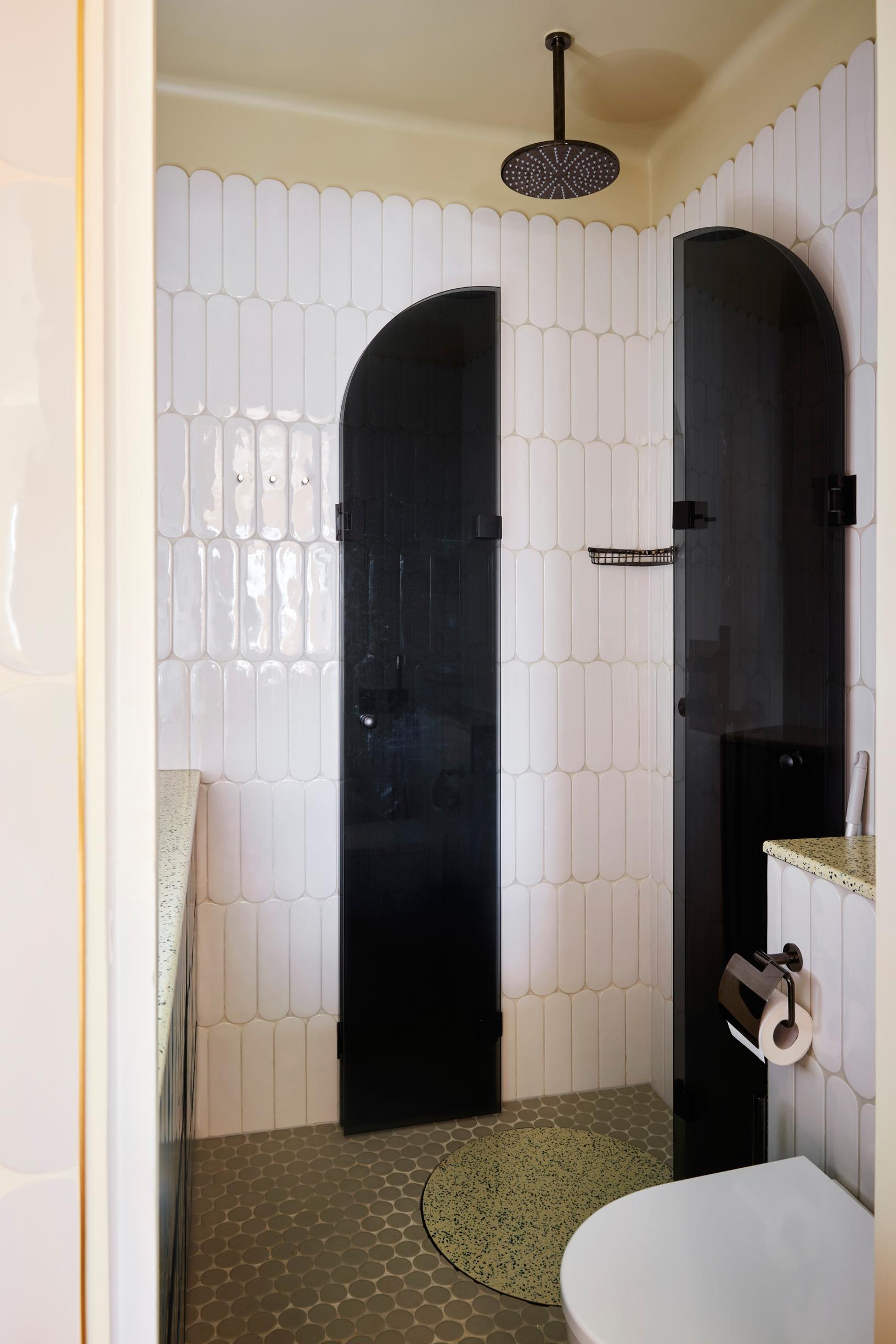 Lasiovista siilautuva valo osuu pyöreäkulmaisilla laatoilla toteutettuun laattaseinään. Pystytiililadonnalla tehty upea seinäpinta muistuttaa modernia kuviotapettia ja näyttää todella haastavalta toteuttaa.
