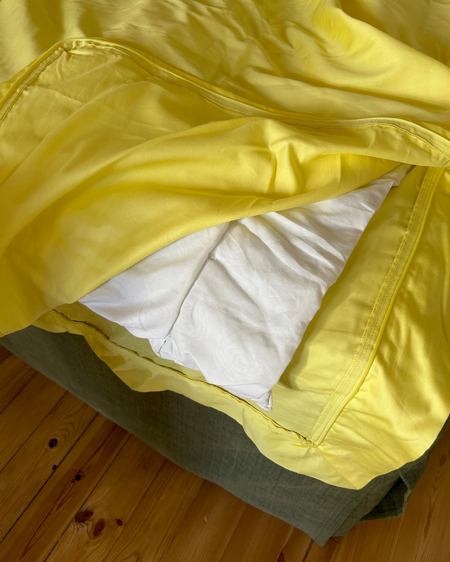 Merfysin puuvillasatiinisten pussilakanoiden juju piilee siinä, miten peitto asetetaan pussilakanaan. Perinteisen päätyaukon sijaan pussilakanan kolmella reunalla on piilotettu vetoketju, jonka ansiosta lakana aukeaa kuin pizzalaatikko. Peitto sujautetaan sisään, vetoketju vedetään kiinni, ja matka höyhensaarille voi alkaa. Kätevän vetoketjun ansiosta myös leveiden vuodevaatteiden vaihtaminen onnistuu helposti.