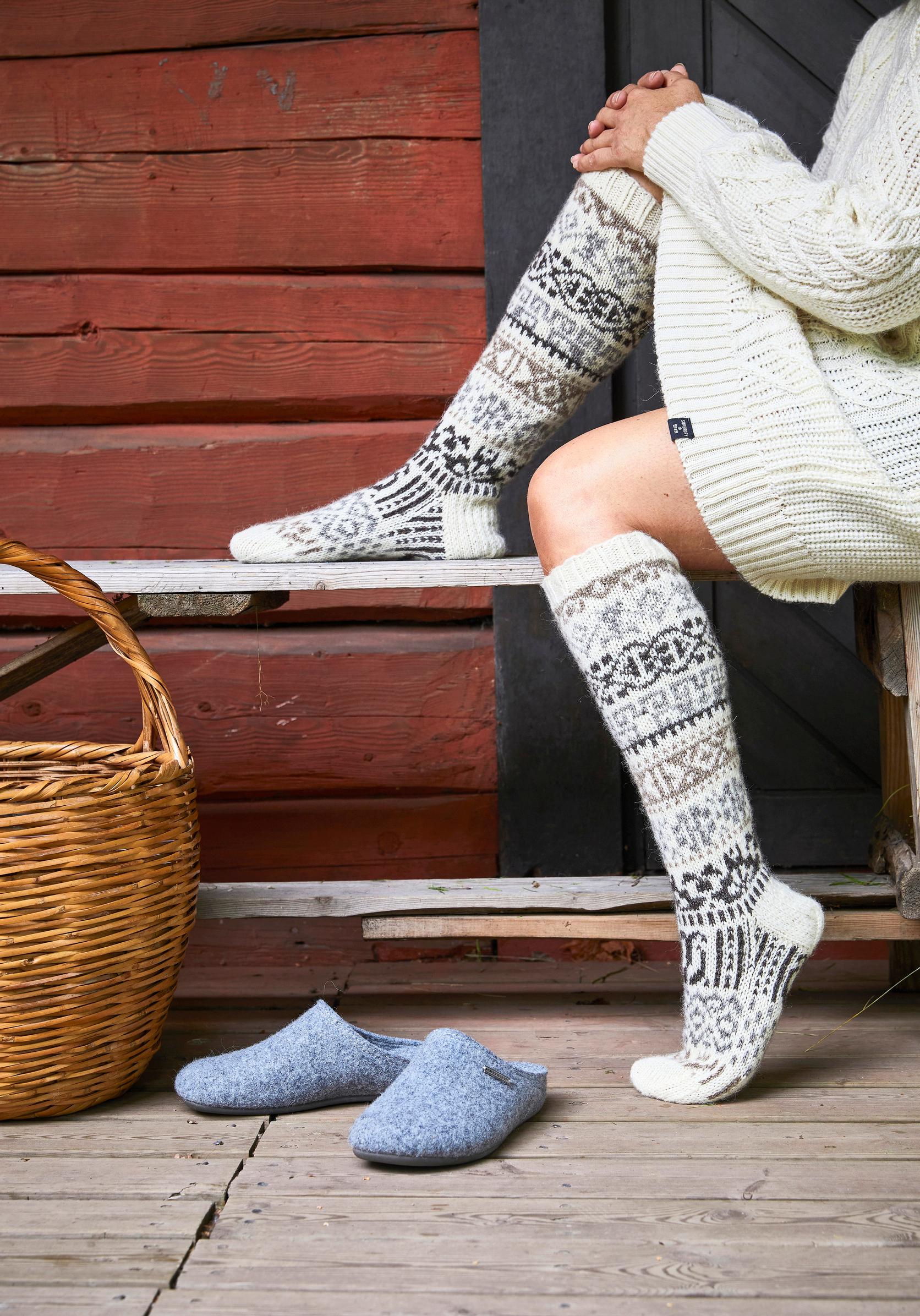 Neulo sukat Kalevalan henkeen! Merja Ojanperän Kalevalan kaikuja -villasukkia koristavat kirjoneuleraidat, joiden kuviot ovat kuin laina kansallispuvuista.