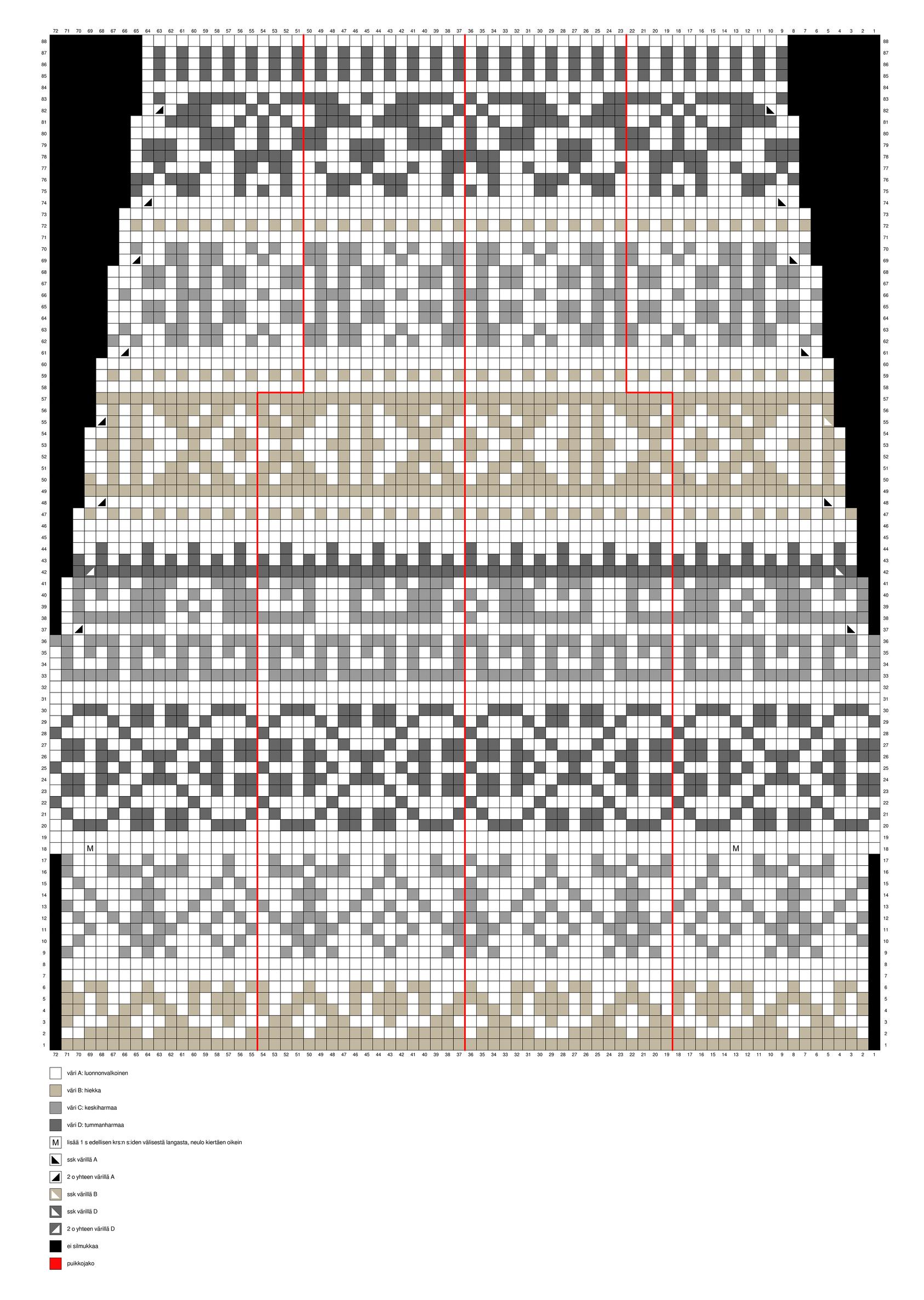 - Vuonue Pentti -lankaa (100 g / 240 m, 70% villa, 30% tencel) seuraavasti: väri A: luonnonvalkoinen 110 g, väri B: hiekka 15 g, väri C: keskiharmaa 20 g, väri D: tummanharmaa 20 g