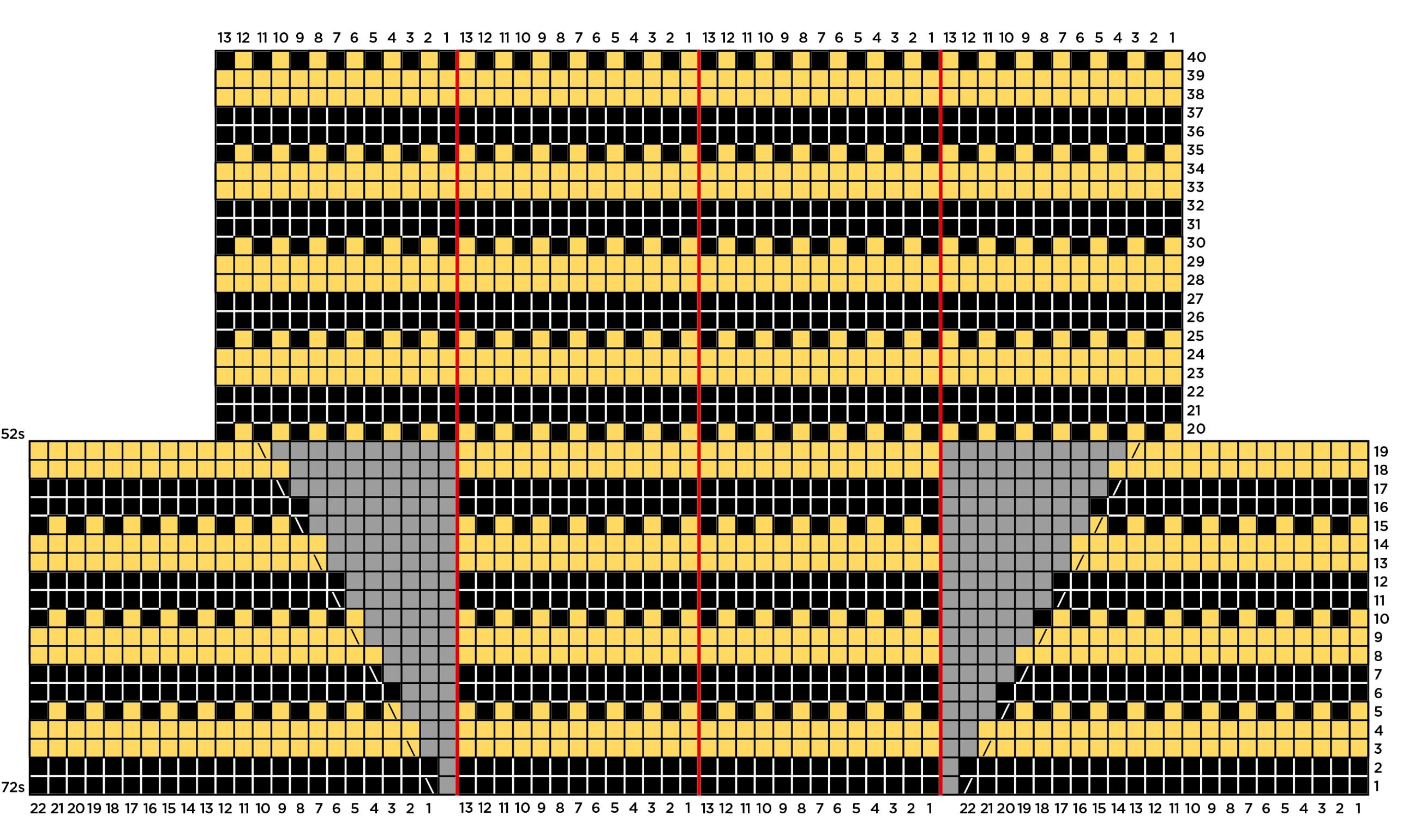 Ota keltainen lanka mukaan työhön ja aloita kirjoneule kaavion mukaan kerrokselta 2. Viimeisellä kerroksella (kerros 62) kaavioon on merkattu 1 silmukka vähemmän merkiksi siitä, että sillä kerroksella vähennetään silmukoita. Vähennä tällä kerroksella yhteensä 4 silmukkaa näin: