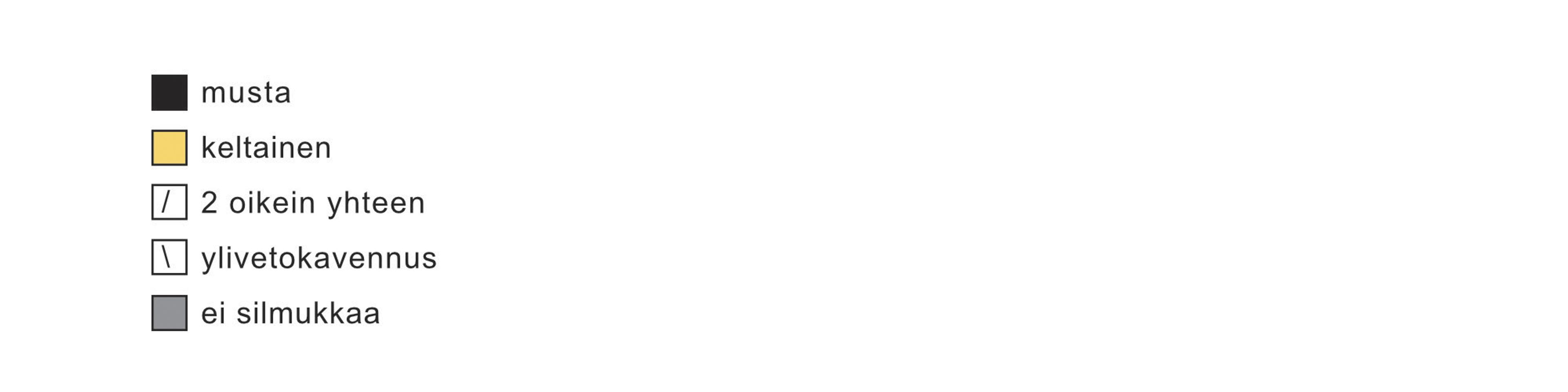 Tiheys: Suunnittelijan neuletiheys kirjoneuleessa puikoilla 2,75 = 24 s/10 cm ja 24 krs/10 cm.
