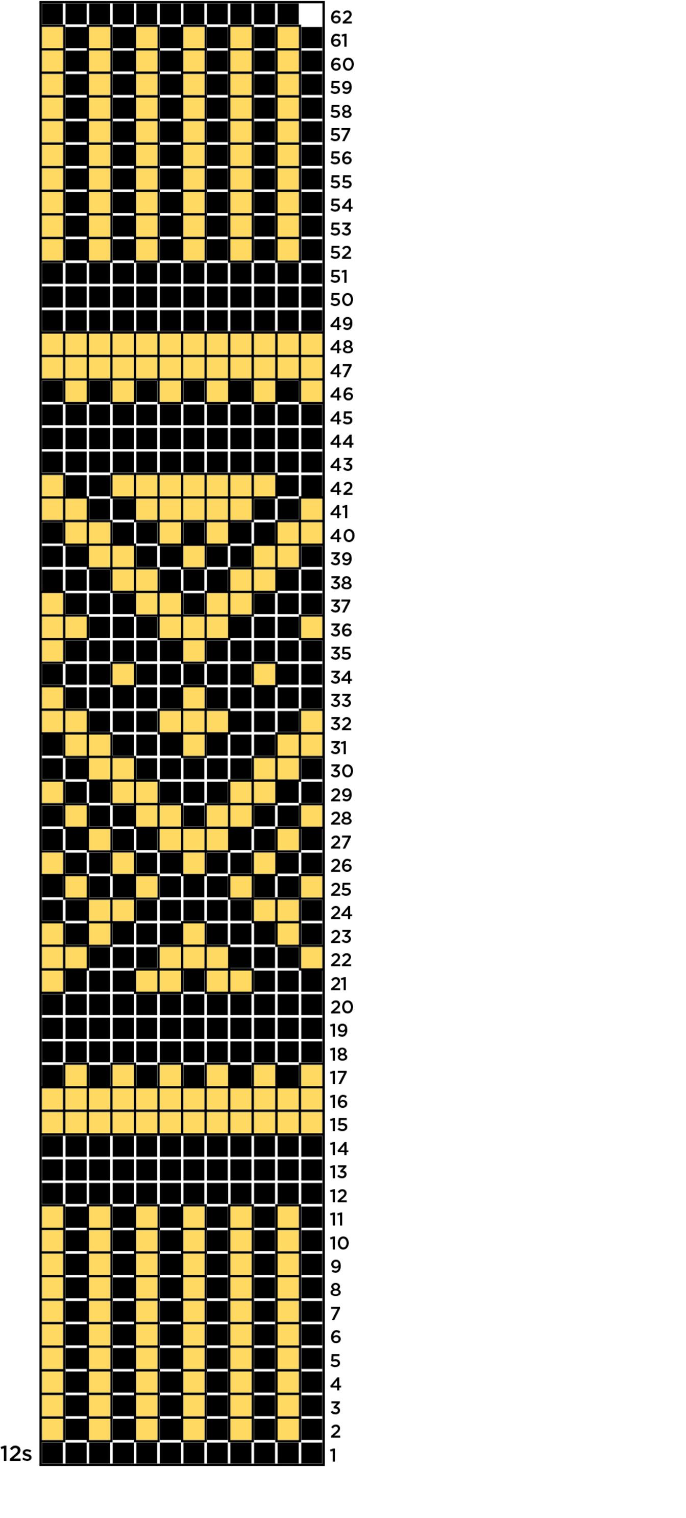 Käytä lankadominanssia eli keltaista lankaa hallitsevana, niin saat kuviot näkymään parhaiten mustalla pohjalla. Keltainen kuviolanka haetaan siis puikolle aina pohjalangan alta.