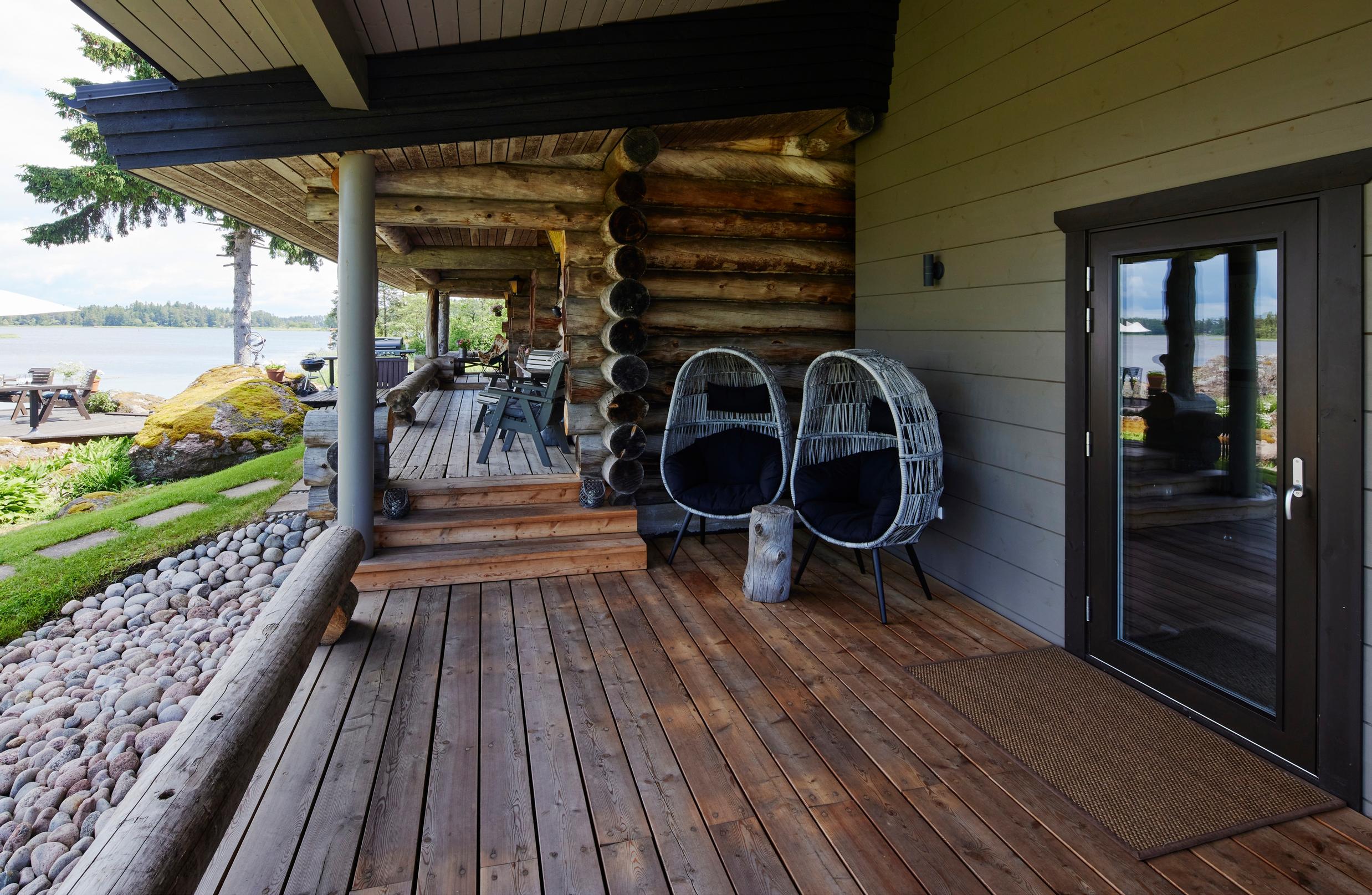Mökki: 1970-luvulla 60 neliön kokoiseksi rakennettu ja 2020-luvulla laajennettu kelohirsimökki, rantasauna, vierasmökki ja varasto.