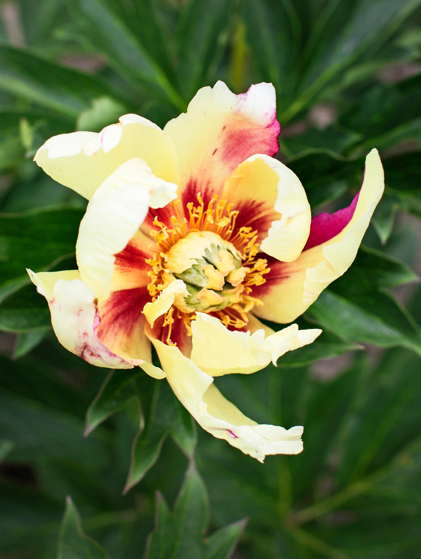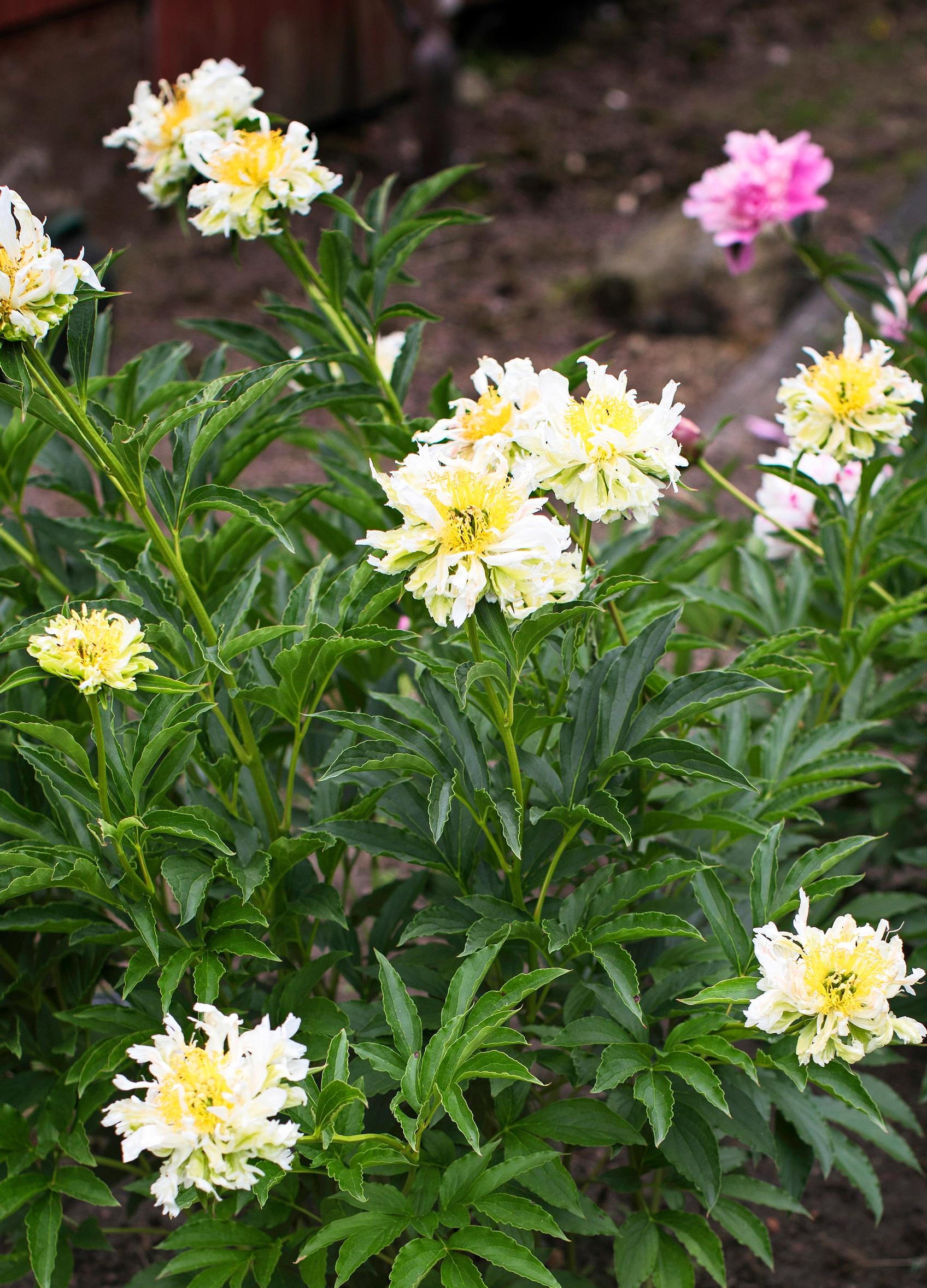 Reunemmalla itoh-hybridit – puu- ja ruohovartisen pionin risteymät – rikkovat vaaleanpunaisen ylivaltaa: pastellinen ’Hillary’, korallinvärinen ’Watermelon Wine’ sekä keltaiset ’Lollipop’ ja ’Bartzella’ kääntävät katseita erikoisella värityksellään. Puutarhan laitamille istutetut luonnonlajit, kuolanpionit, tillipionit ja ruusupionit, ovat jo ehtineet kukkia.