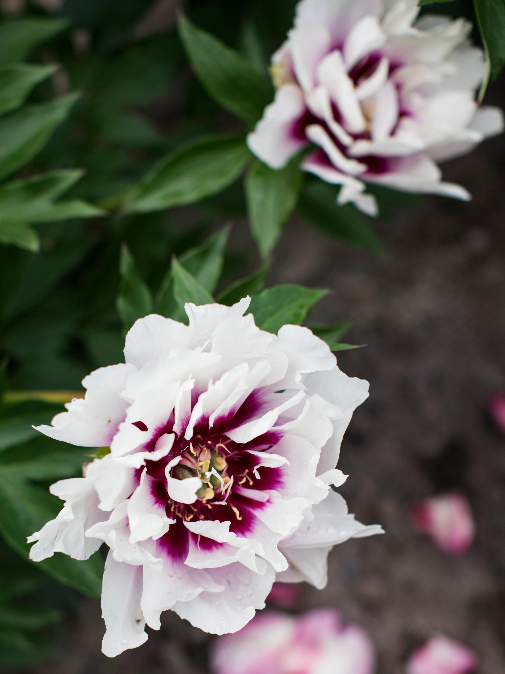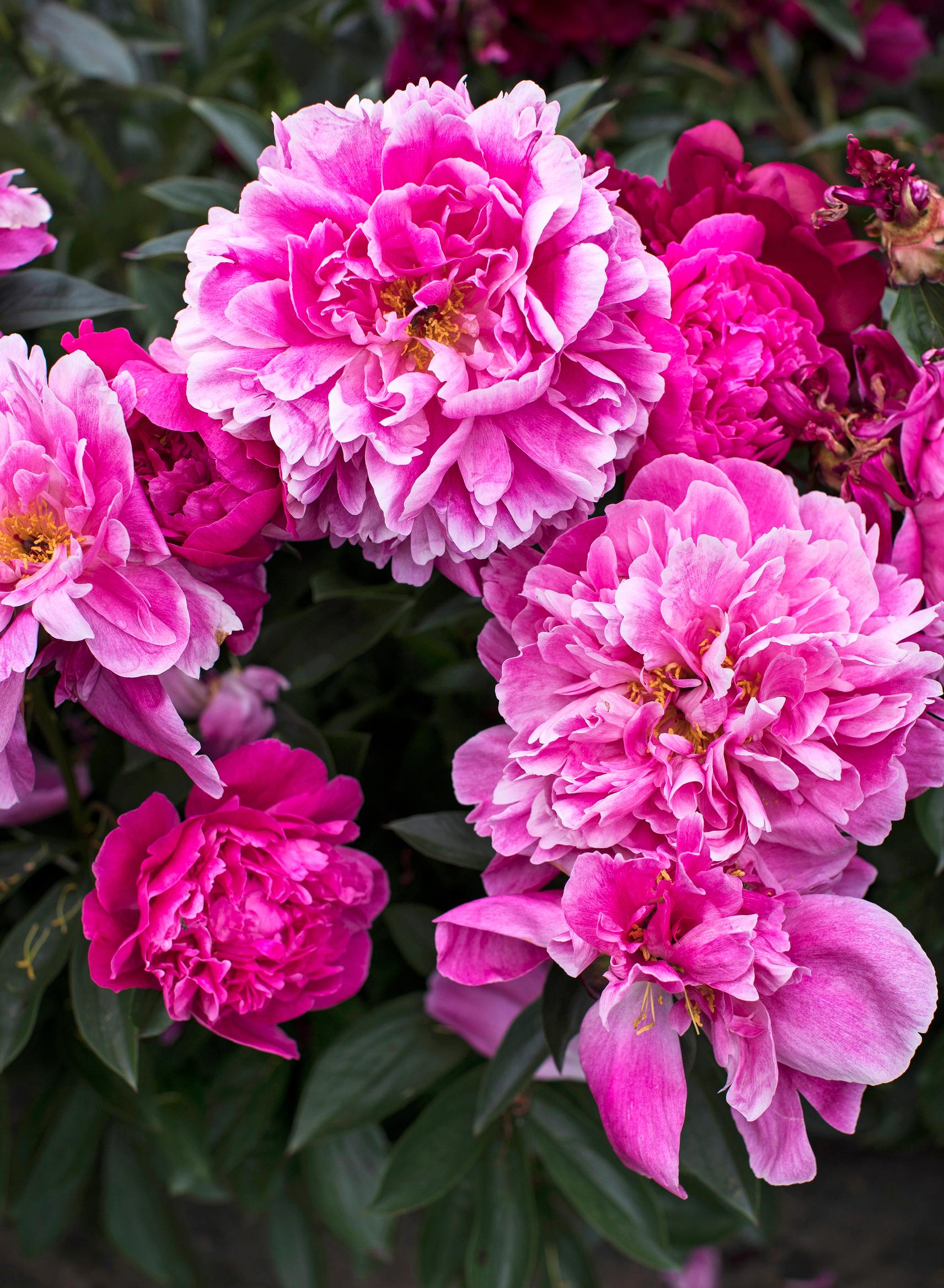 Kiinanpioni ’Eden’s Perfumen’ makea tuoksu yltää nenään jo kaukaa. Sen muhkeissa, kerrotuissa kukissa on sekä vaaleanpunaisia että valkoisia terälehtiä: mitä enemmän kukka avautuu, sitä valkoisemmaksi se muuttuu. Hybridipioni ’Henry Bockstoce’ ei ole vielä ehtinyt kasvaa kovin isoksi, mutta sen kymmenkunta kukkaa varastavat huomion syvän tummanpunaisella värillään.
