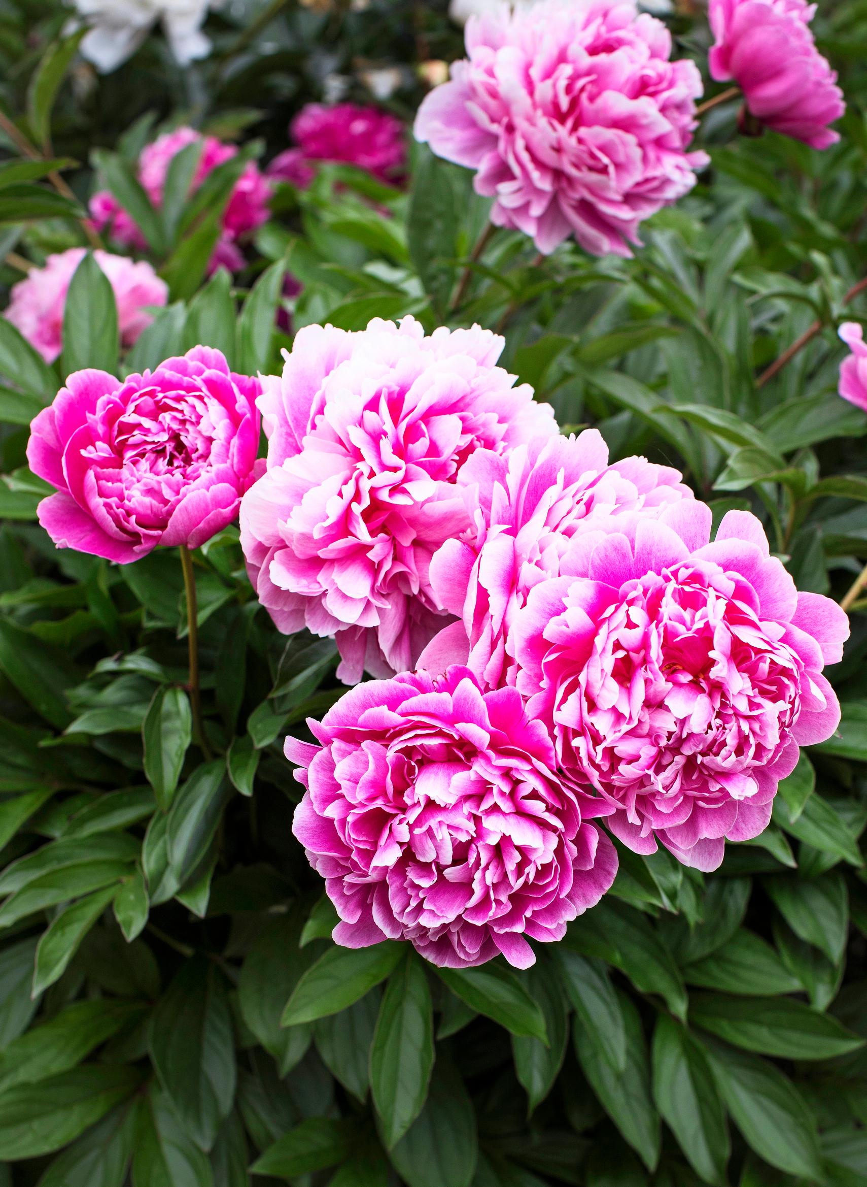 Punaisen ’Pink Jazzin’ kukat keikkuvat pitkien varsien päässä, ja valkoisen ’Candy Stripen’ terälehdissä on violetinpunaisia raitoja. Venäläisen kiinanpioni ’Beloi Parusin’ vaaleat terälehdet lepattavat kuin valkoiset purjeet.