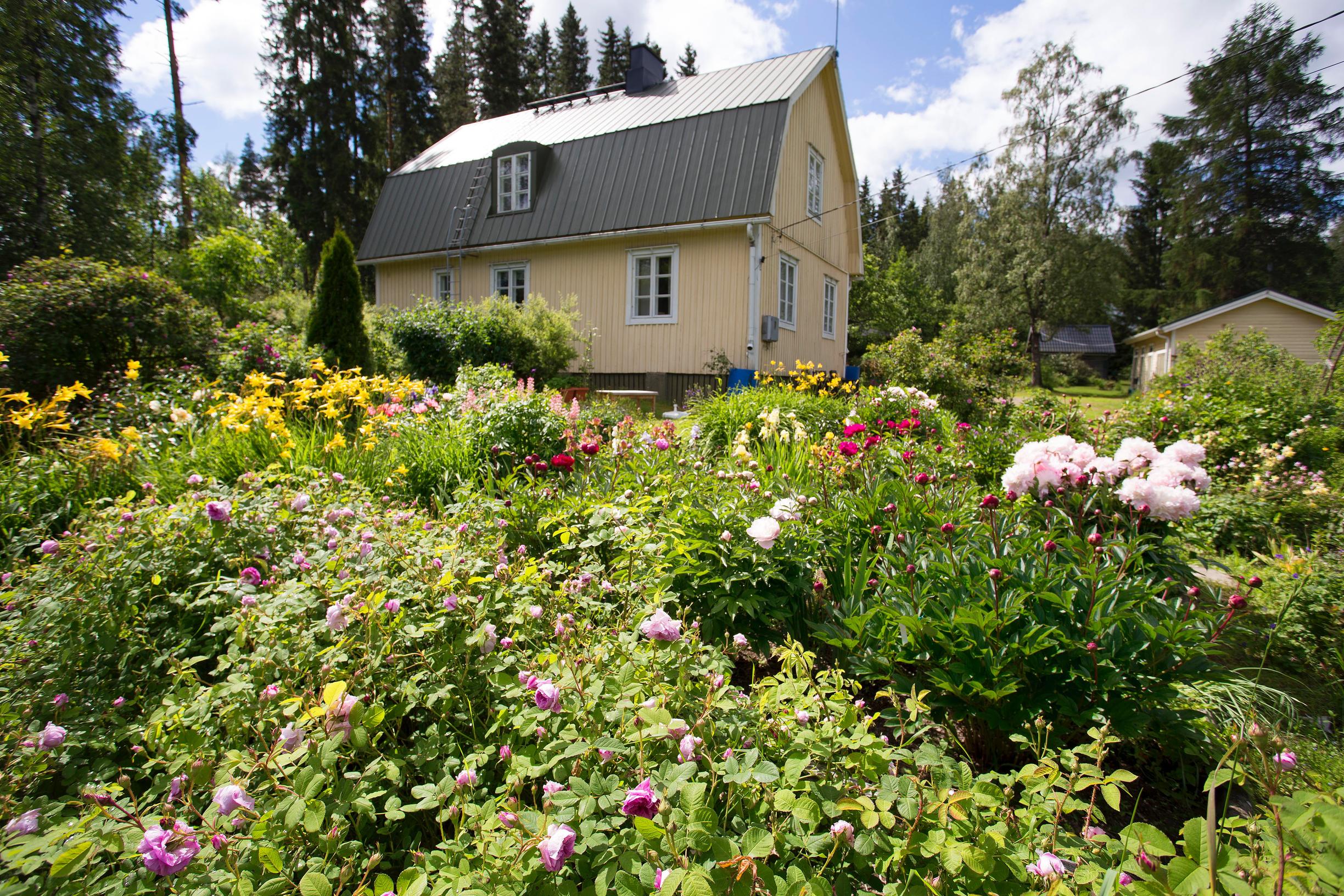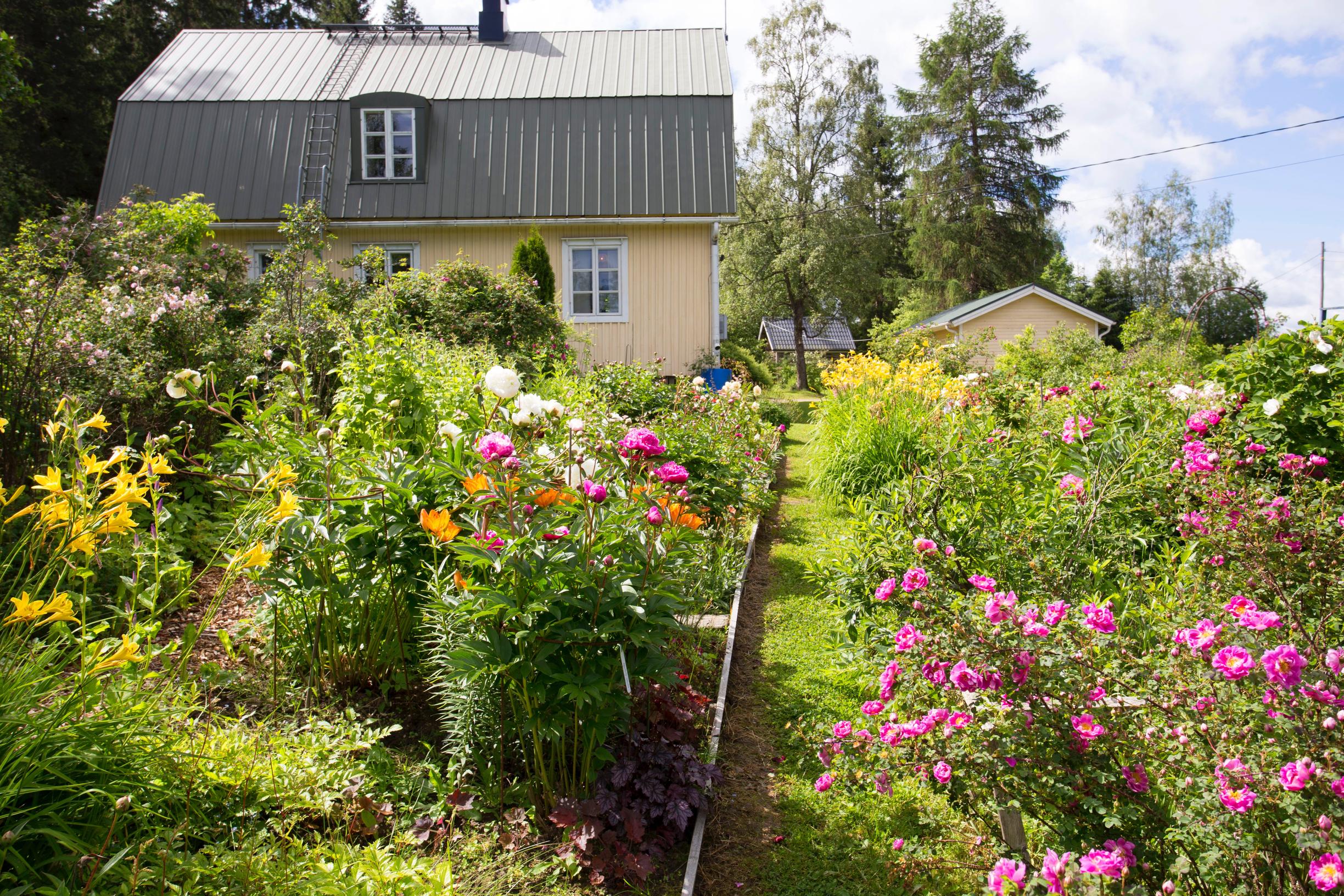 Kissanpolku ja Jäniksenpolku halkovat Liisa ja Mikko Rajalan aurinkoista kukkatarhaa. Käytävien varrella koreilee niin kurjenmiekkoja, ruusupensaita kuin muhkeita pionejakin, joita kasvaa puutarhassa yli sata sorttia.