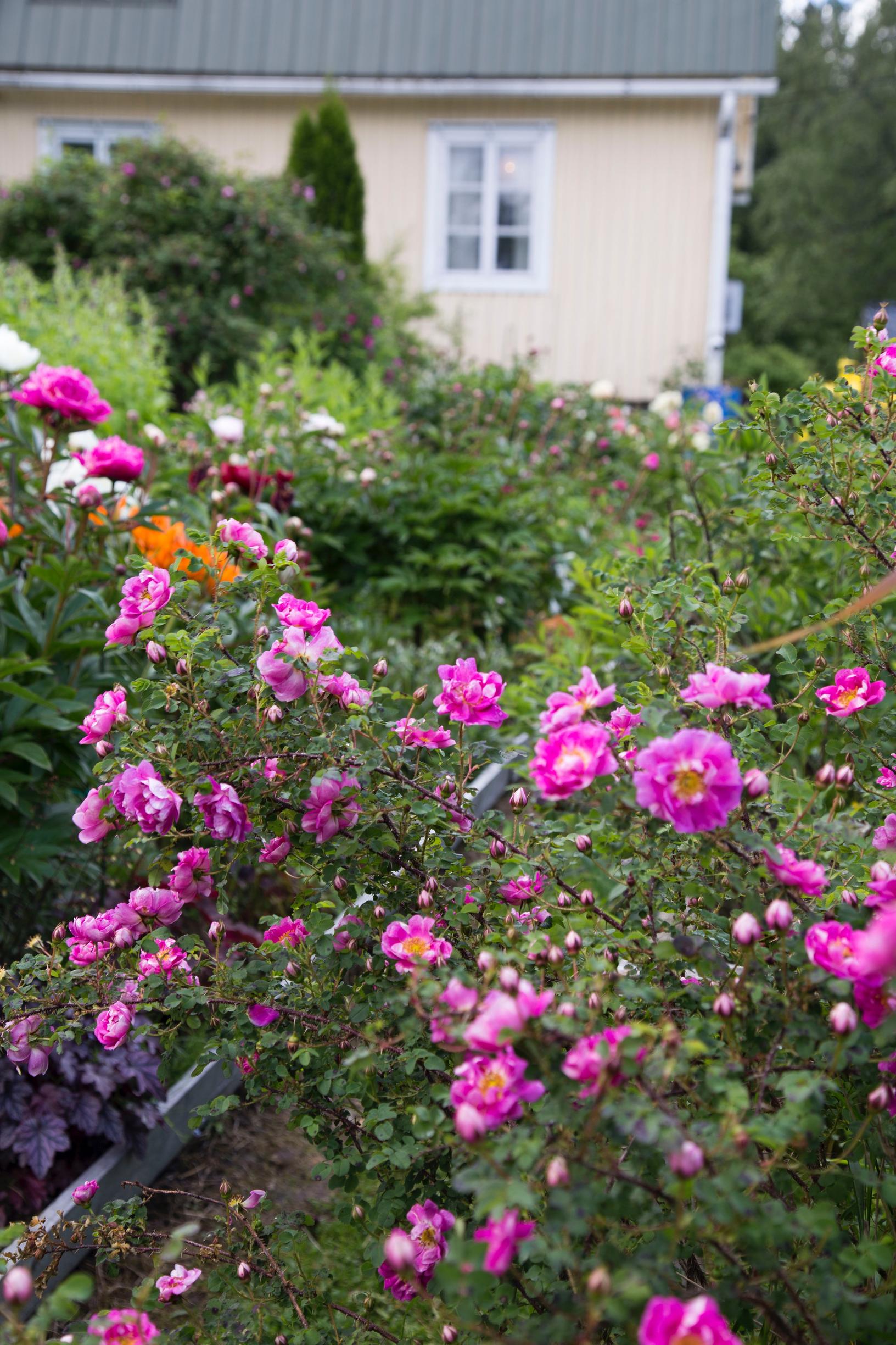 Nykyisin puutarhassa kasvaa useita damaskonruusuja ja toistasataa erilaista omajuurista pensasruusua. Punaisten ja valkoisten kukkijoiden joukossa helottavat keltaisina harisoninruusut ’Aurora’ ja ’Williams Double Yellow’, jotka ovat osoittautuneet kestäviksi ja runsaskukkaisiksi.
