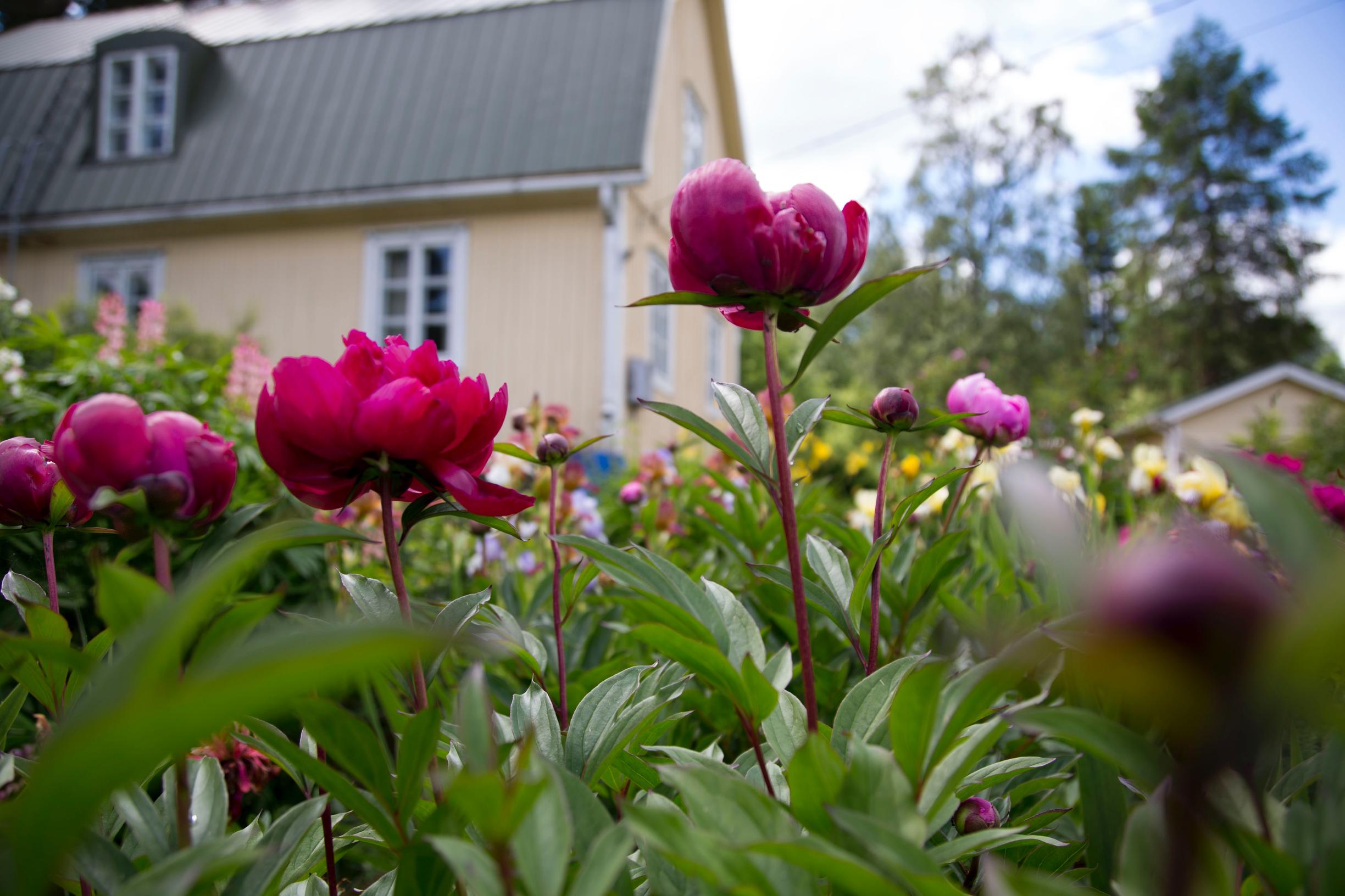 Mansardikattoiselle talolle avautuu kukkaisa näkymä. Heinäkuussa kiinanpionit loistavat hehkeimmillään, tosin erään pionin nuput pistävät esiin vaalean ja punaisen kirjavina pompuloina.