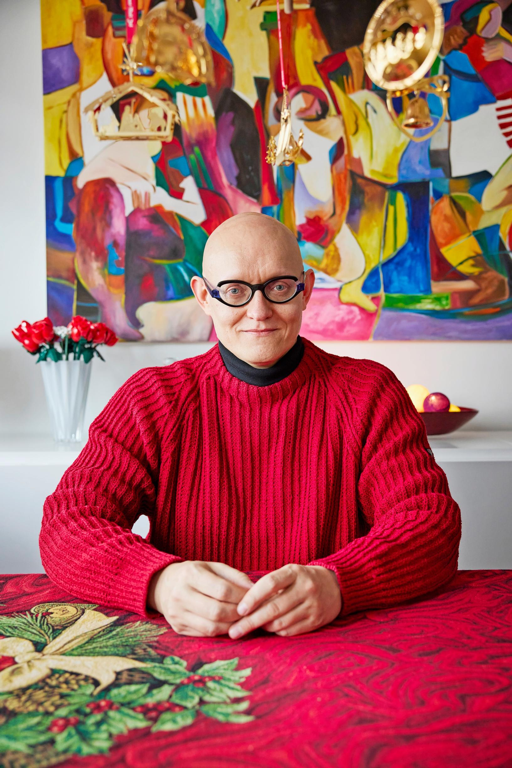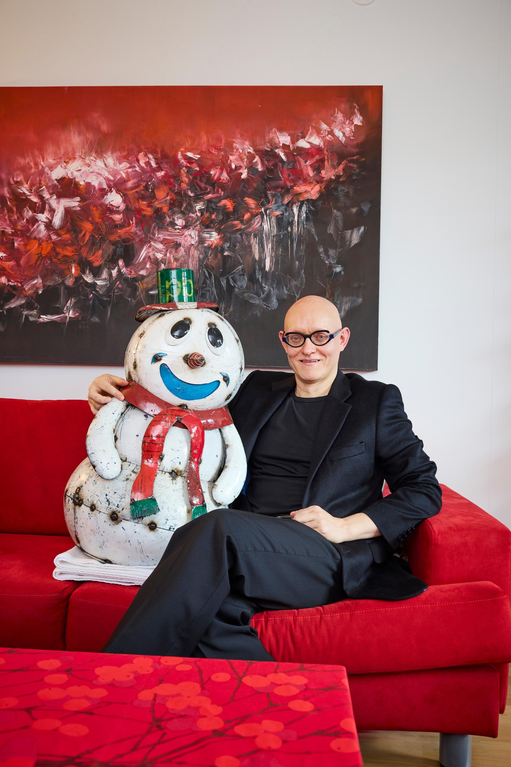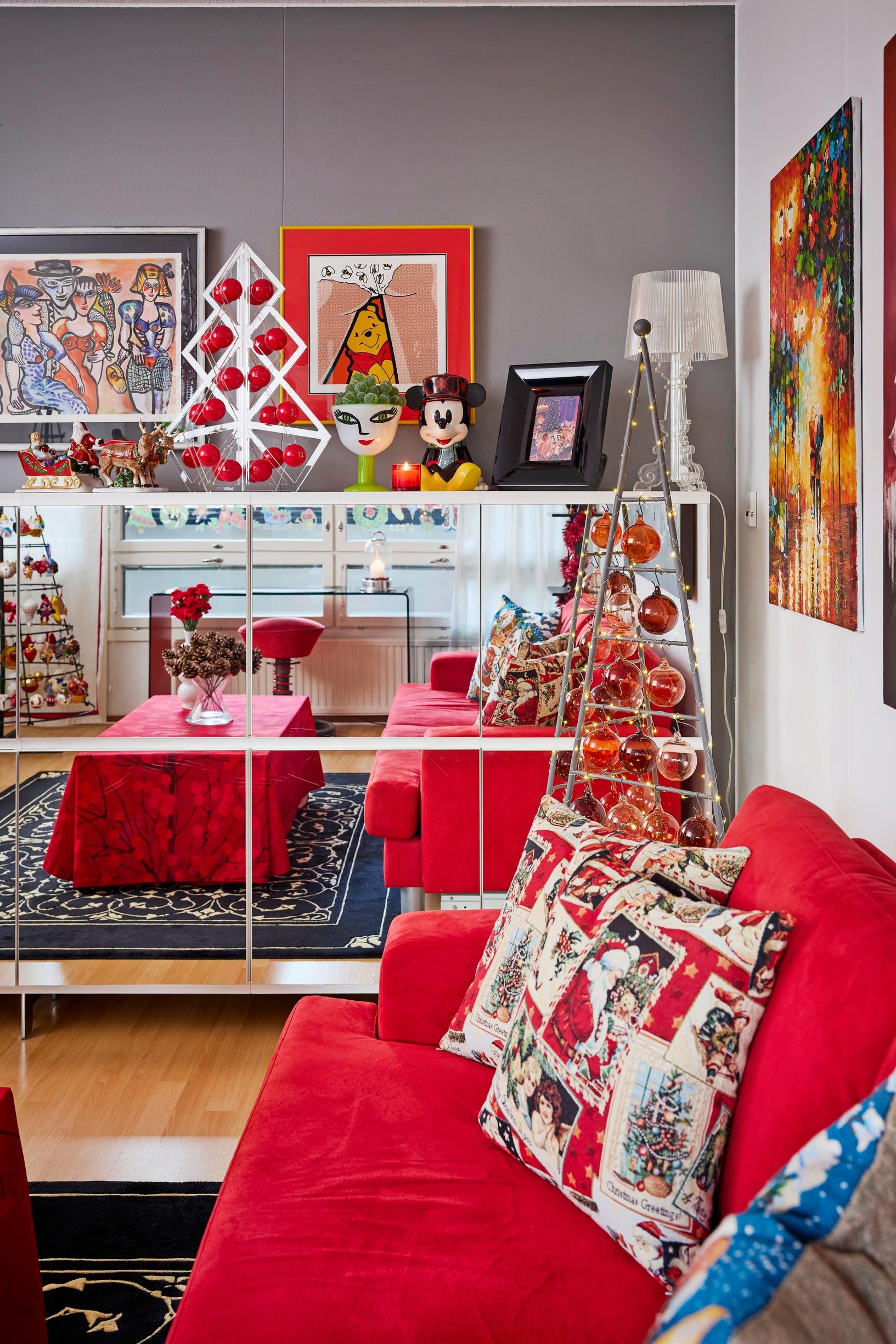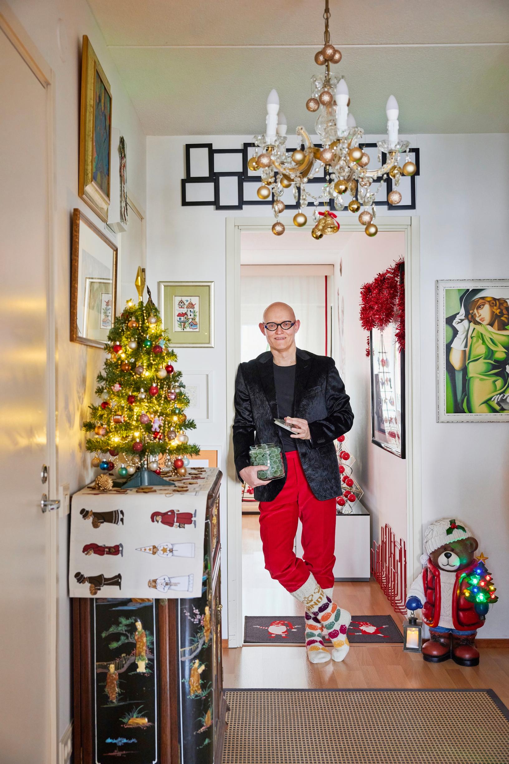 Mikko Tarkkala, 52, koristelee kotinsa punaista pursuavaksi joulumaailmaksi. Georg Jensenin kultakoristeet, Villeroy & Bochin lumiukot ja Plantagenin koristekuuset ovat esillä kerrostalokodissa puolet vuodesta. ”Joulu on minulle ystäviä, runsautta, kaupallisuutta, shoppailua ja jenkkimeininkiä.”
