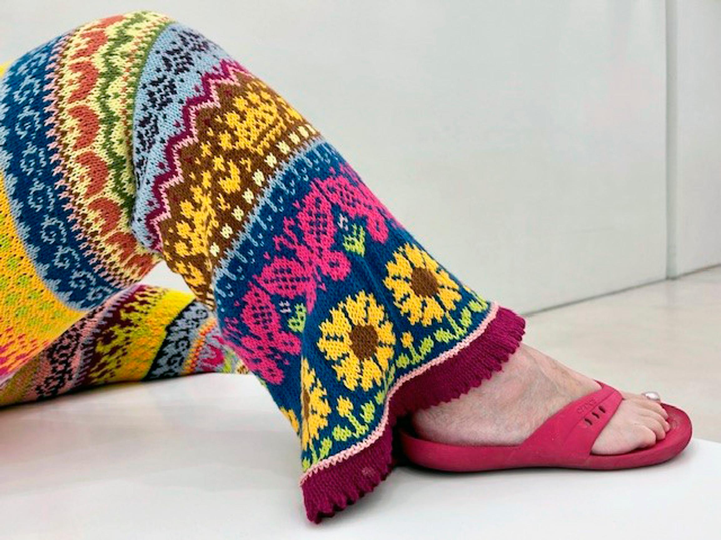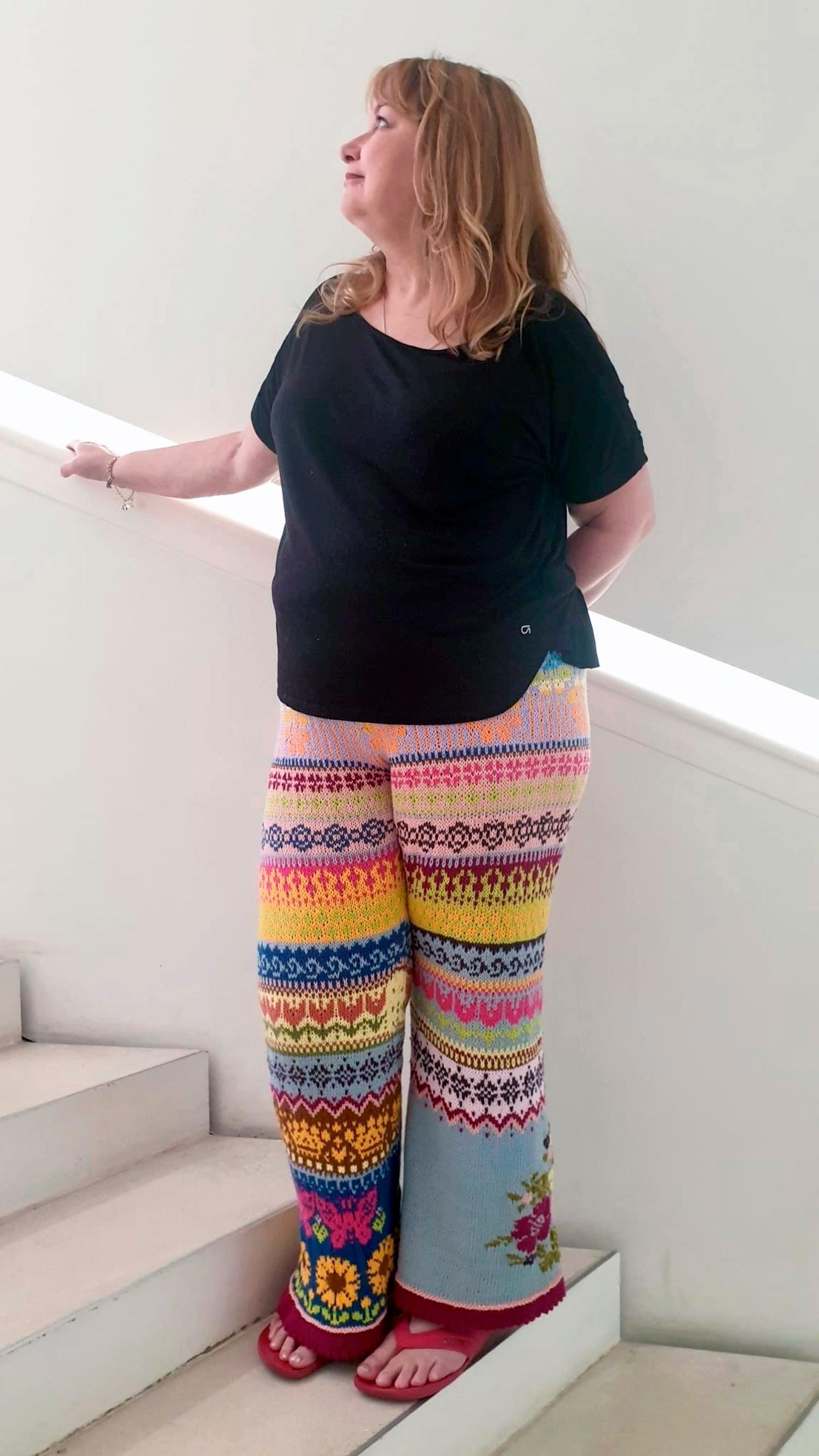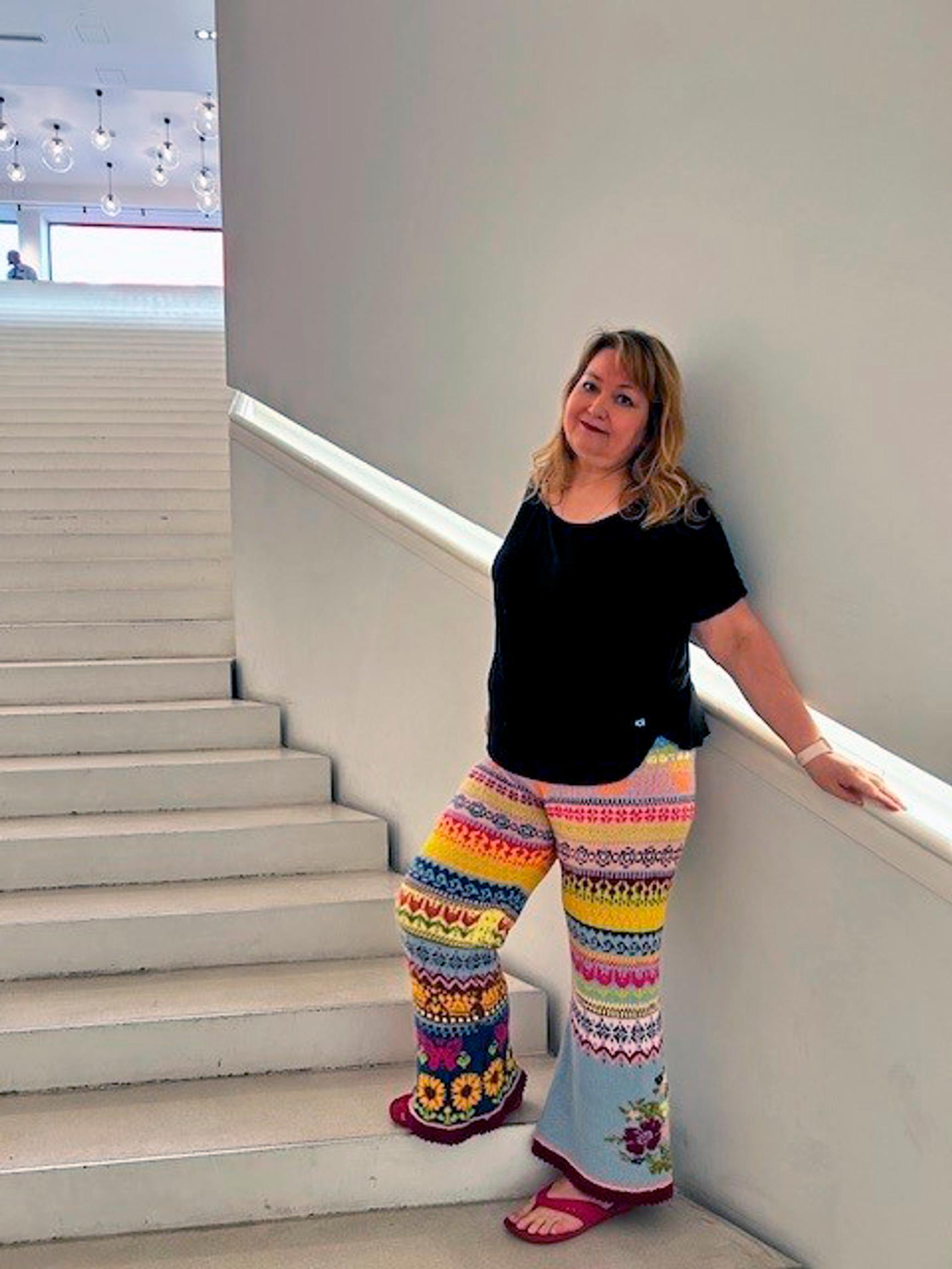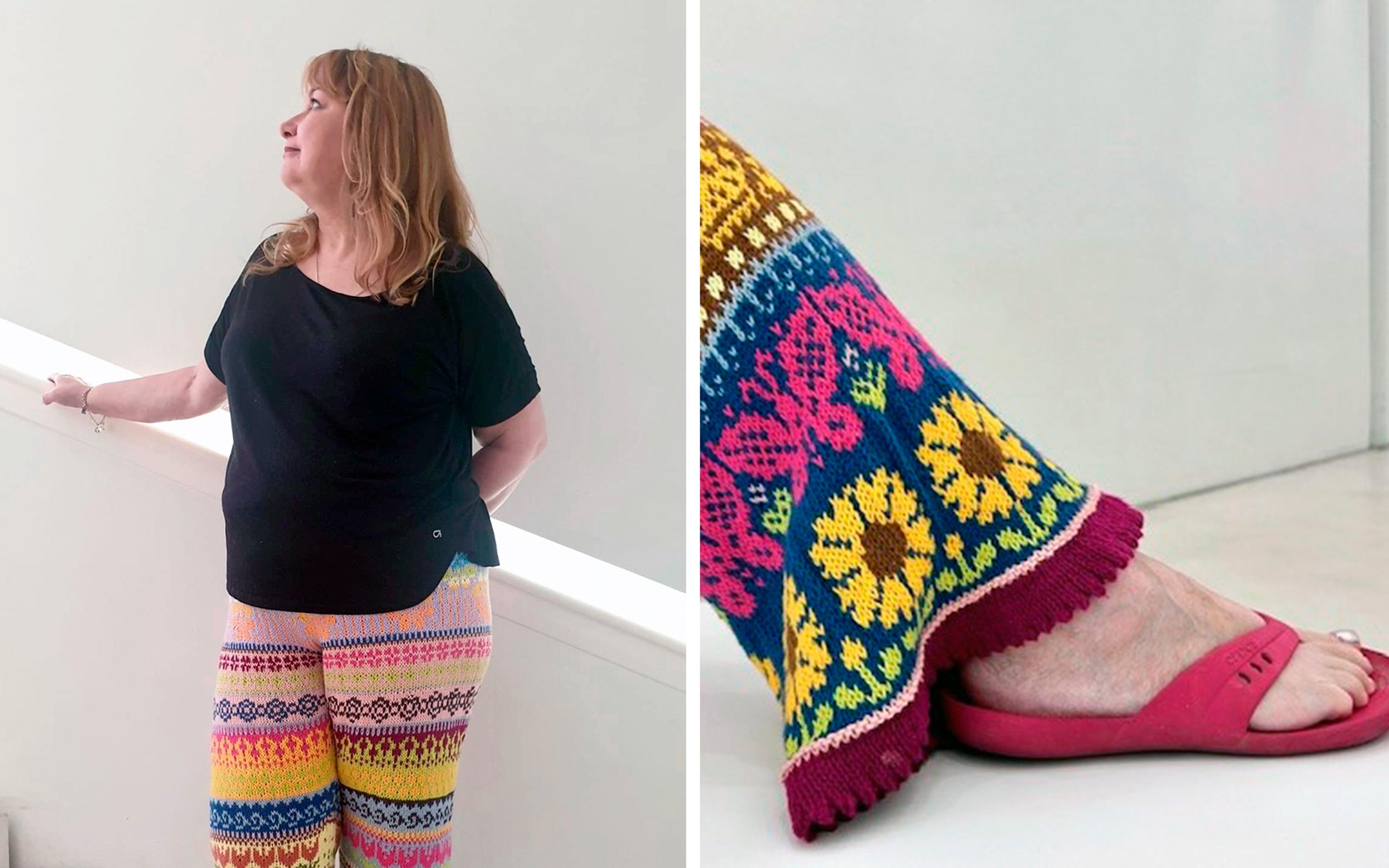 Huikea kirjoneulekimara! Minna neuloi upean värikkäät housut ja lahkeeseen viestin – ”Halusin muistuttaa Ukrainan sodasta”