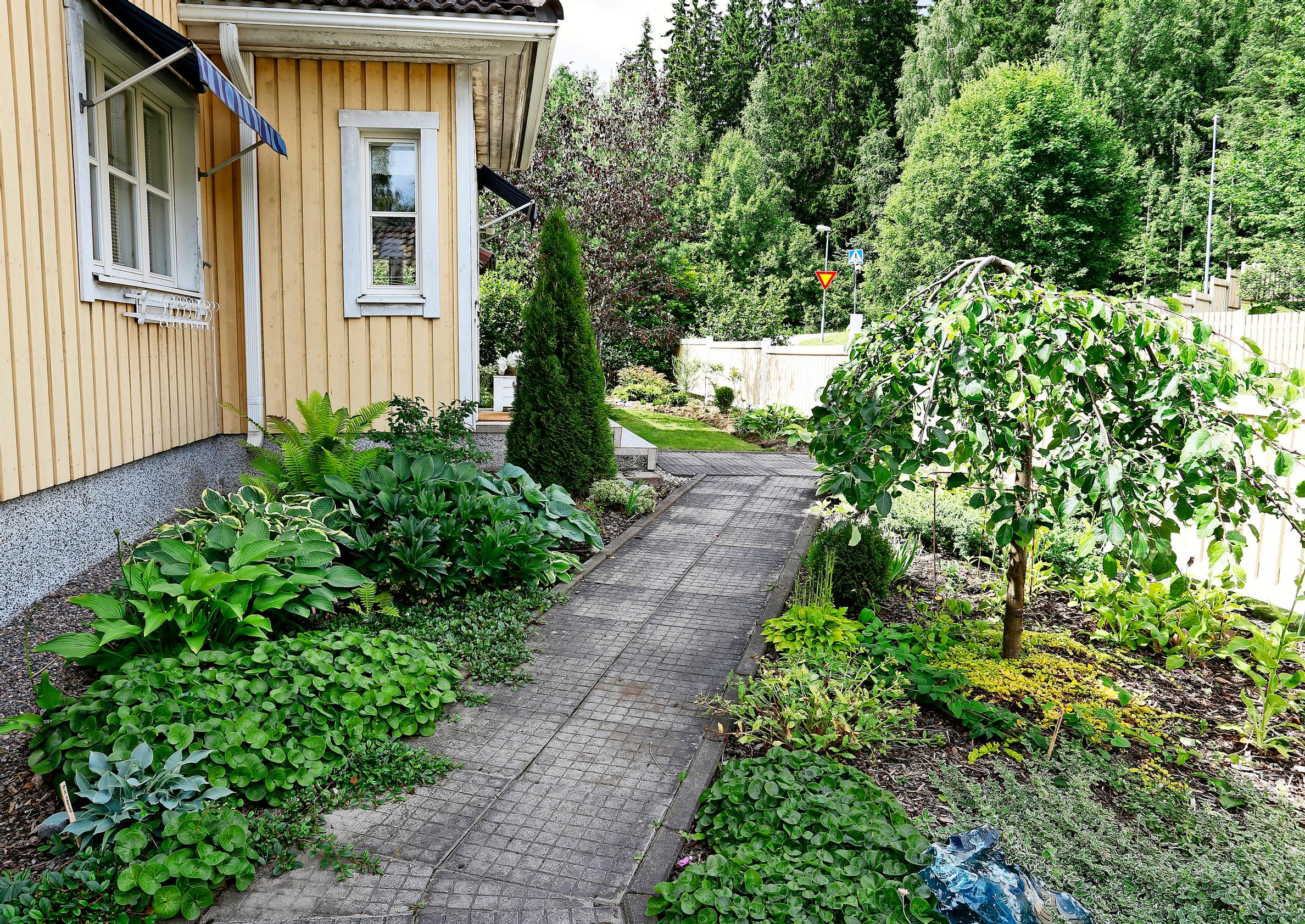 Tapasin mieheni Karin vuonna 2009 ja aloin viettää aikaani täällä. Kari kysyi, voisinko vähän auttaa puutarhan kanssa. Talo on rakennettu vuonna 1995, ja samaan aikaan tontille on tehty myös puutarhasuunnitelma, josta oli jäljellä katajaa, pensaita, pihlaja ja hieman villiintynyttä kirsikkaa. Nurmikkoa oli paljon, ja se oli aika katastrofi – voikukan valloittama ja paikoin kuivaksi kulottunut. Nurmikon kunto oli heikko siksikin, että se on alun perin perustettu liian ohuen multakerroksen päälle.