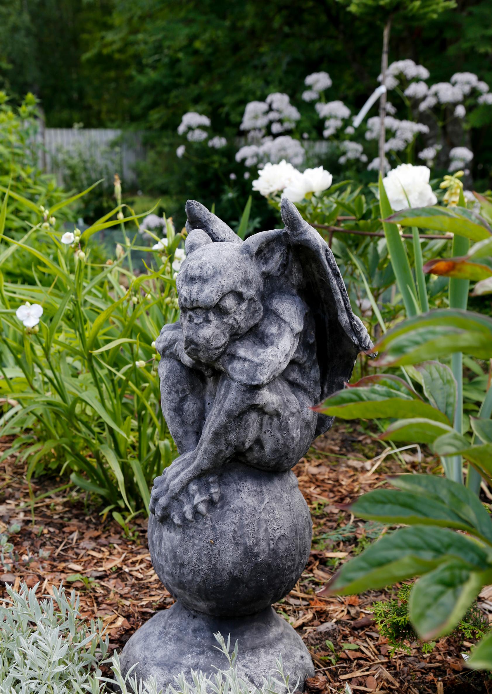 Olin kerännyt paraatipenkkiini kaikkia ihania kasveja, mutta sitten löysin puutarhapatsaan, joka pani suunnitelmat uusiksi. Vitsailin Karille puutarhamessuilla, että nyt lähdetään ostamaan puutarhapatsaita – oikeastihan en välitä oikein mistään koristeista tai puutarhatontuista. Nooh, tämä synkeän ja vähän kornin gargoilin, pienen hirviöpatsaan, nähtyäni muutin mieleni ja huomasin haluavani sen paraatipenkkiin. Sen myötä oli selvä, että istutusryhmän värimaailma menee uusiksi. Nyt siihen sopivat kylmät harmahtavat sävyt.