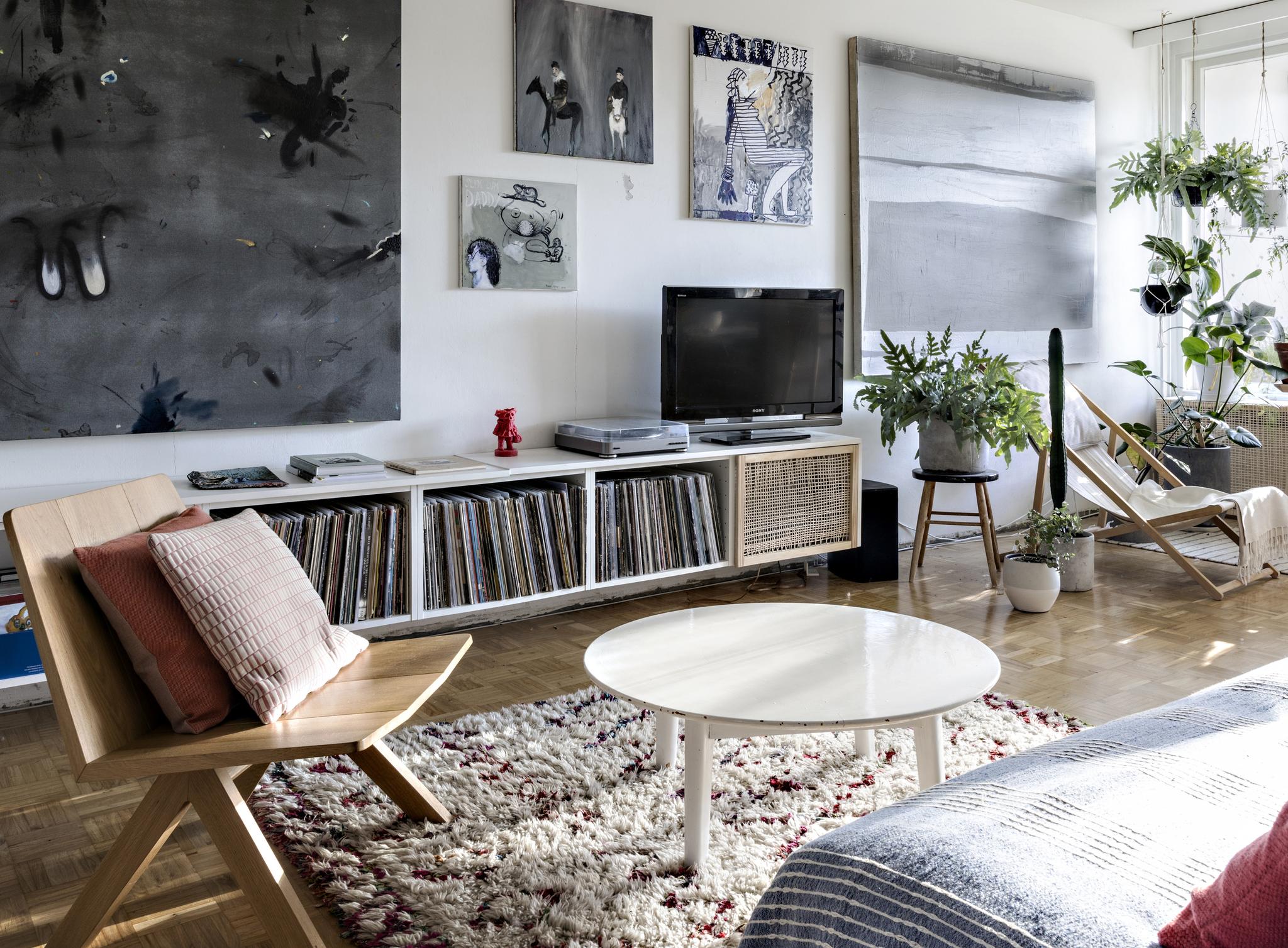 Viikon kohokohta on, kun perhe katsoo yhdessä Rillit huurussa -sarjaa sohvanrungosta ja Ikean rottinkisista sängynpäädyistä tehdyllä sohvalla. Rouhealla betoniseinällä on rento kollaasi, osin Kimin teoksista. Mintun mielestä kodissa on parasta valoisuus. Ikean aurinkotuoliin on hyvä käpertyä kutomaan ja nauttimaan auringon paisteesta. Ryijymäinen matto päätyi kotiin Mintun eräästä työprojektista. Minttu punoi patterinsuojuksen rottingista puukehikon ympärille. Se on kiinni saranoilla, jotta taustan pääsee siivoamaan. Kun viherkasvit asettaa amppeleihin, tasoille tai pyörien päälle vaikka tarjoiluvaunuun, ne eivät haittaa lattioiden siivousta.Kodin värimaailma sai alkunsa, kun Minttu ihastui ranskalaismuotoilija Inga Sempén sinisiin kaakeleihin.