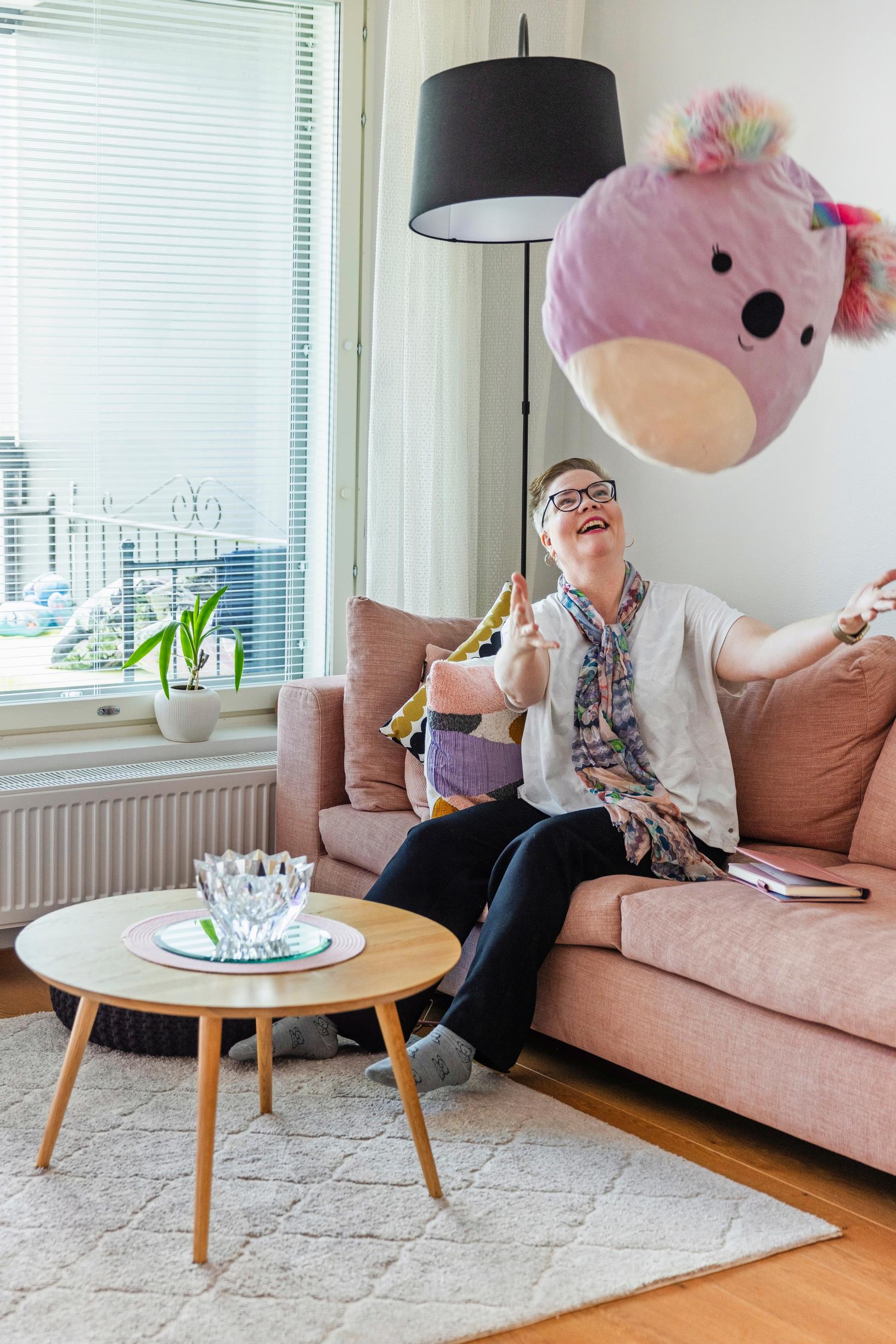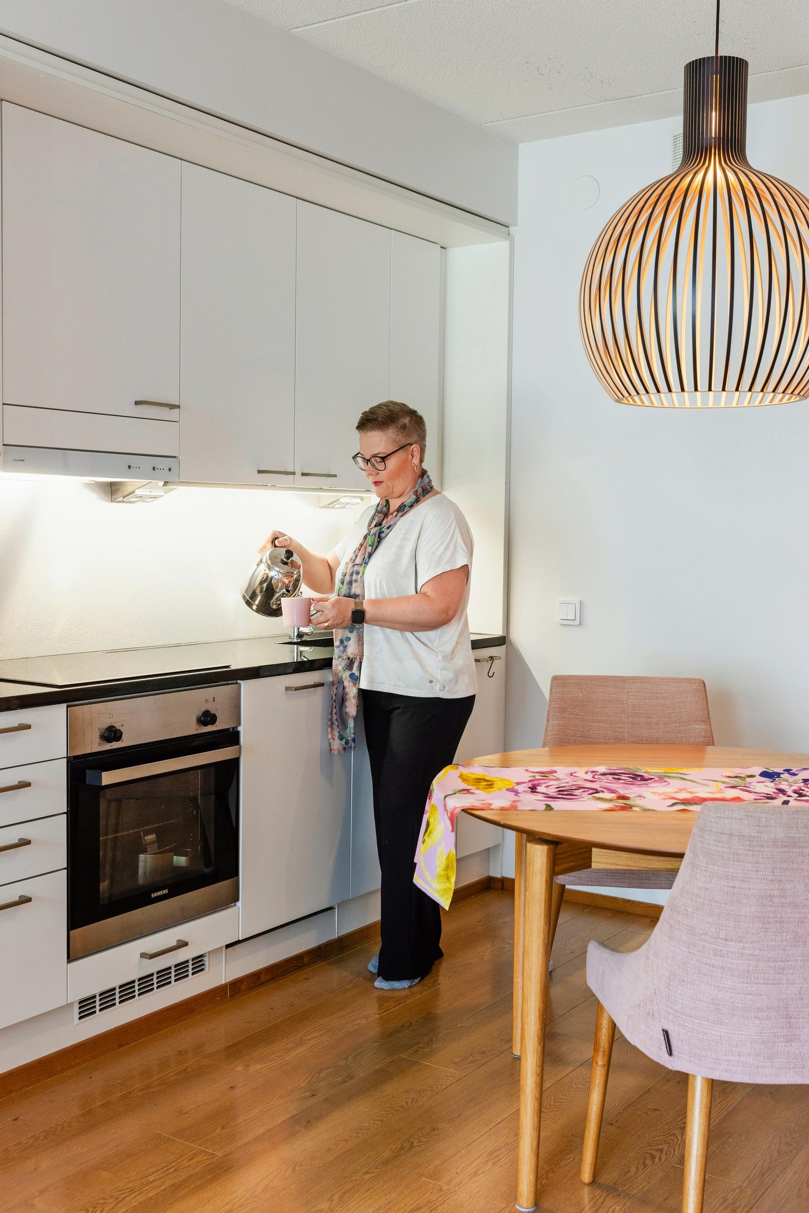 Pienempään kotiin muuttaminen on ollut myös ekologinen arvovalinta ja taloudellisesti järkevää. Käytän rahaa mieluummin palveluihin ja matkailuun kuin tavaraan. Tilannetta pitää miettiä uudelleen, jos saamme joskus esimerkiksi lapsenlapsia ja sen myötä tilantarve kasvaa. Ajattelen, että kotia pitää voida vaihtaa elämäntilanteen mukaiseksi, ja nykyinen kotimme onkin viides omistusasuntoni 30 vuoden aikana.