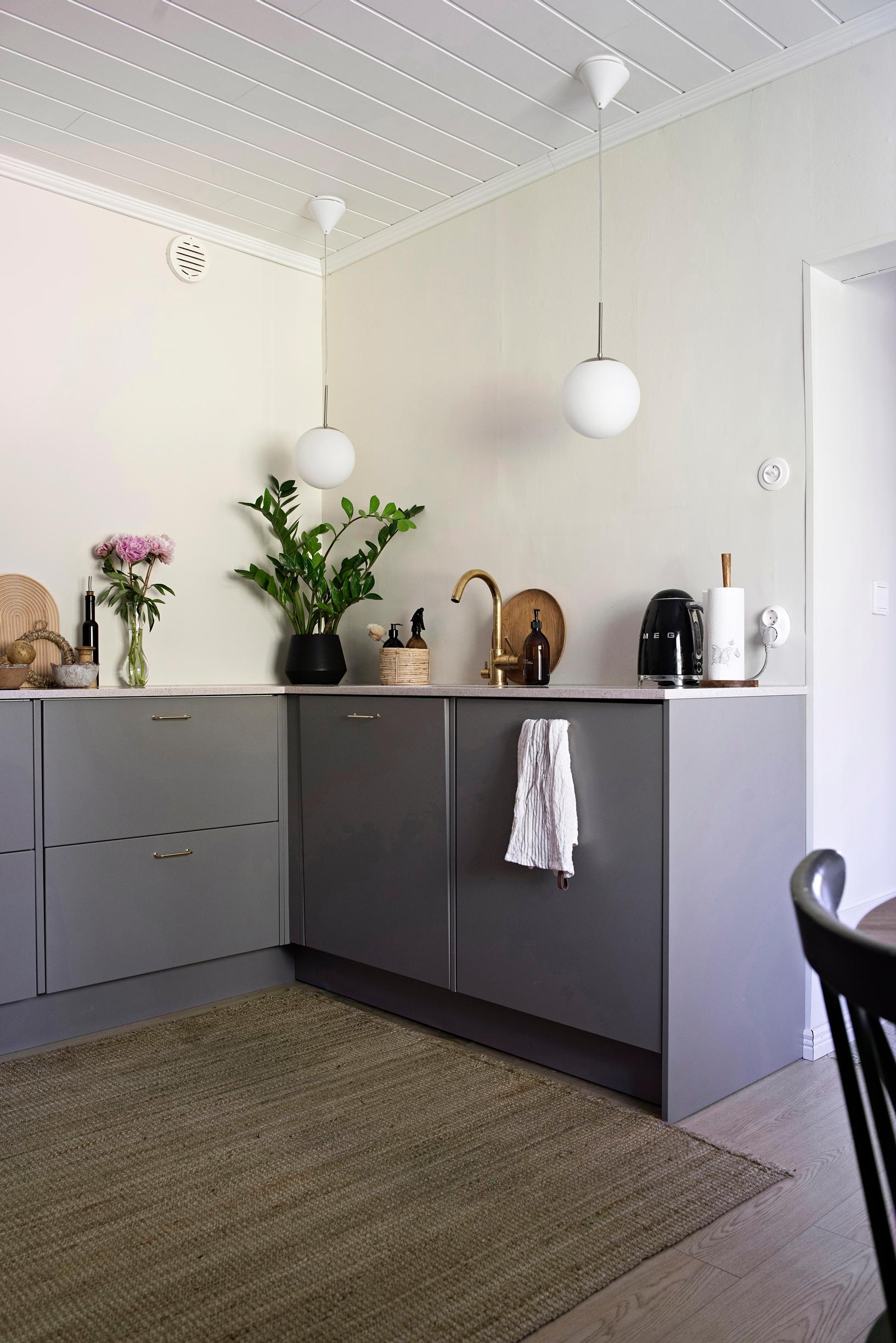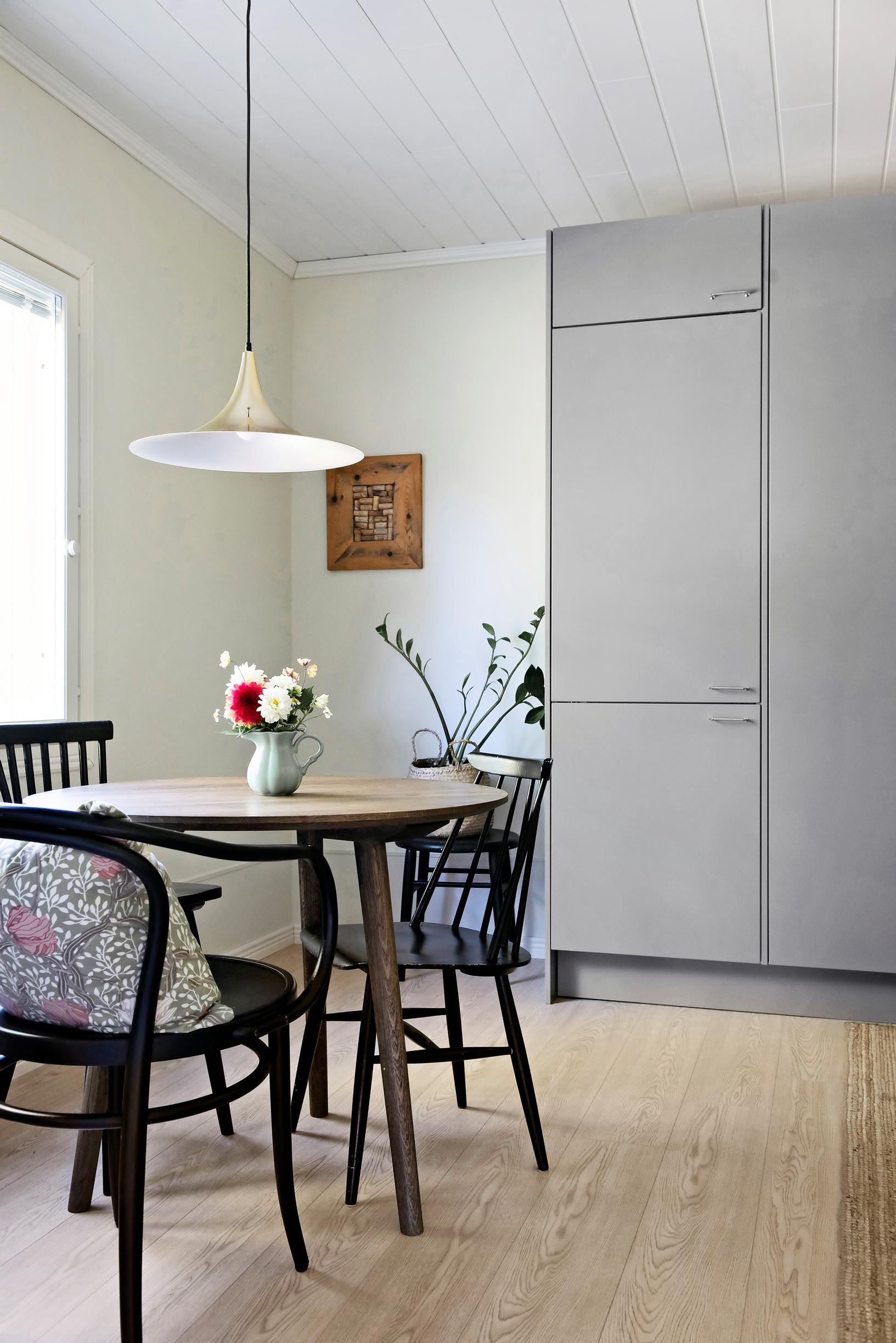 – Ennen keittiössä oli ovia, kaappeja ja tasoja siellä sun täällä. On parempi, että on paljon laskutilaa ja korkea kaapisto, joiden ansiosta pystyimme jättämään yläkaapit pois. Säilytystilaa on nyt niin paljon, että osa kaapeista on vielä tyhjänä, Mirella kertoo.