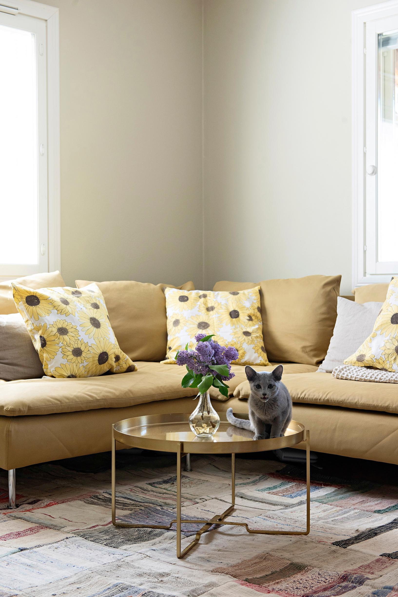– Kodin yleisvärinä on Tikkurilan Merino. Se on mielenkiintoinen väri, joka näyttää välillä vaalealta, toisinaan harmaalta. Joskus se jopa vihertää. Tummin sävy on olohuoneessa oleva Uni, Mirella analysoi.