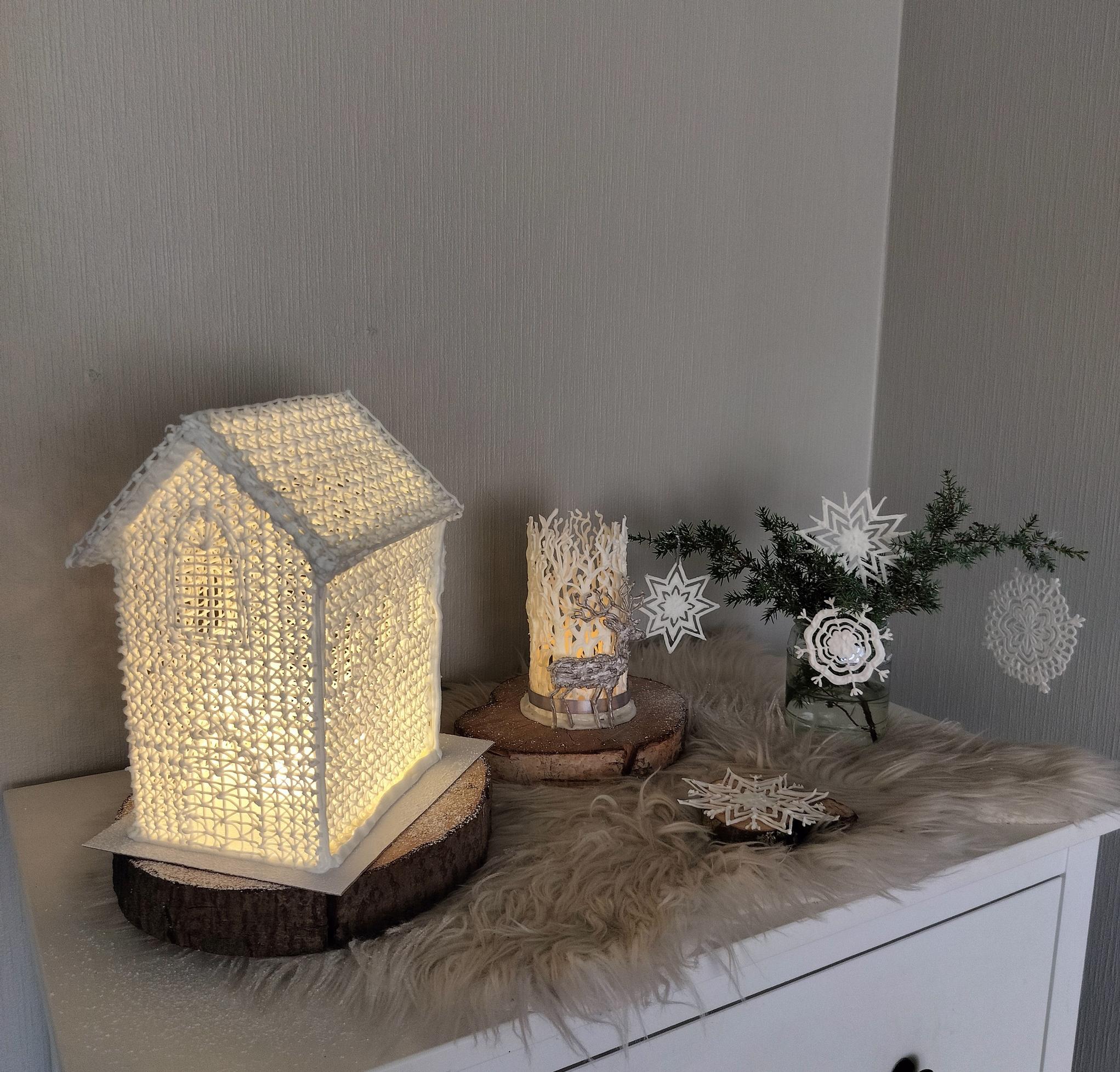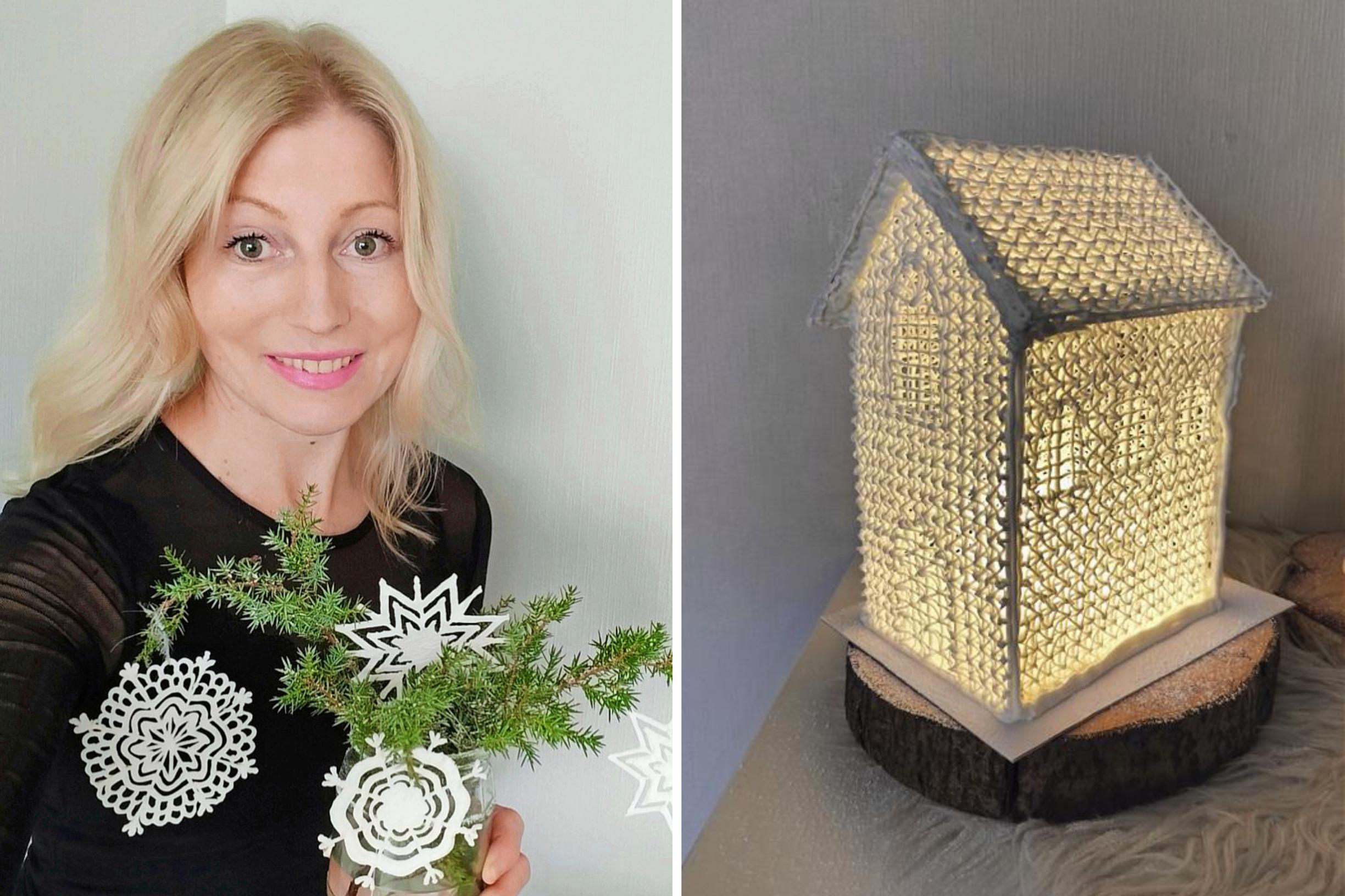 Tein ensimmäisen lyhdyn korona-aikaan, kun sairastuin ja olin kotona eristyksissä. Oloni oli kuitenkin virkeä ja kaipasin tekemistä. Joulu lähestyi ja aloin miettiä, voisinko tehdä pikeeristä jotain kaunista. Näin netissä kuvan pikeeritalosta ja aloin piirtää sen kaavoja viivoittimen avulla leivinpaperille. Yllätyksekseni talo onnistui ensi yrittämällä! Sen jälkeen olen tehnyt vielä kaksi taloa. Tänä syksynä tein talolyhdyn lisäksi poron mallisen lyhdyn.