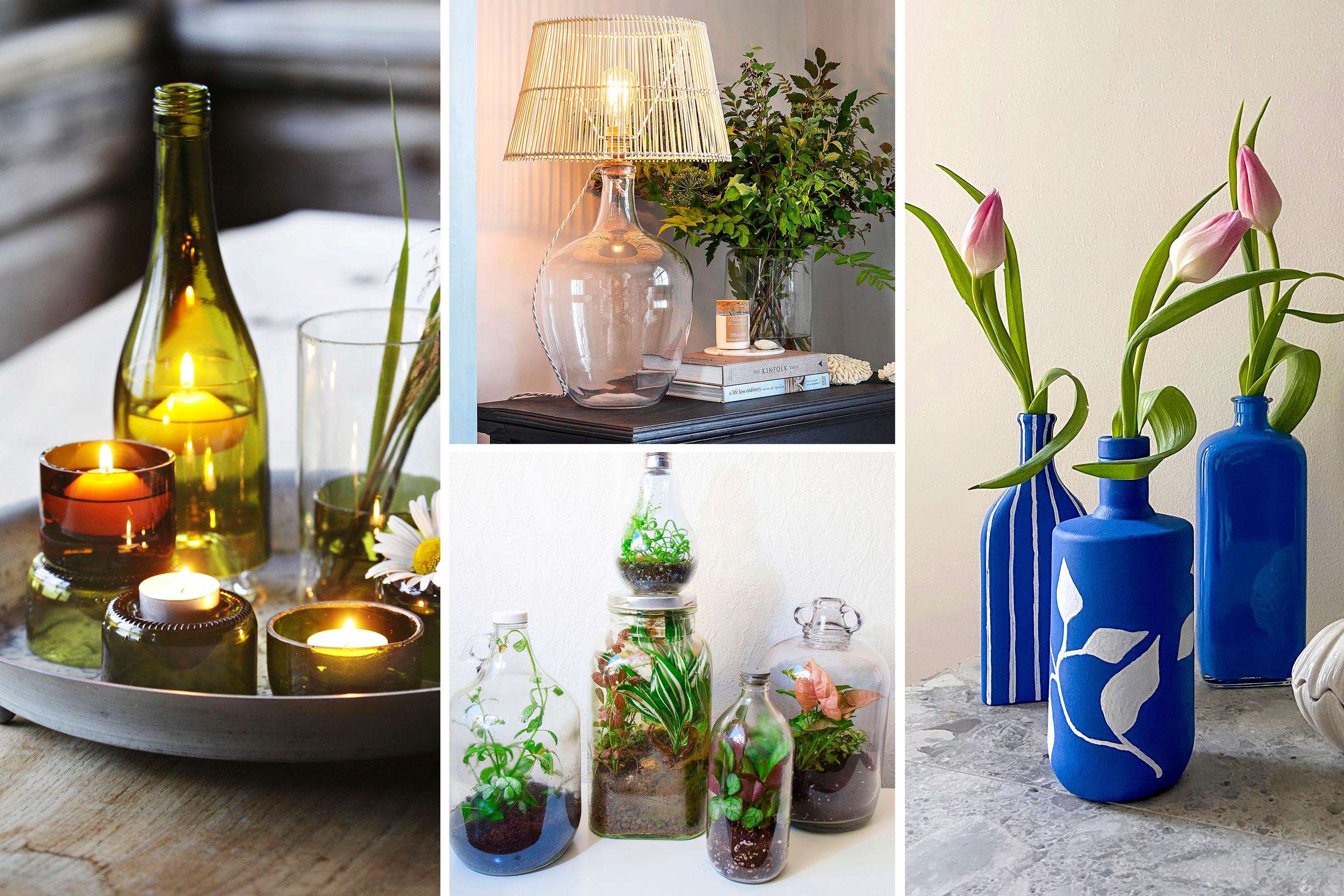 Pantilliset lasipullot kannattaa palauttaa kauppaan, mutta mitä tehdä lopuille? Vanhoista pulloista syntyy esimerkiksi valaisin, maljakko tai minipuutarha. Kurkkaa ideat!