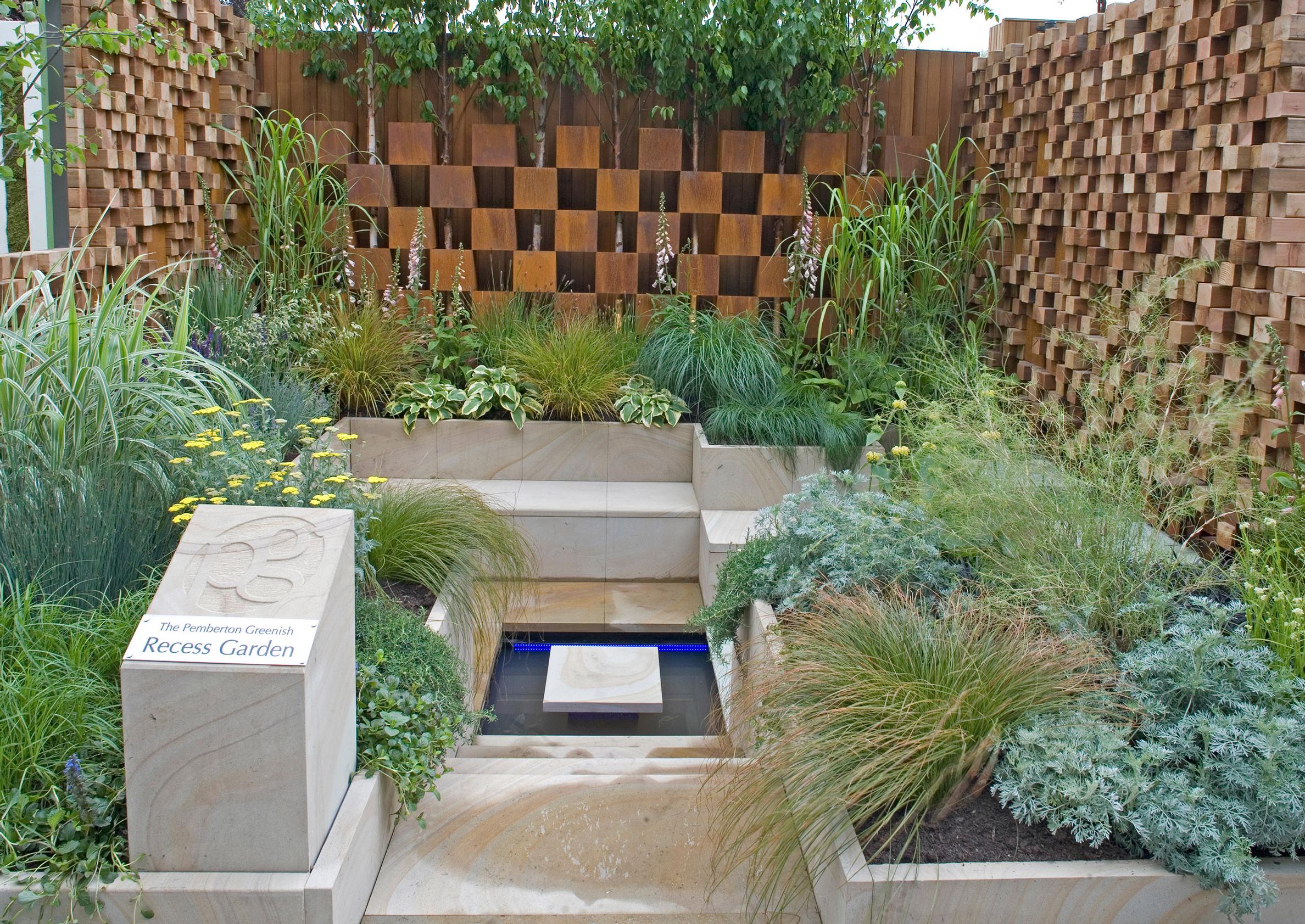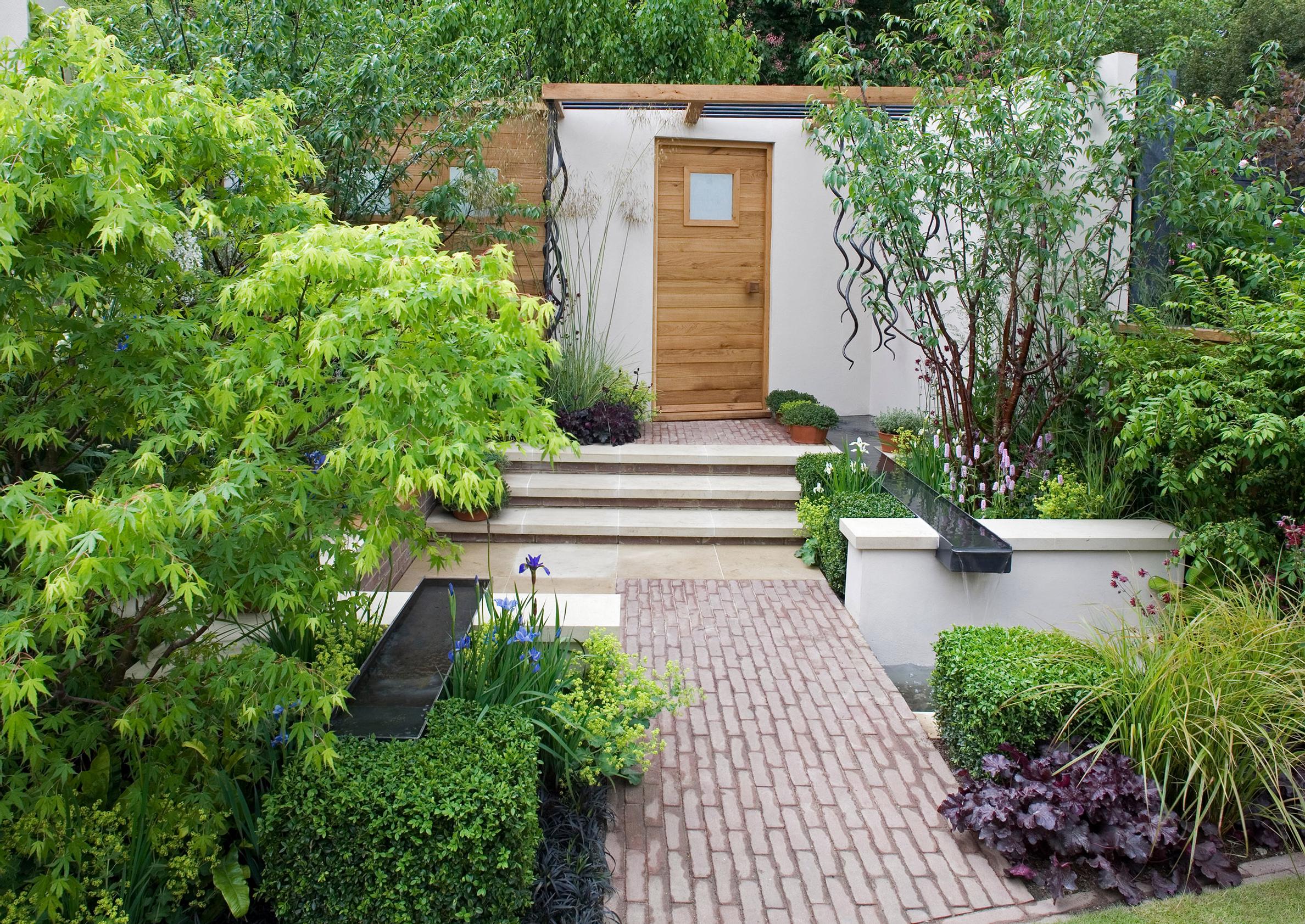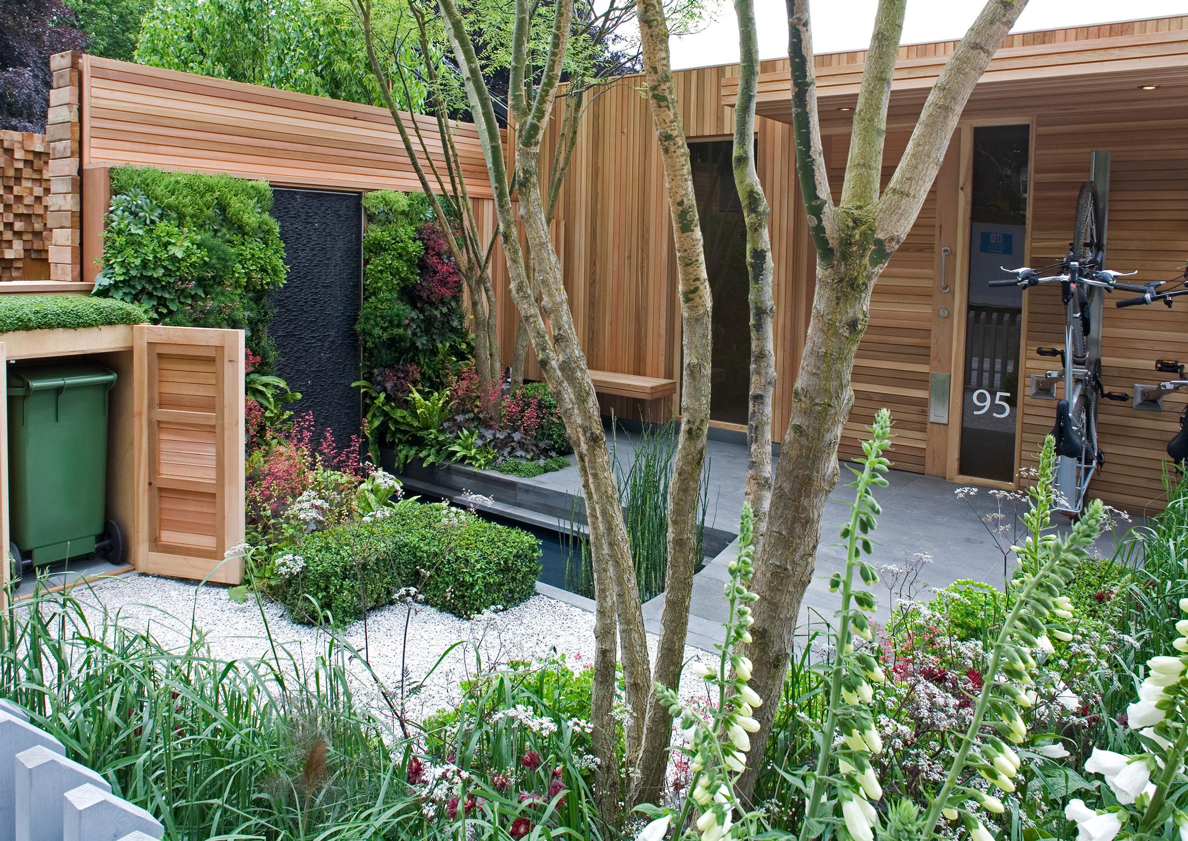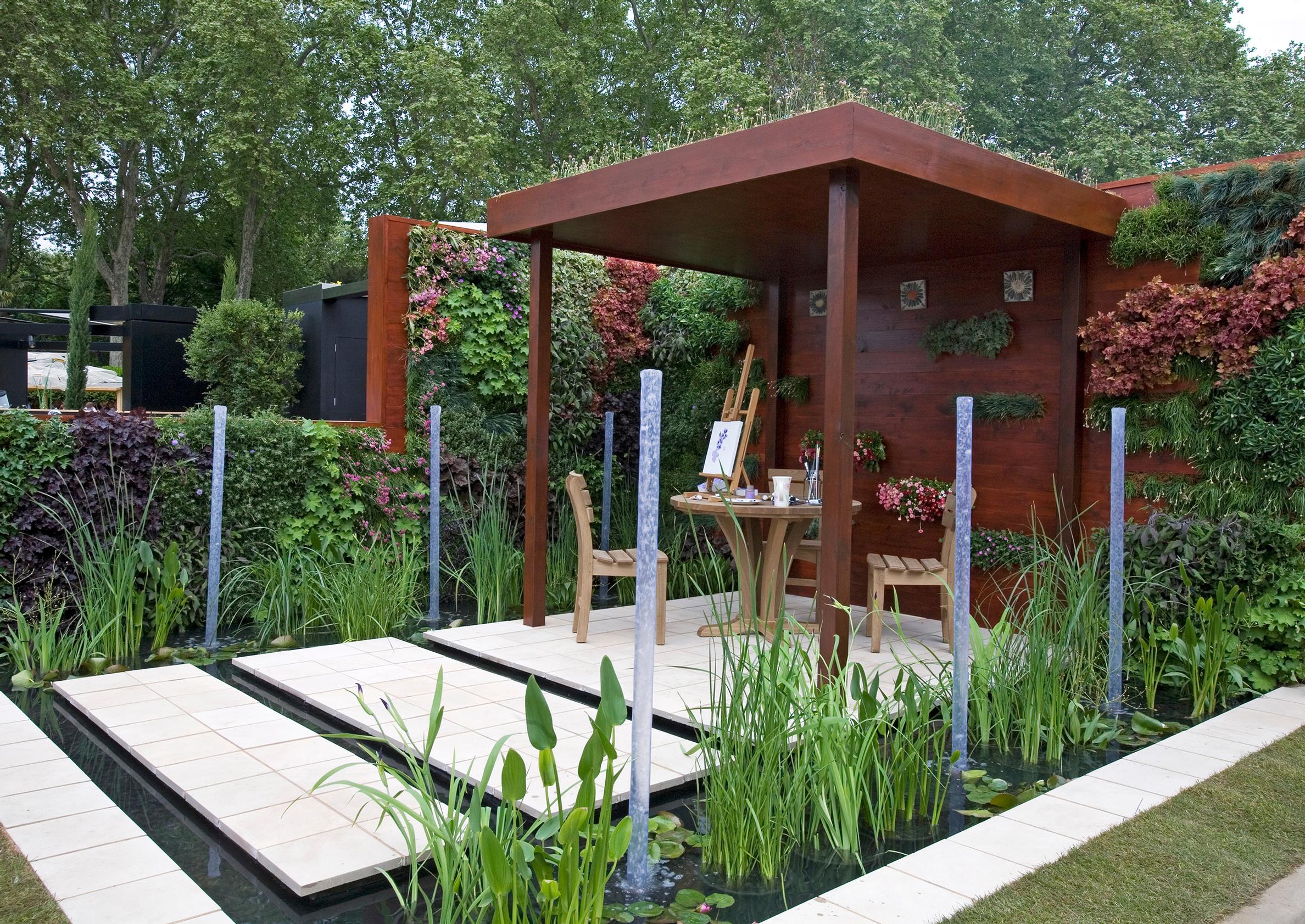 - Pienessä pihassa tila käytetään tarkkaan. Vesiaiheen seinämät on verhoiltu kasvillisuudella, jotta piha saadaan entistä vehreämmäksi.