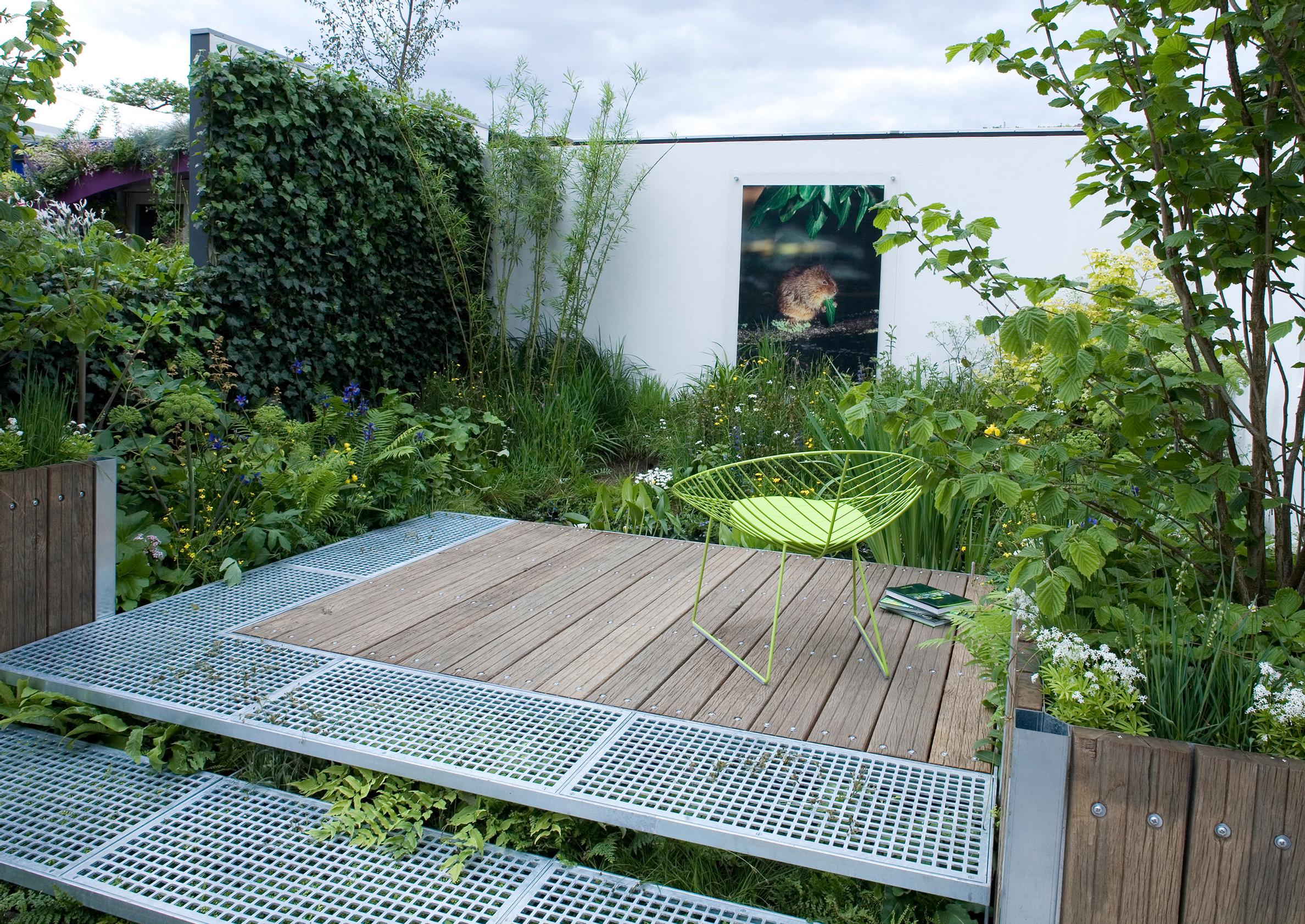 - Puupatio sopii hyvin luontoaiheiseen pihaan. Sitä terästää metalliritilästä rakennetut portaat ja reunus. Myös korkea istutusallas on tehty patioon käytetystä laudasta.
