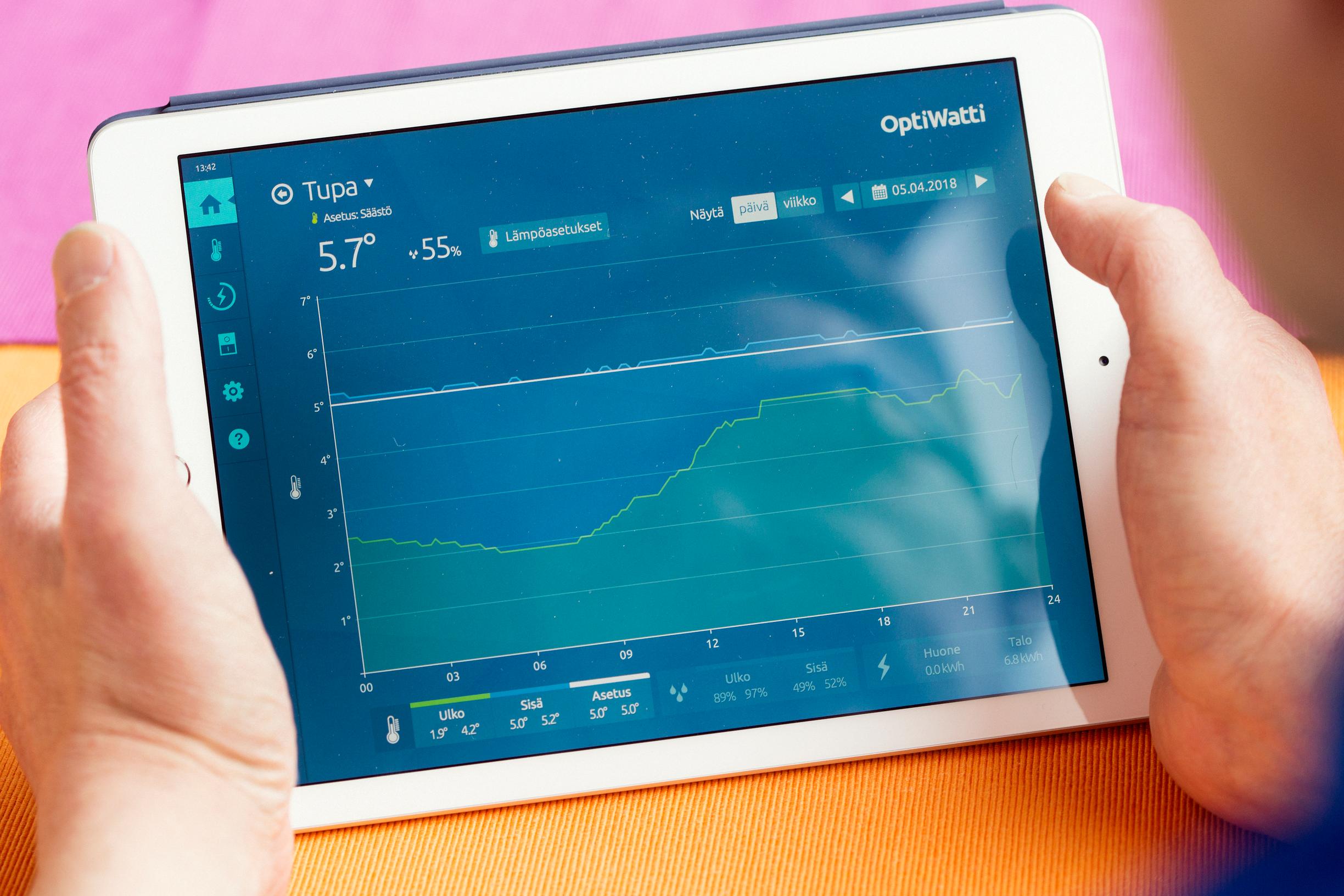 – Järjestelmä laskee sääennusteen perusteella, milloin mökin lämpöä pitää nostaa niin, että iltakahdeksalta tuvassa on normaali lämpötila. Oletus perustuu ulkoilman lämpötilaan, Marjeta selittää.