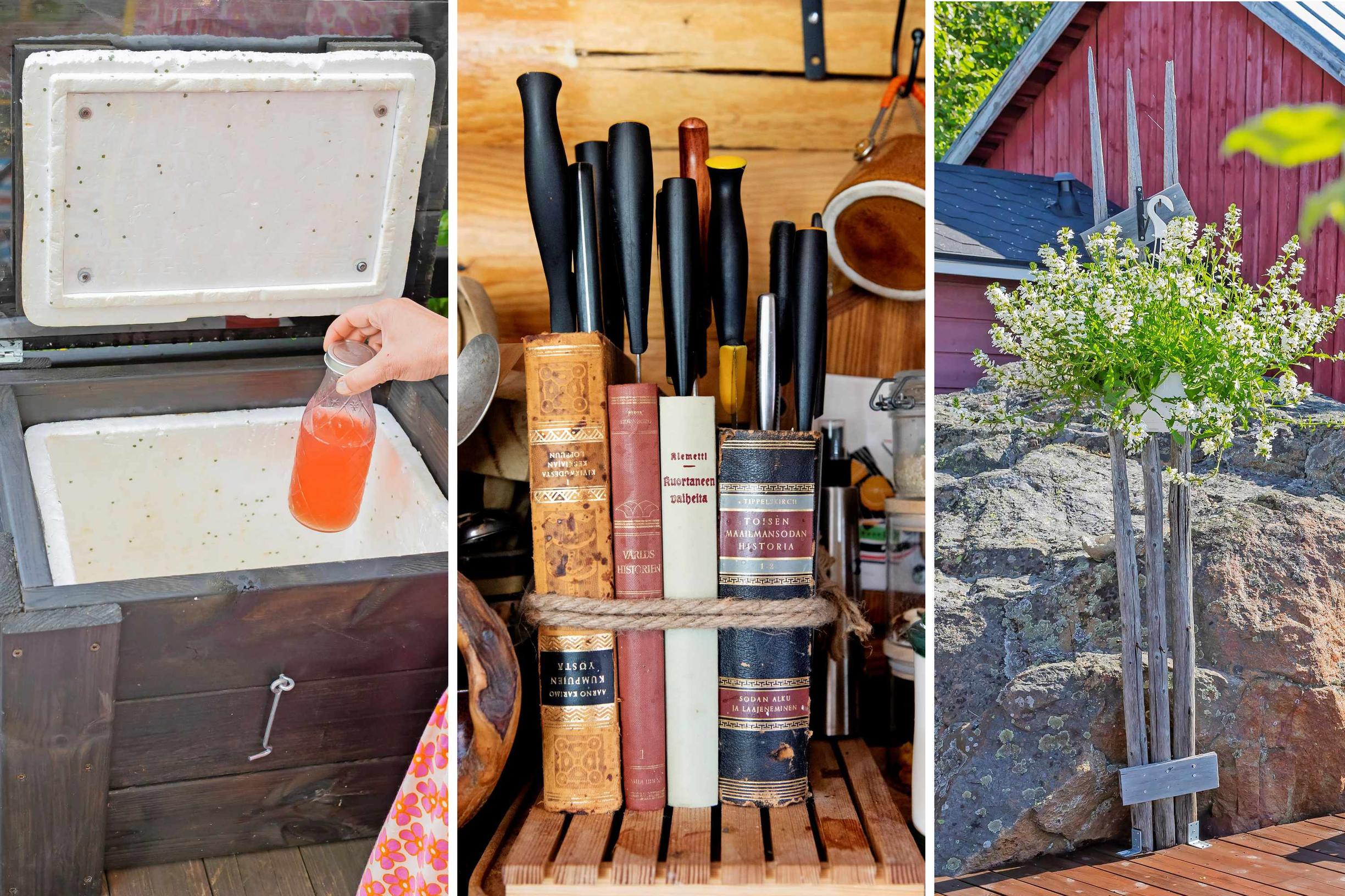 Mökkiläiset ovat mestareita keksimään uusia käyttötarkoituksia vanhoille tavaroille: kirjapinosta voi syntyä vaikka veitsiteline ja ylijäämälaudoista kylmälaukun suojus. Katso viisi kekseliästä viritystä!