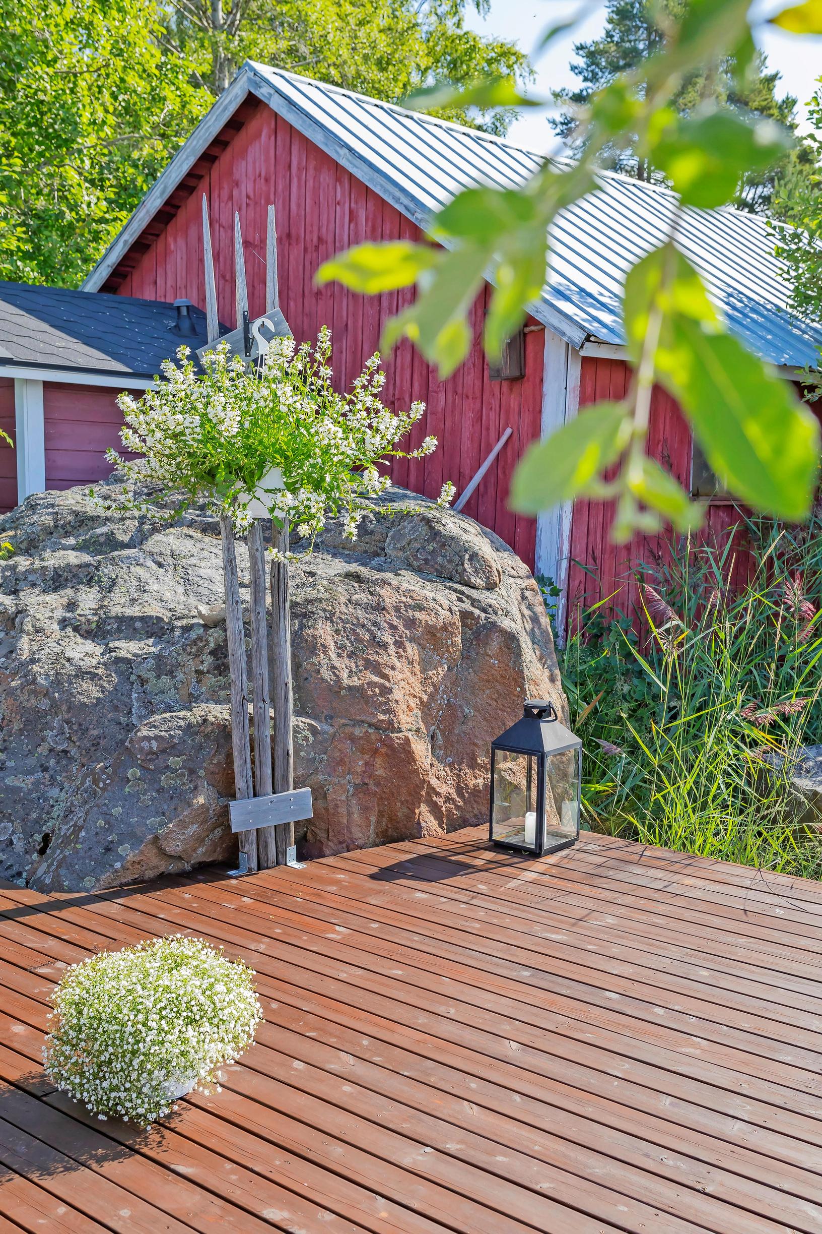 Syksyllä kukat voi vaihtaa lyhtyihin, joten idea muuntautuu vuodenajan mukaan. Seija ja Jarmo Karhulan mökki sijaitsee aivan merenrannassa, mikä näkyy myös mökin sisustuksessa.