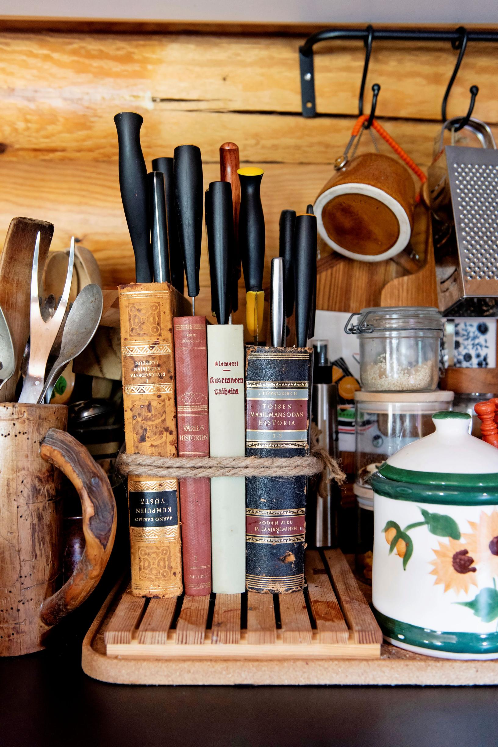 Vanhat kirjat voivat muuttua tilaa vieväksi ongelmaksi, kun niille ei enää ole käyttöä. Tälläpä mökillä on! Yhteen koottujen vanhojen kirjojen sivut pitävät veitset järjestyksessä kuin parhaassa telineessä.