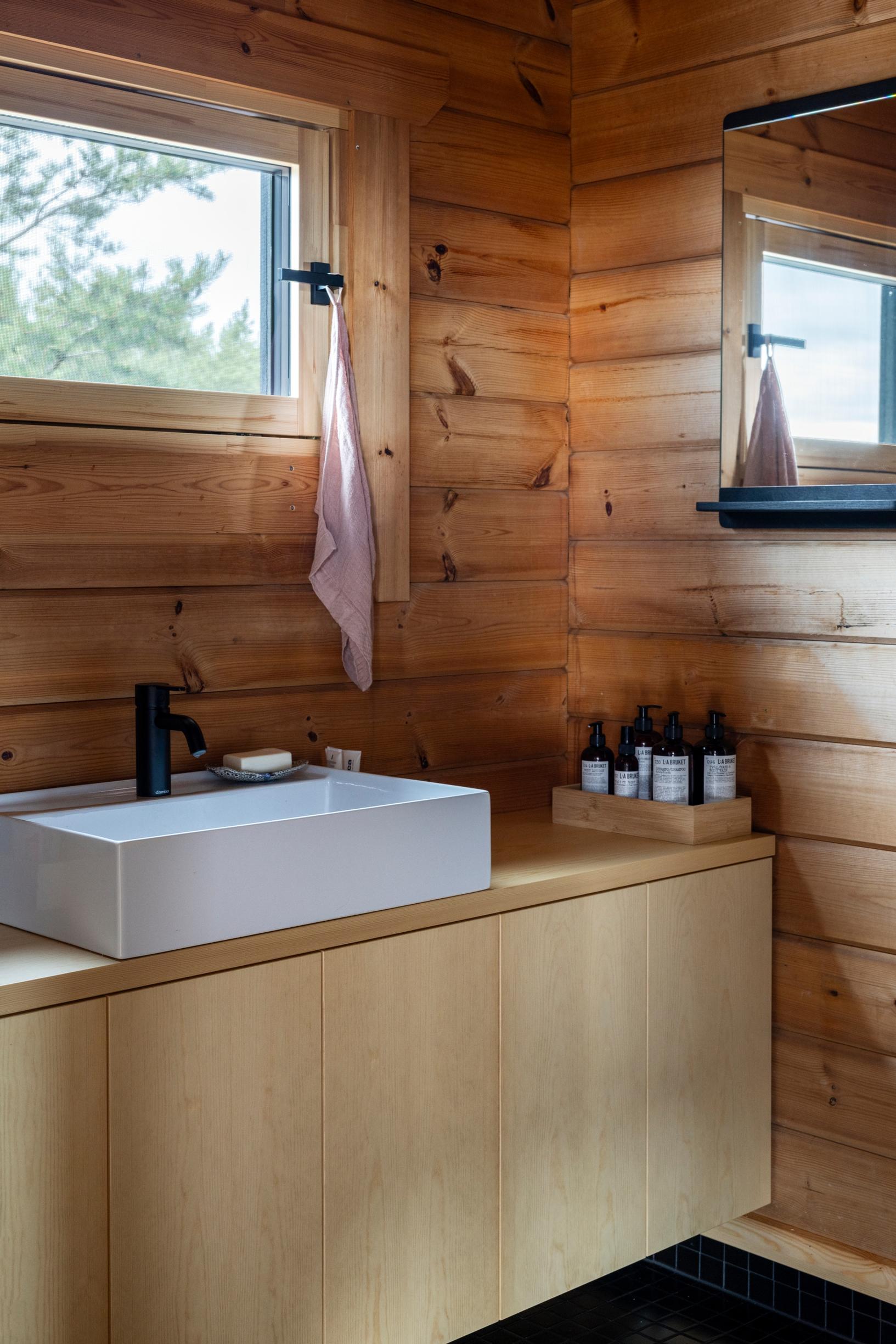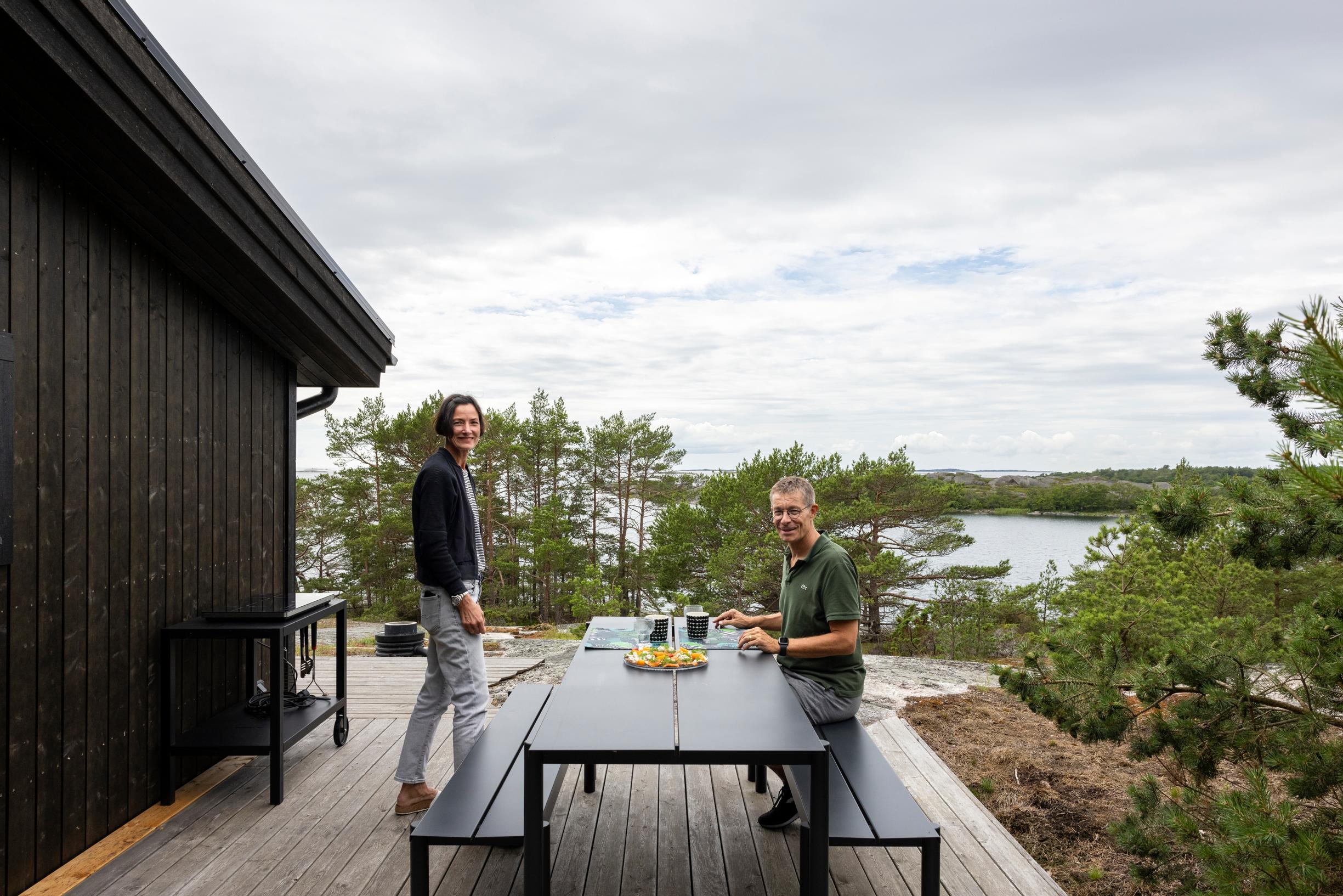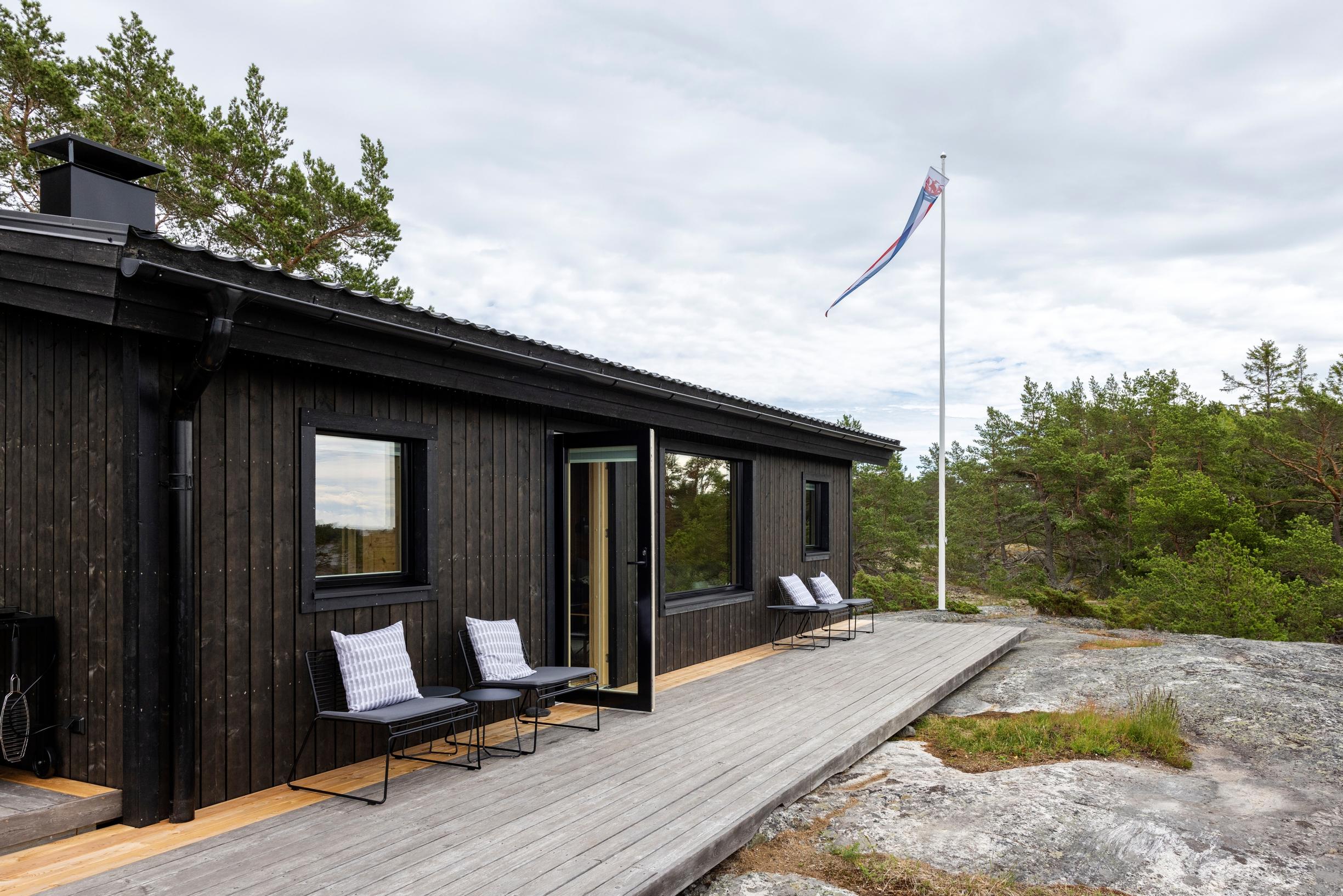 Tontilla oli alun perin yksi perinteinen mökki, jonka Rena ja Klaus kunnostivat huolellisesti sisältä ja ulkoa. Mökin puuverhoilu on käsitelty tummaksi, mikä sointuu saaristoluontoon täydellisesti.