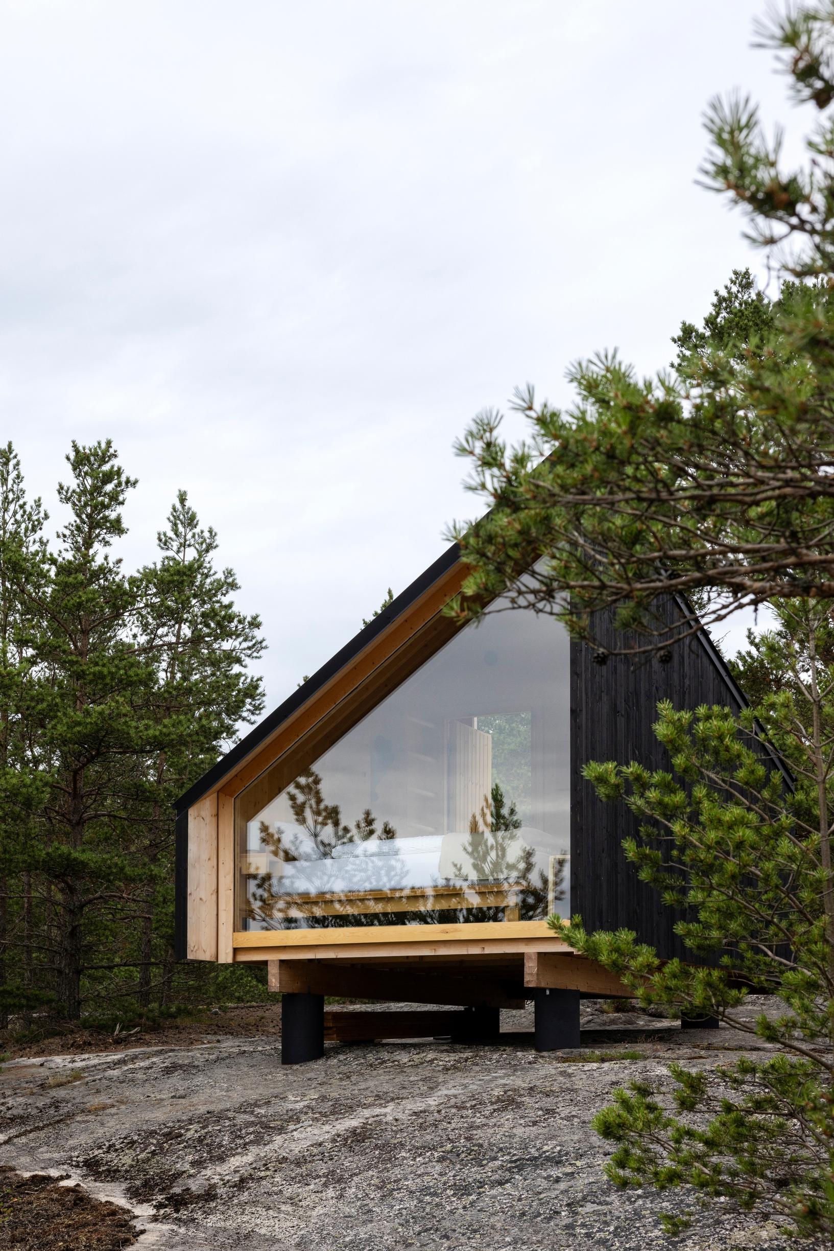 Kaksi valmiiksi kalustettua modernia minimökkiä toimivat saunana ja vierasmajana.