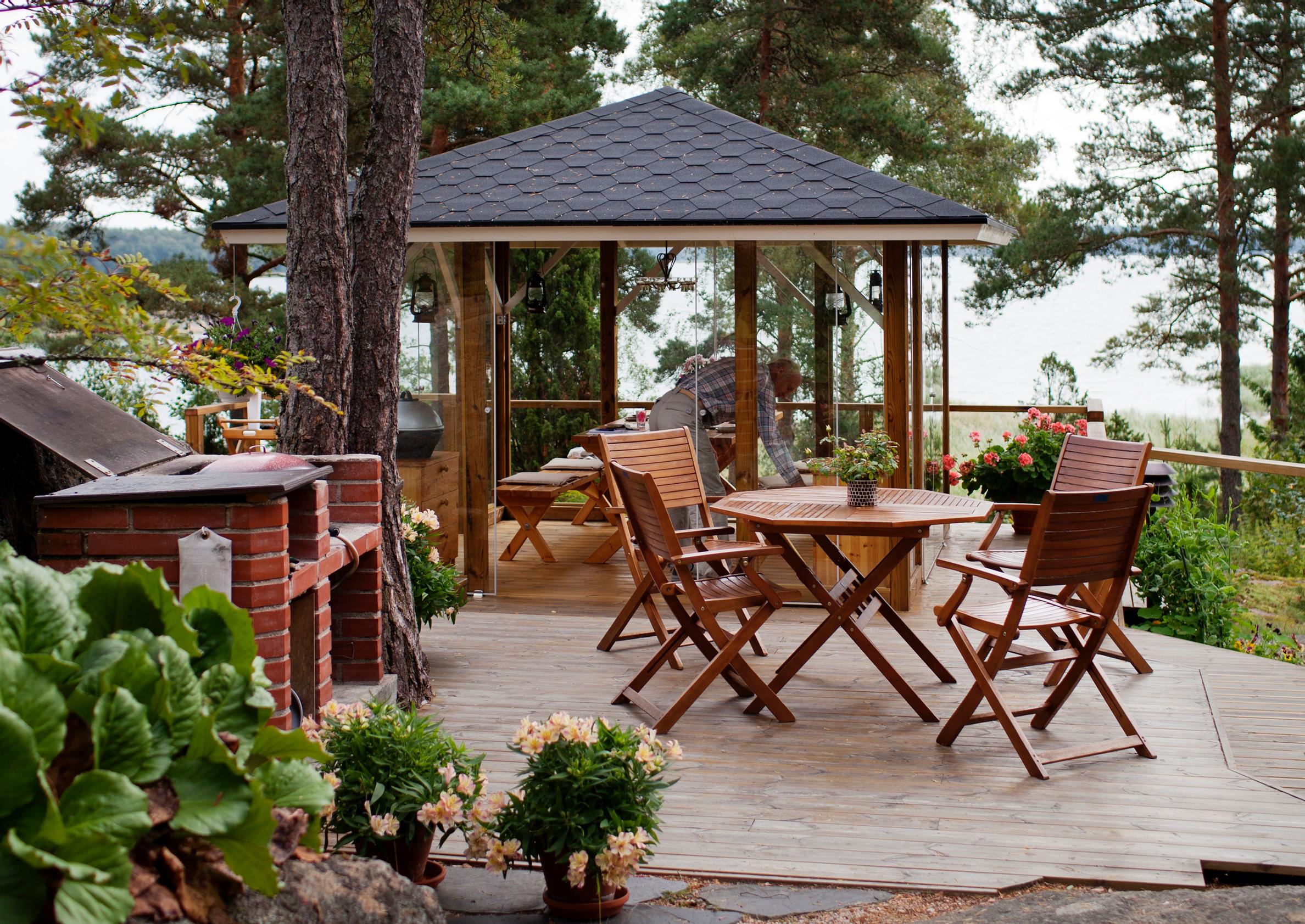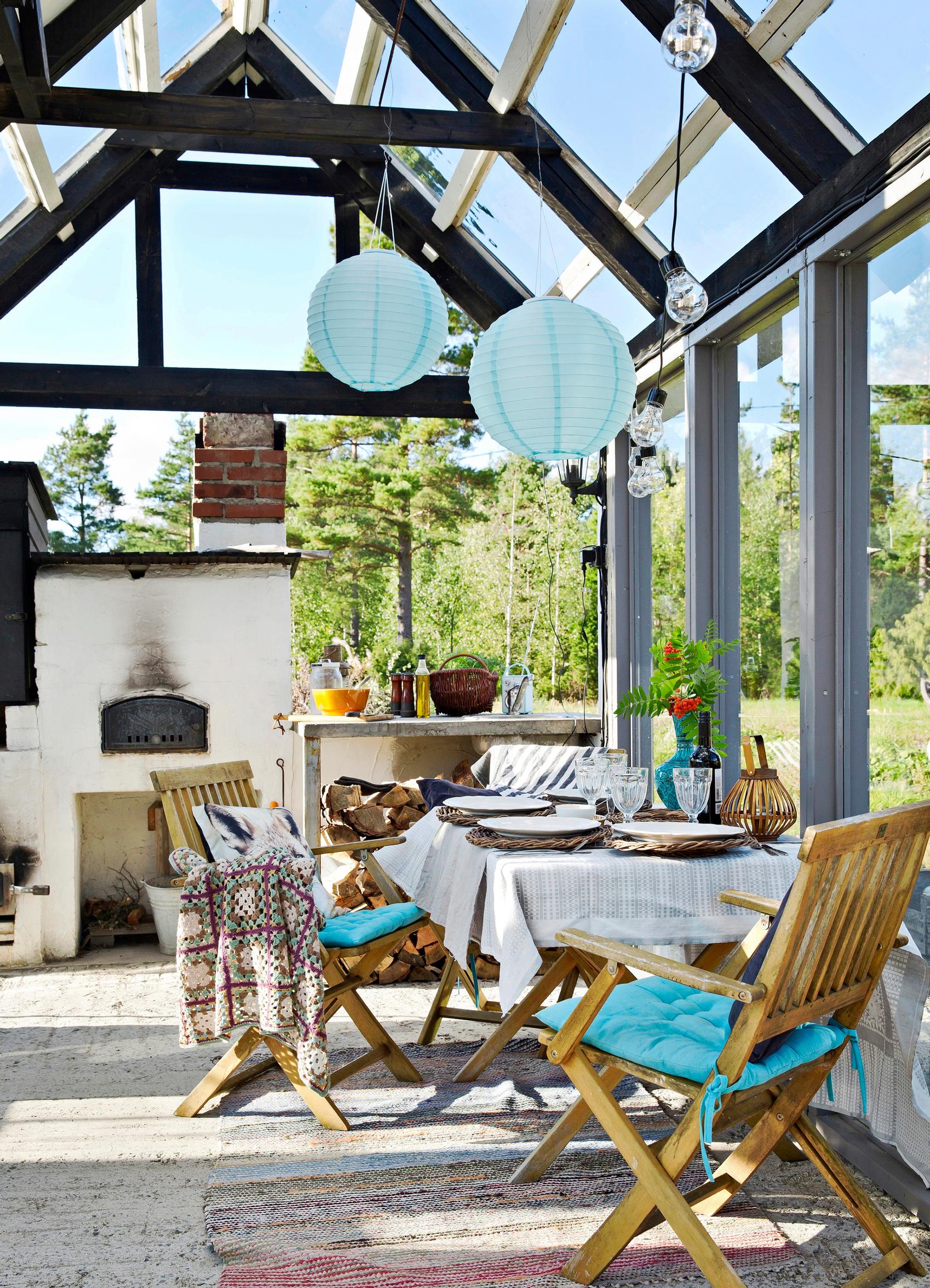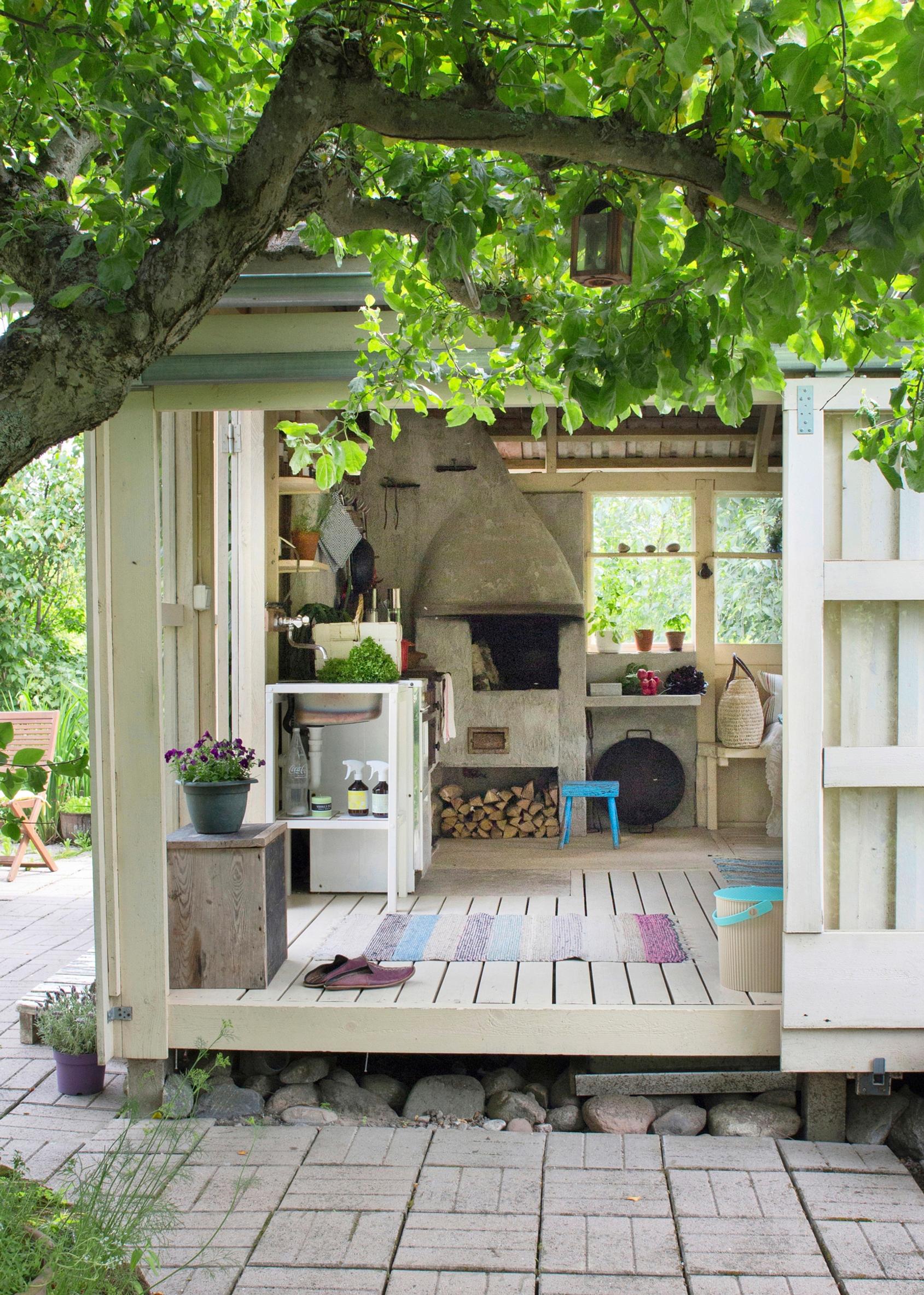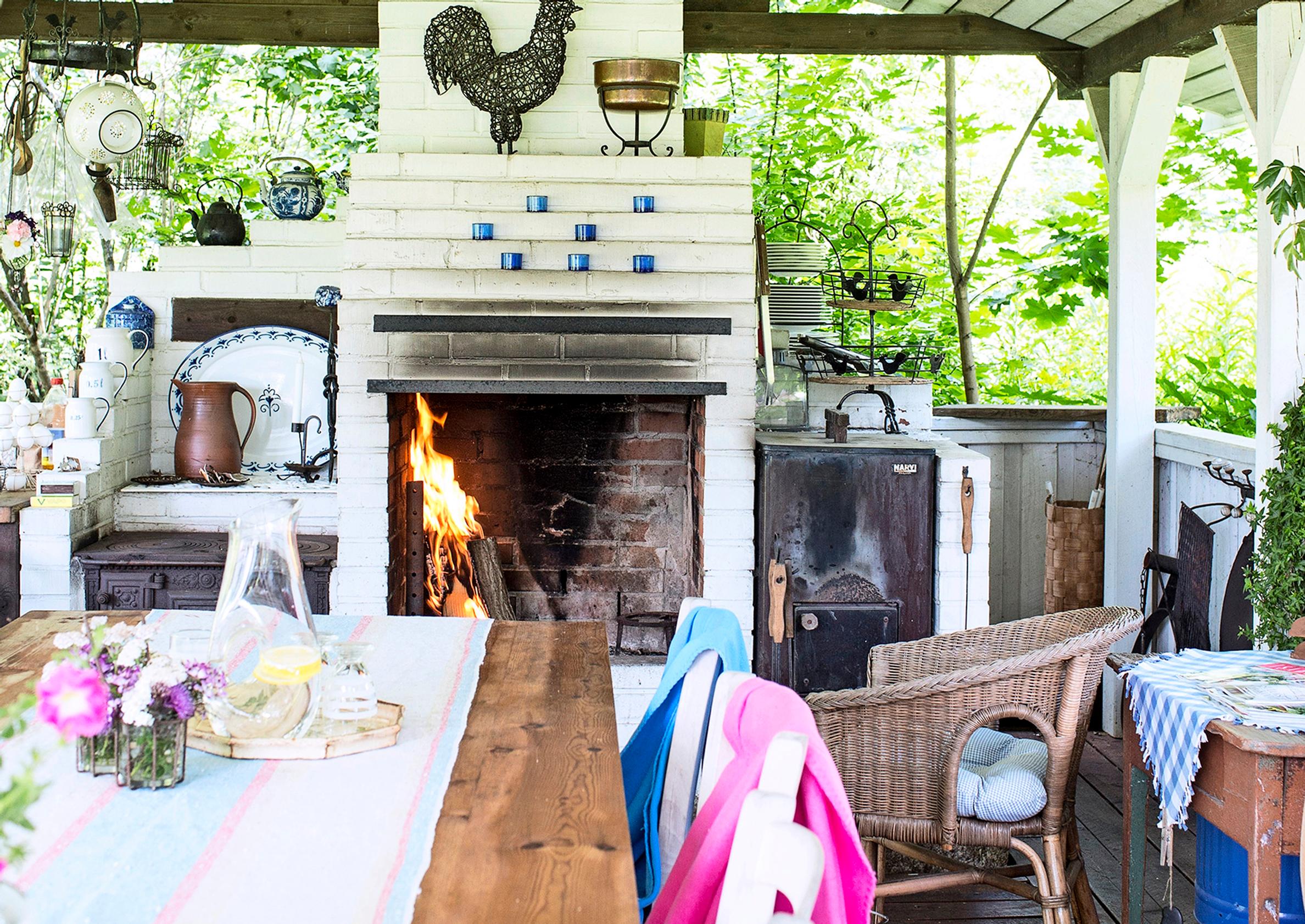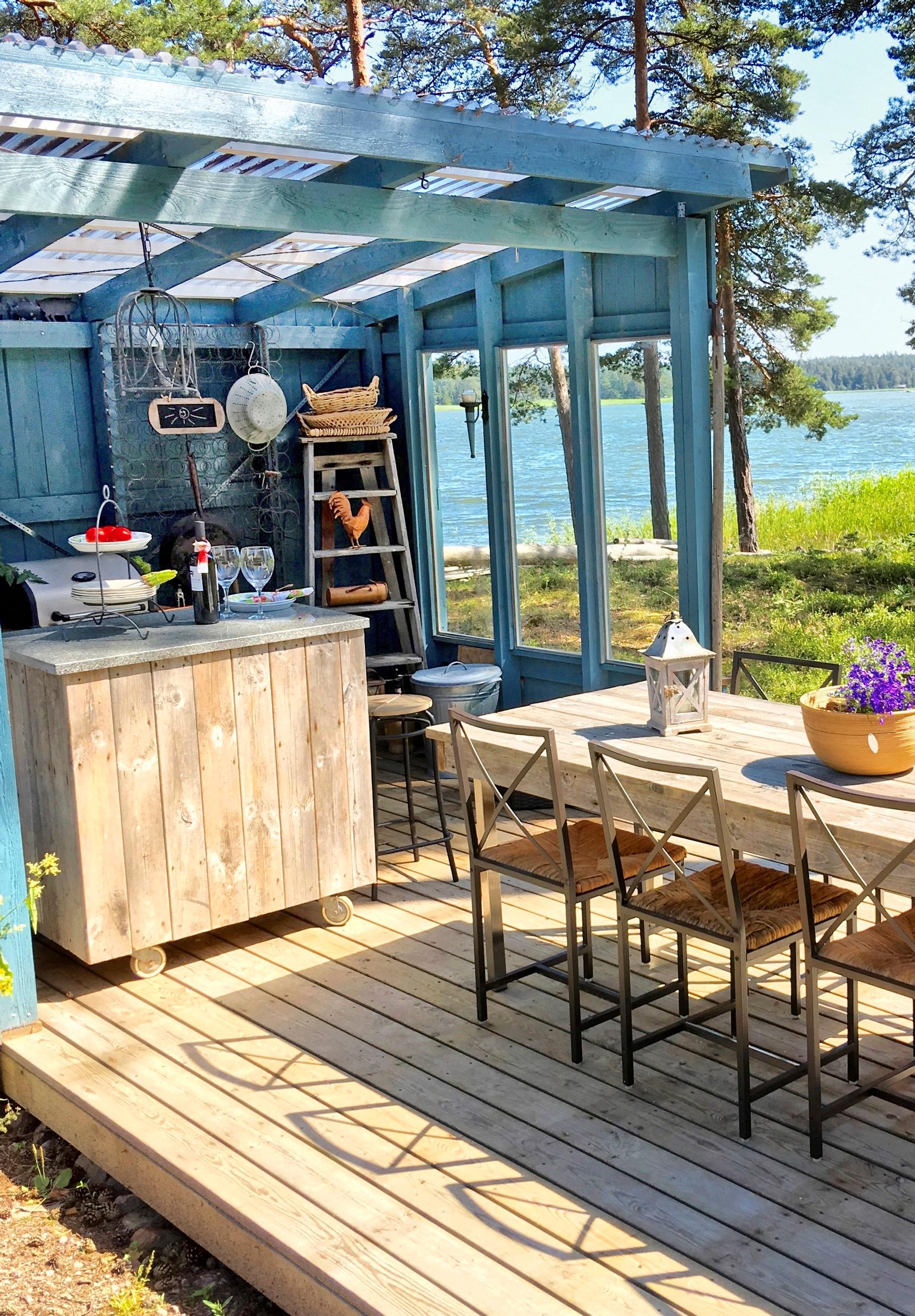 Pieni, saaristotunnelmainen pihatalo yhdistää mutkattomasti sisä- ja ulkotilat. Se on sekä kesäkeittiö että suloinen pikkupirtti, jossa voi nukkua päivätorkut tai istua tunnelmallisesti iltaa. Muurattu tulisija lämpiää puilla, ja uunista saa ruuan pöytään vain parilla askeleella. Kesäkeittiön tunnelmaan sopivat patinoituneet tuolit ja vanha, kaunis räsymatto.