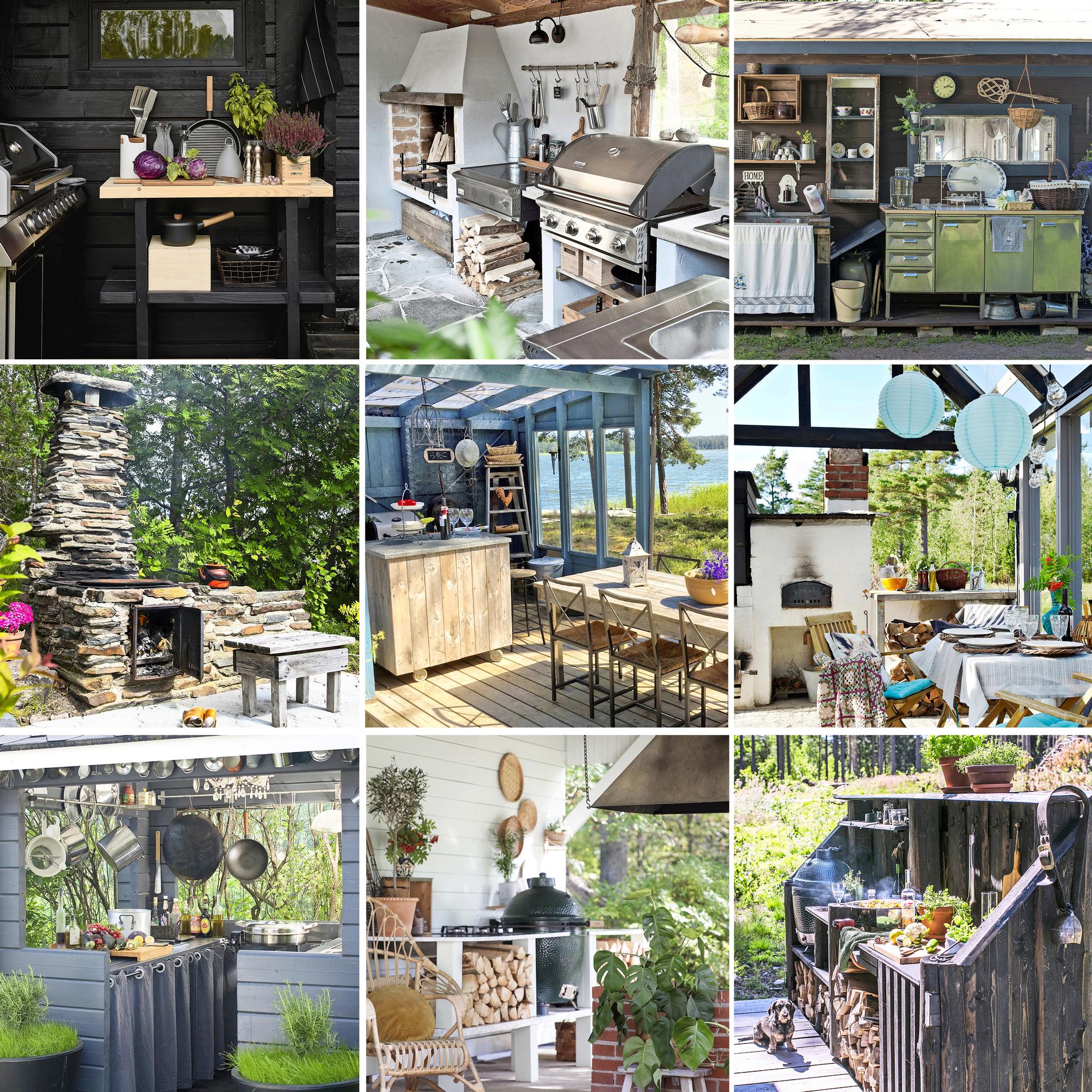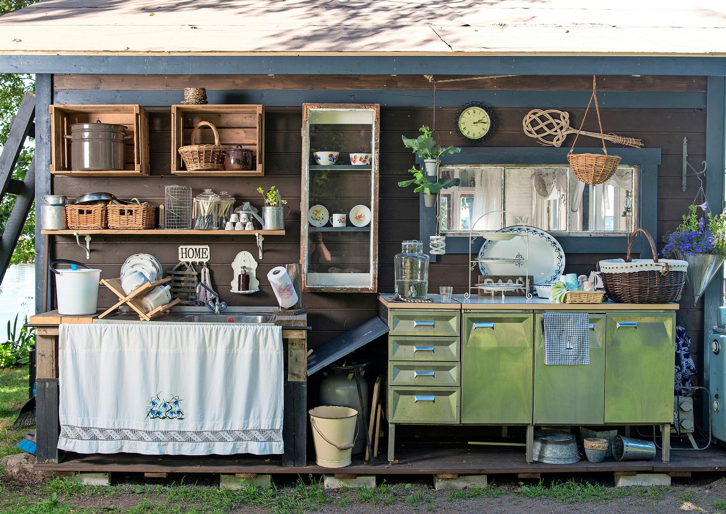 Parhaimmillaan kesäkeittiö on komentokeskus, ruoanlaittopaikka ja seurustelun tyyssija. Kekseliäisyydellä ja kierrätysmateriaaleilla syntyy toimivia ja persoonallisia soppeja ulkona kokkailuun. Poimimme mökkiläisten parhaat ideat!