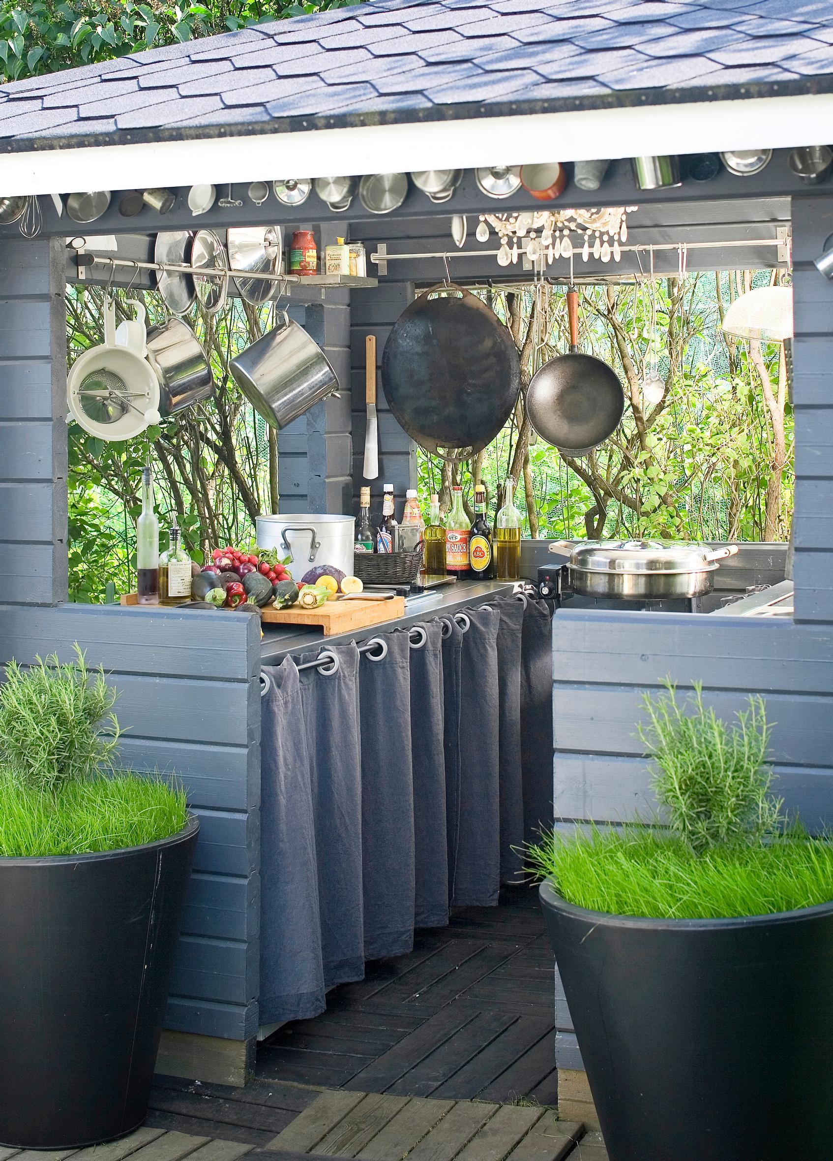 Isojen tammien ympäröimä kesäkeittiö on rakennettu vanhan grillikatoksen runkoa hyödyntäen. Takaseinä on laudoitettu, ja toinen seinusta on tehty vanhoista ikkunoista. Monikäyttöisen keraamisen grillin tasot molemmin puolin ovat lattiaremontissa purettua vaneria, joka on päällystetty DC-fix-kontaktimuovilla. Kirpputoreilta hankitut kauniit ja käytännölliset kulhot, kannut ja korit tuovat kokkauspisteeseen pehmeyttä ja kerroksellisuutta. Hyllyillä ja seinällä ne ovat helposti käden ulottuvilla.