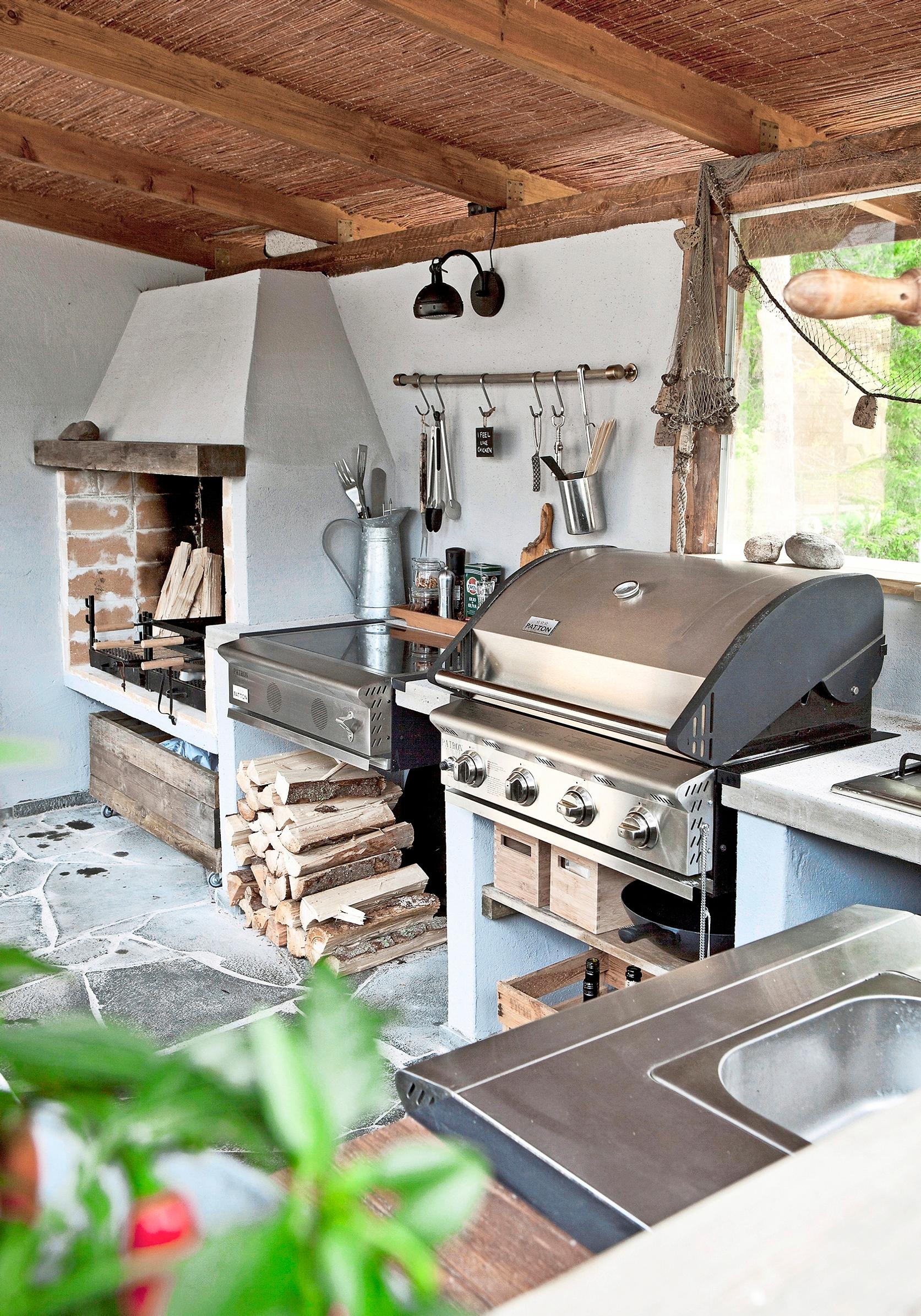 Kokkailupaikka terassille syntyy jo grillistä ja apukeittiötasosta. Säilytä välineet koreissa tai seinällä.