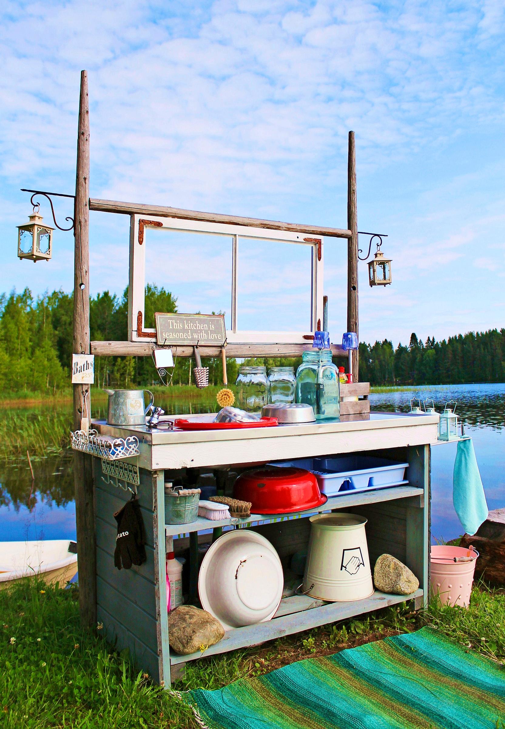 Järven tuntumassa tiskaa ihan huvikseen. Kekseliäisyydellä ja vanhaa kierrättämällä syntyy helposti soma soppi tiskihommiin ja vaikka kalanperkuuseen.