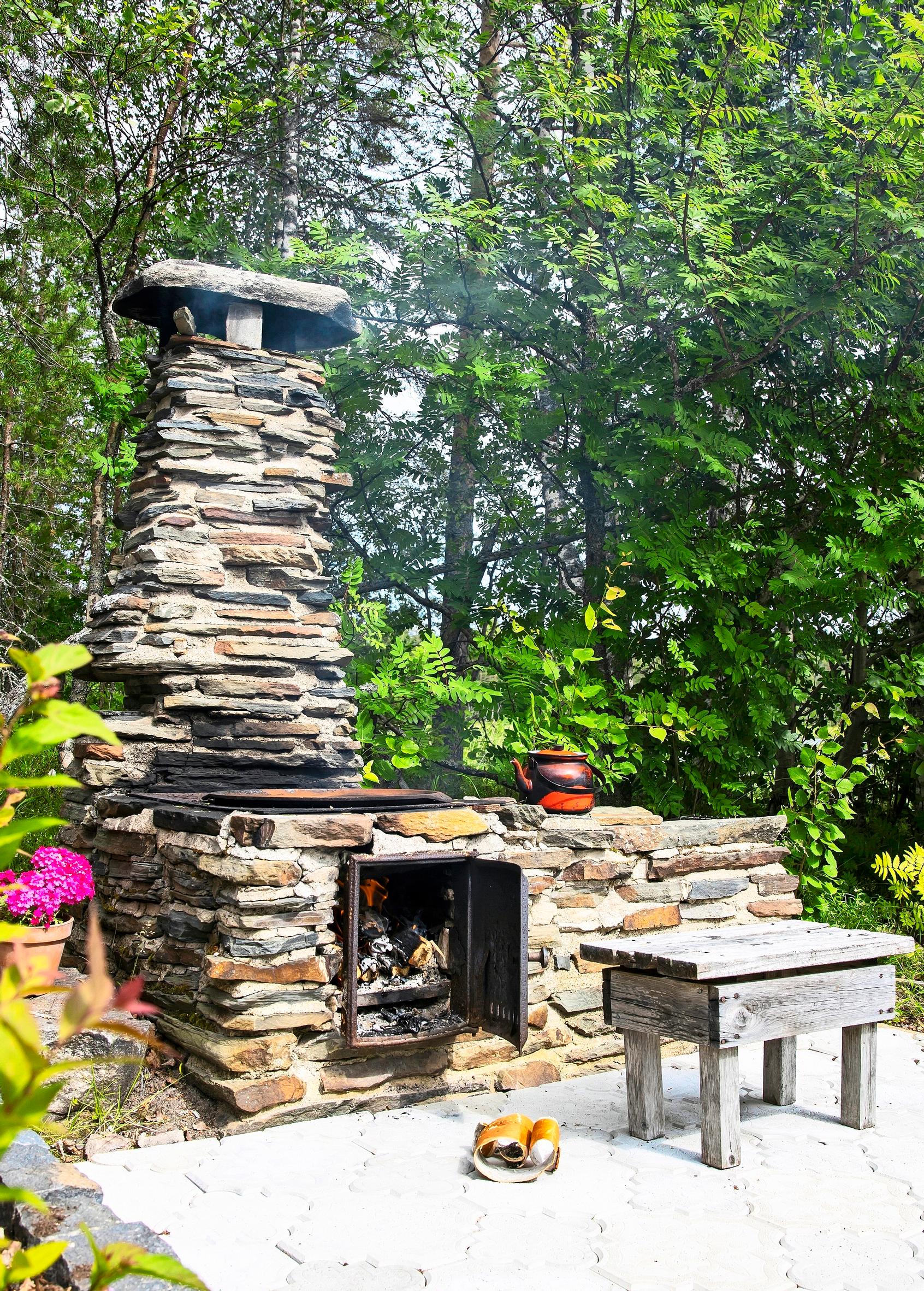 Kesäkeittiö on muurattu Kainuun pronssiliuskeesta. Tiheäkerroksisen kiven mineraalit ovat lujasti kiinnittyneitä toisiinsa, minkä ansiosta kivi on sään- ja kulutuksenkestävä. Korkea tulisija on muurattu itse. Sen perustus on valettu hiekkamaahan kaivettuun kuoppaan. Ominaisuuksiltaan yhä pistämätön Högforsin valurautainen tulipesä löytyi vajasta. Tulisijan edustan kiveys on ladottu itse valetuista betonilaatoista.