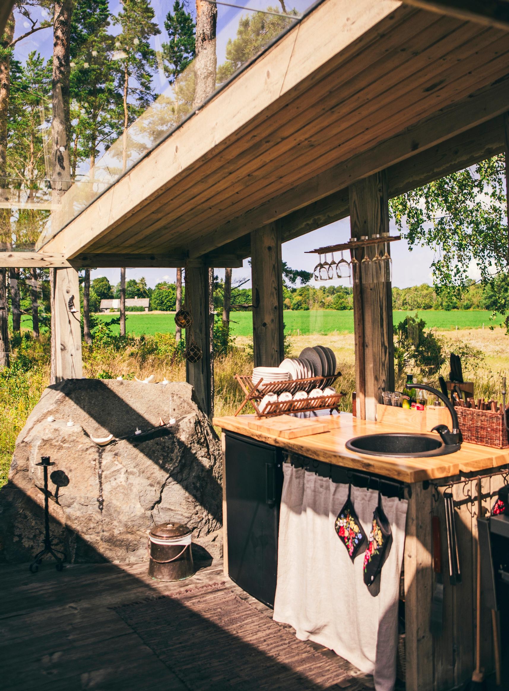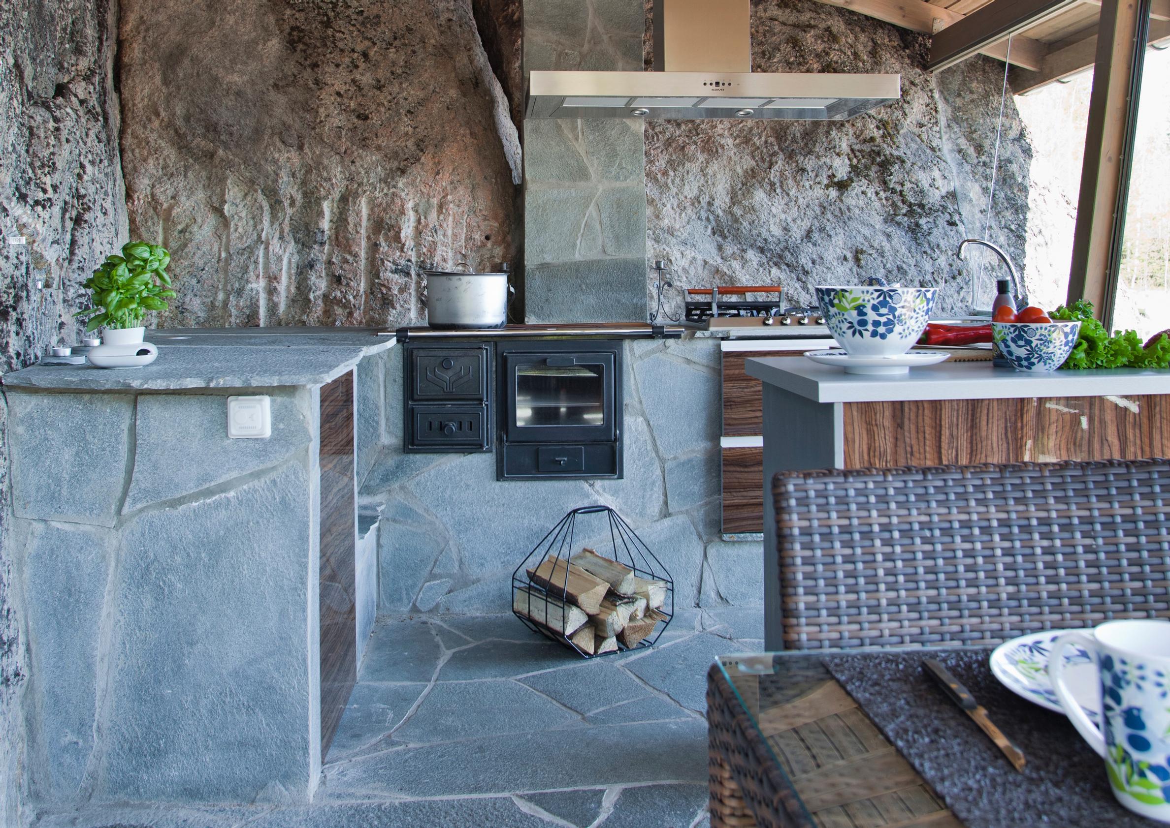 Viehättävästä kesäkeittiökatoksesta voi katsella menoa pihassa ja tarkkailla leikkiviä lapsia. Ulkokeittiö on muurattu harkoista suoraan kalliolle, tasoitettu ja maalattu. Työtasot on valettu betonista, ja lattia on luonnonkiveä. Sisäkatto on päällystetty pajusermillä. Keittoastiat ja muut tarvikkeet ovat tallessa reelinkitangolla ja hyllyillä pöytätason alla bambulaatikoissa.