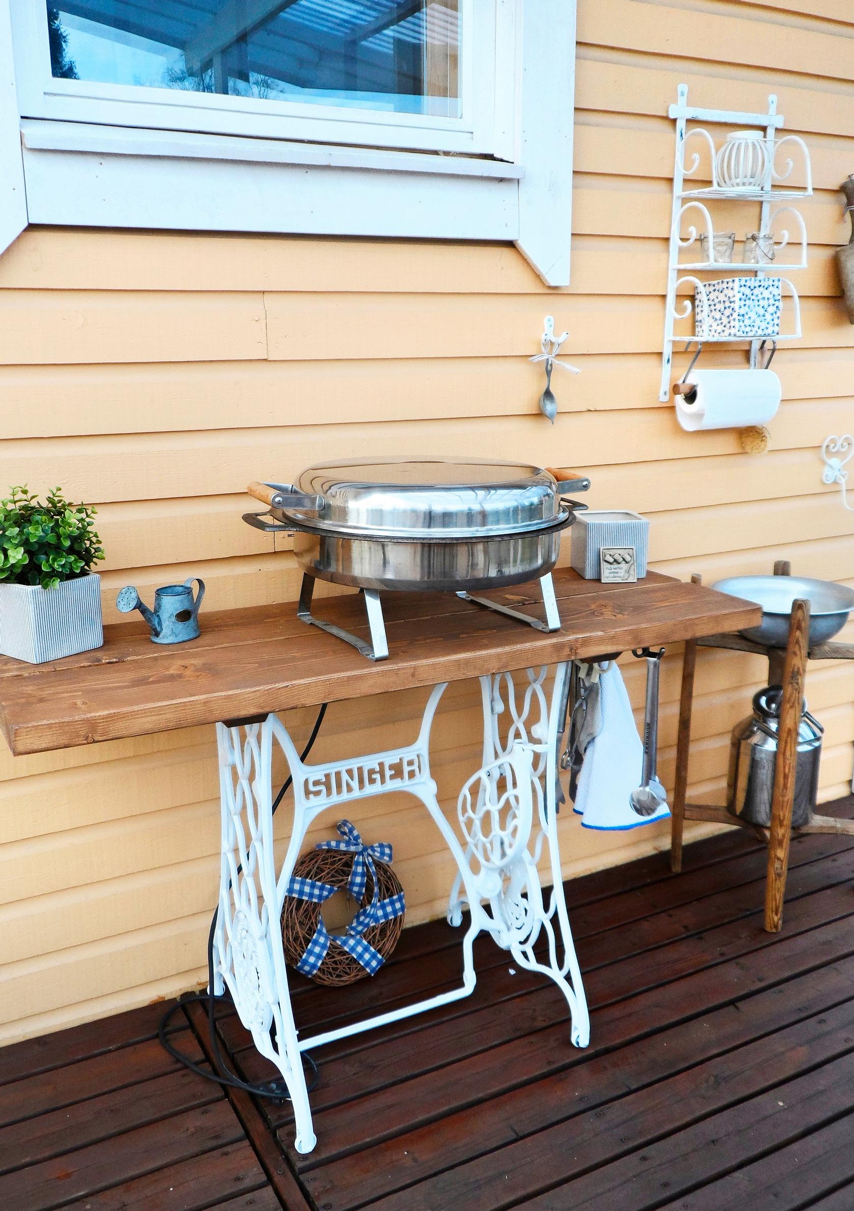 Pieni kokkailupaikka terassille syntyy jo puutasosta, sähkögrillistä ja jalustalle nostetusta käsienpesuvadista. Erityisen hurmaavaa kemiläisessä kesäkeittiössä on vanhan Singer-ompelukoneen jalat työtason jalustana.