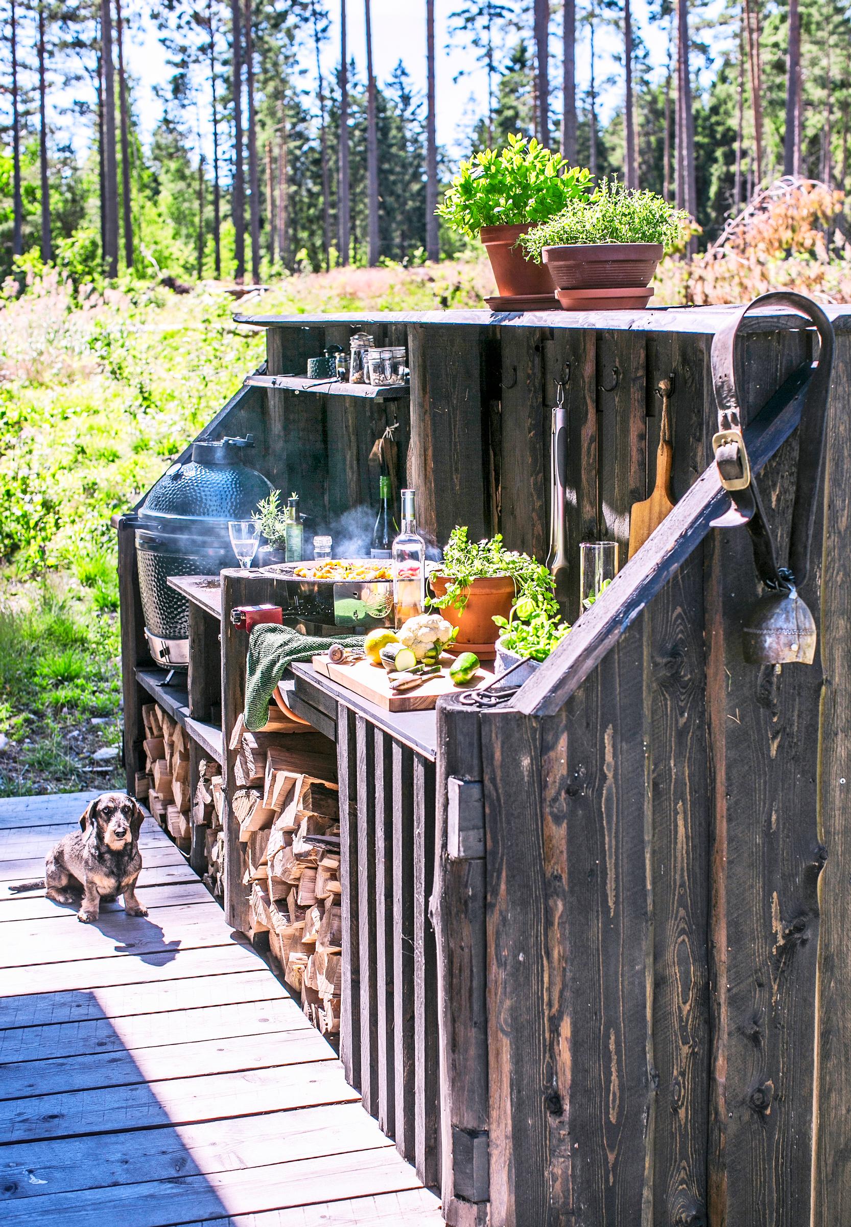 Ulkokeittiössä on kiva häärätä, kun se vastaa varustelultaan ja välineiltään sisäkeittiötä. Suunnittele säilytyspaikat ja toiminnot kätevästi käden ulottuville. Hyödynnä ripustuskoukkuja ja telineitä luovasti, niin pieneenkin tilaan mahtuu yllättävän paljon. Yrtti-istutukset täydentävät kesäkeittiön.