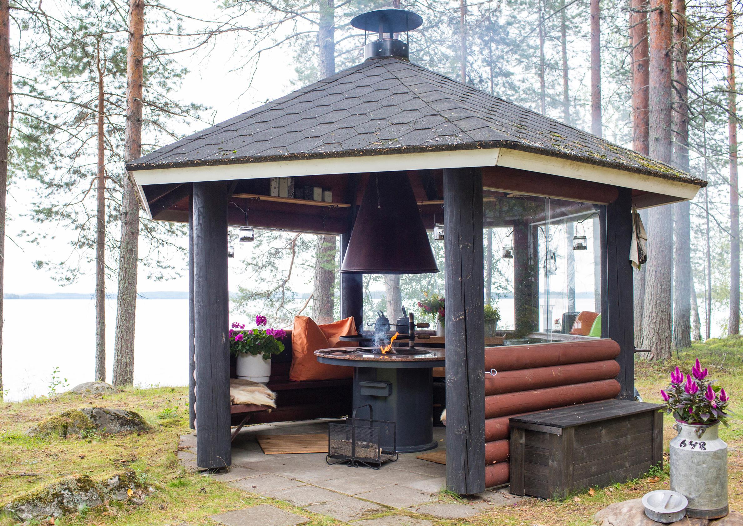Höytiäisen rannalla sijaitsevassa kesäkeittiössä kiehautetaan kahvit ja lämmitetään karjalanpiirakat joka aamu. Mukaan tarvitaan vain puinen kuksa ja lautanen piirakoita varten. Perheen mielestä parasta tässä kesäkeittiössä on, että aina tuntee olevansa retkellä. Lasitus torjuu viimaa.