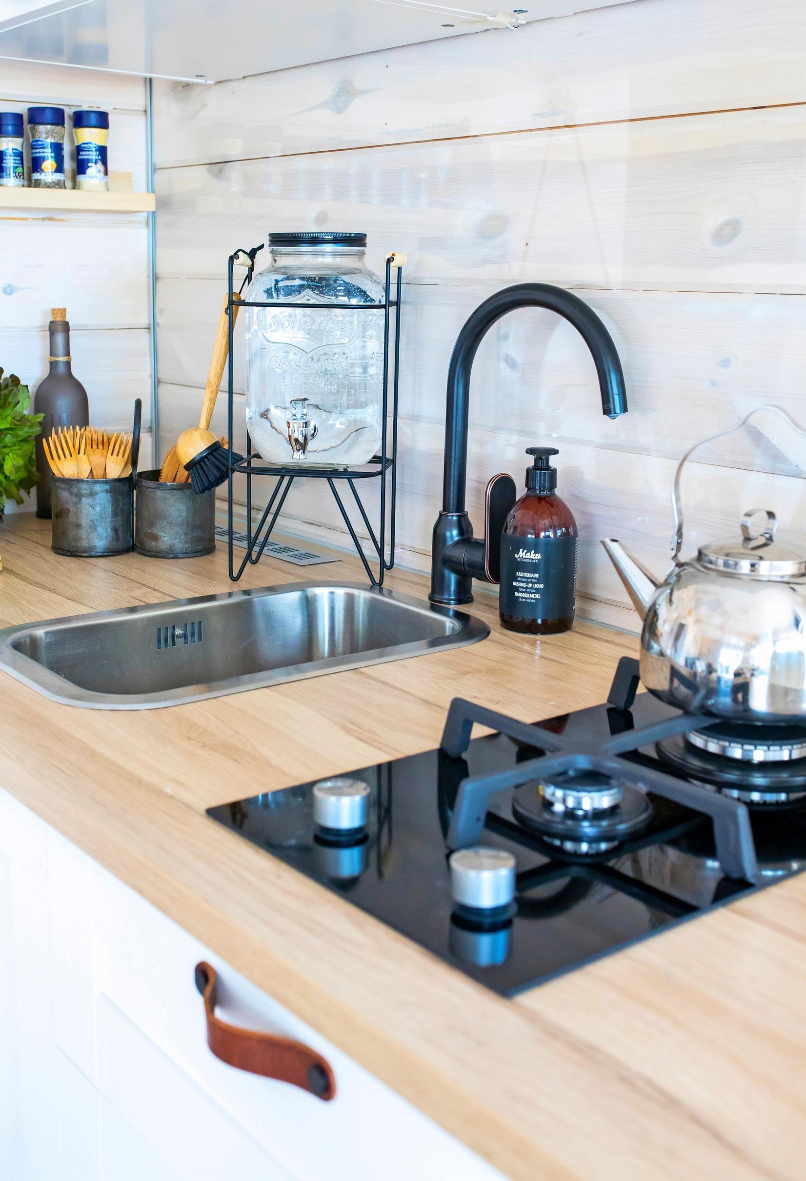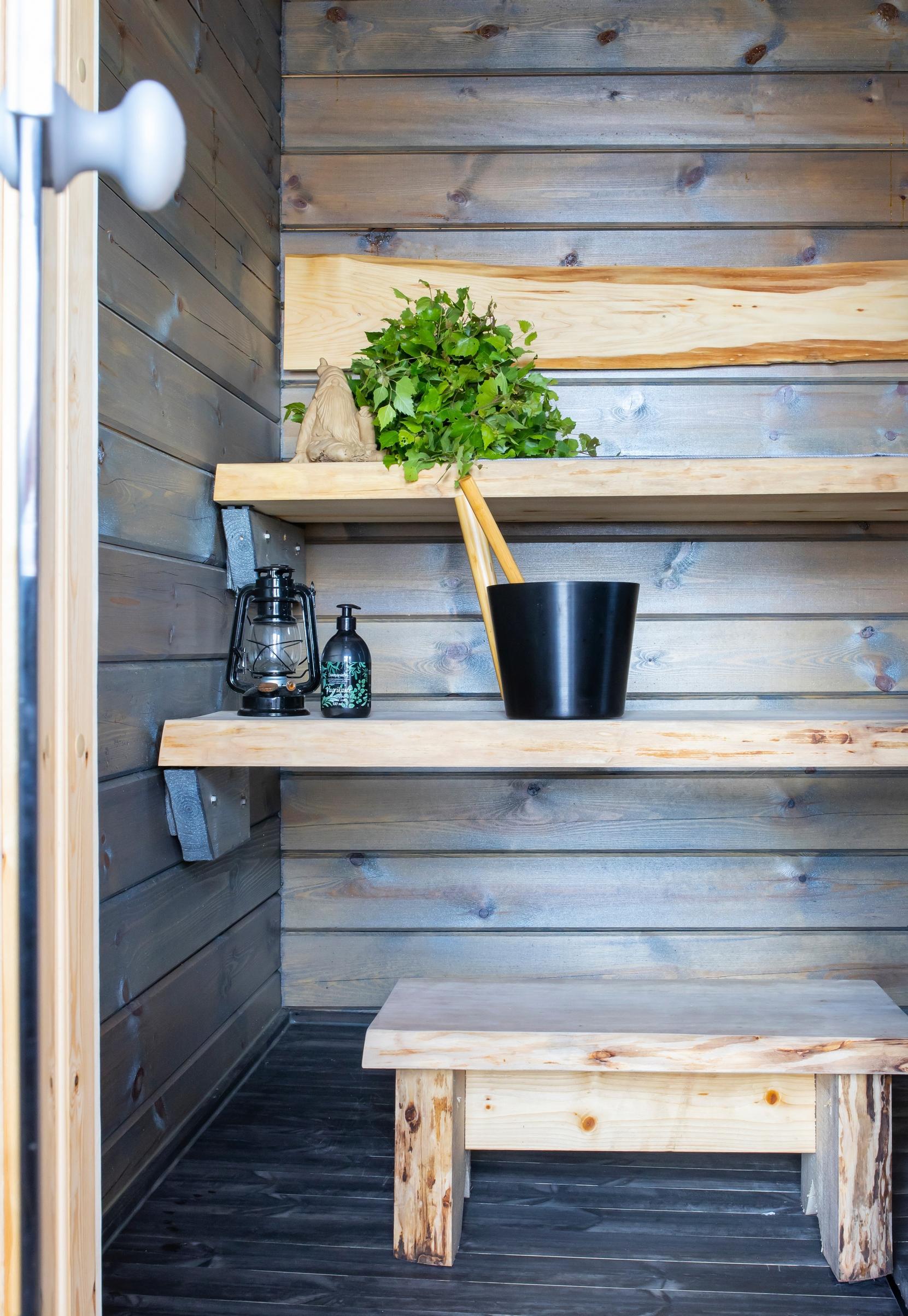 Sauna oli tietenkin aivan ehdoton juttu. Sitä lämmittää Tanjan entiseltä työpaikaltaan häälahjaksi toivoma kiuas, sillä idea mökkilautasta ja yhteisestä rakennusprojektista syntyi tuoreeltaan Luukkosten purjehdittua avioliiton satamaan. Kun Tanja on veistänyt ja höylännyt lauteita itse, löylyt tuntuvat maailman parhailta.