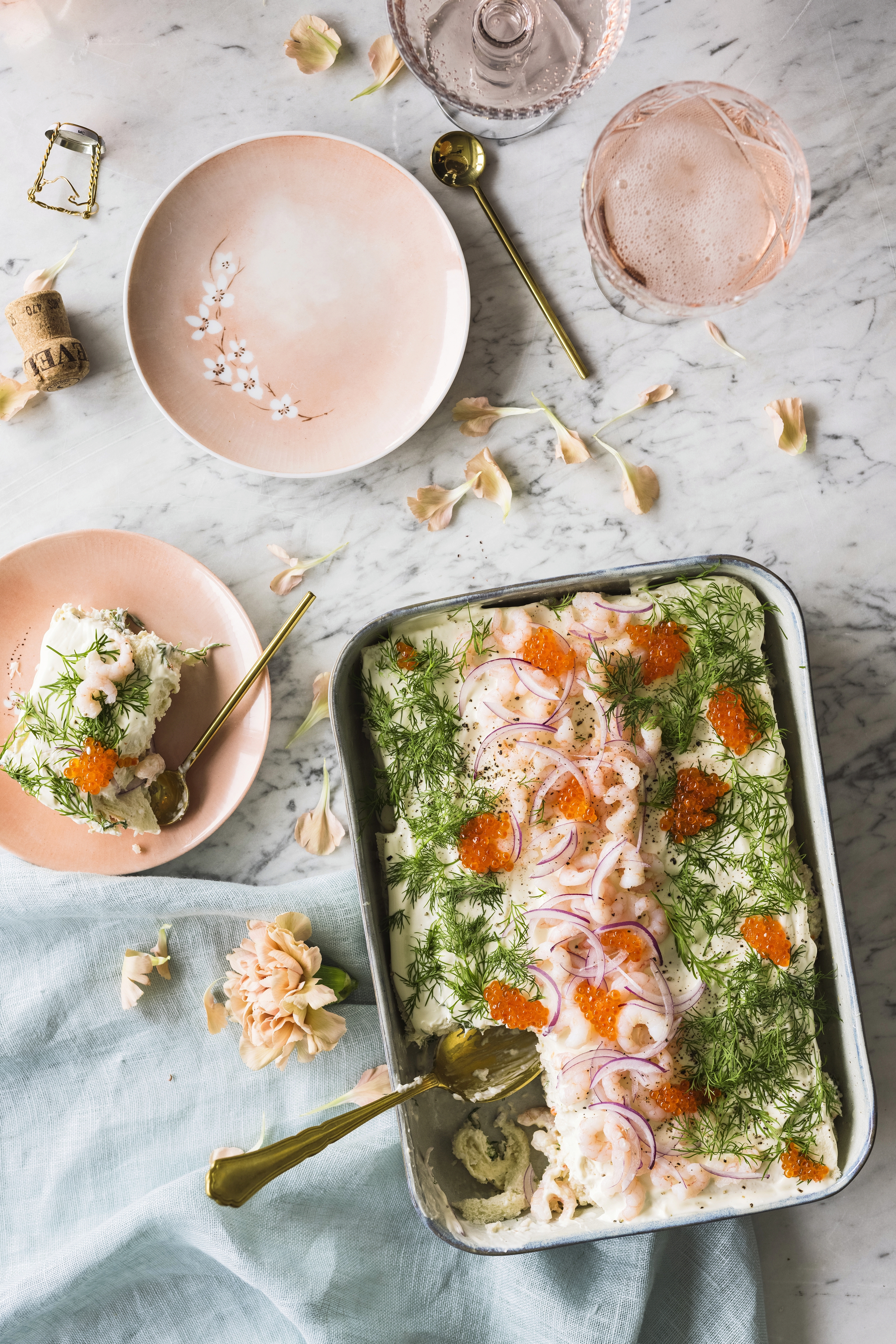 Jos matka mökille on lyhyt, voileipäkakku on mahtava tuliainen kahvipöytään. Skagen-voileipäkakku on paitsi herkullinen myös kätevä, sillä se kootaan vuokaan, jossa kakku on helppo kuljettaa mökille.
