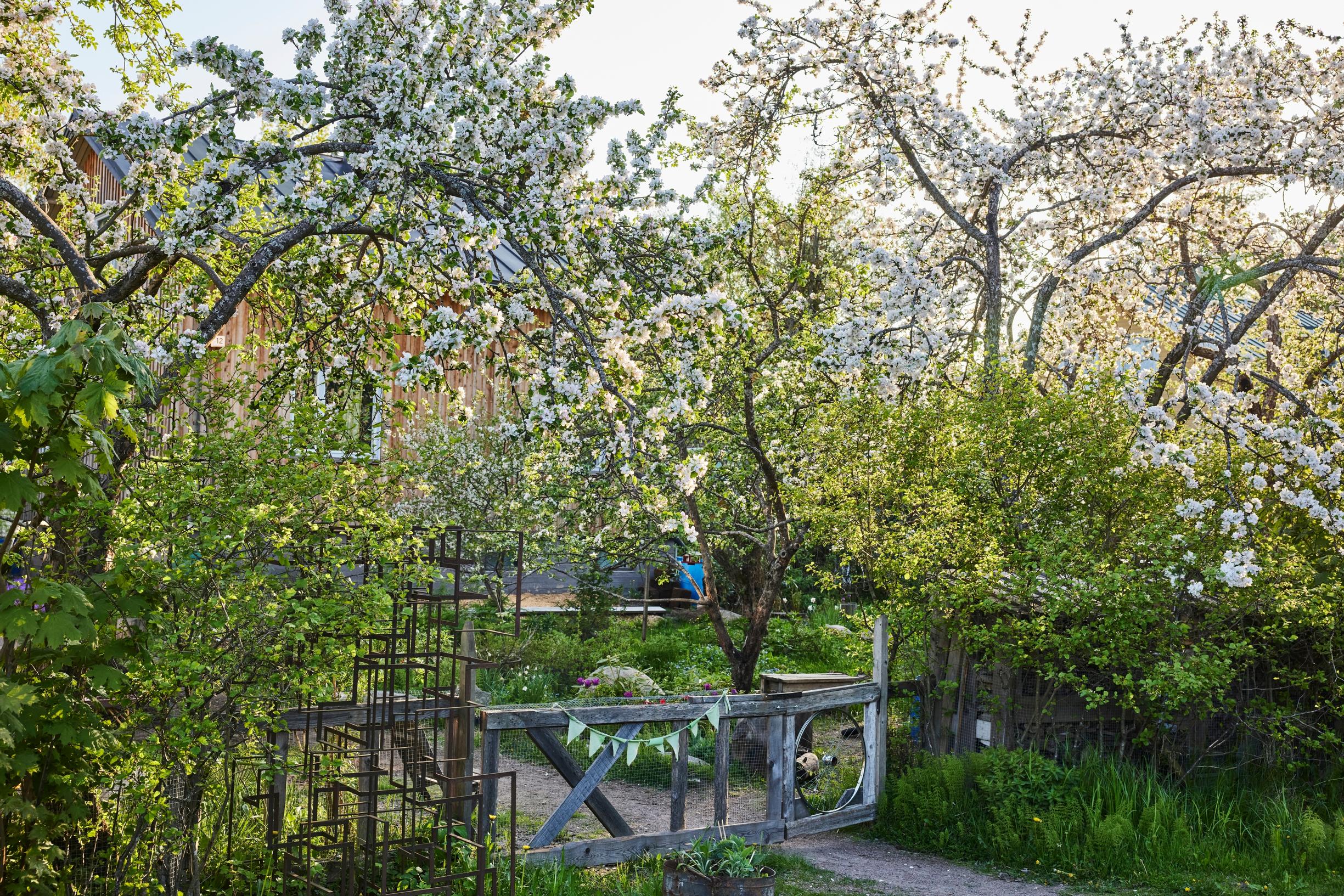 Pihalla oli valmiina paljon vanhoja omenapuita ja pioneja, mutta myös valtavia kasvustoja jättitatarta ja pajuangervoa. Raivaaminen kesti monta vuotta.