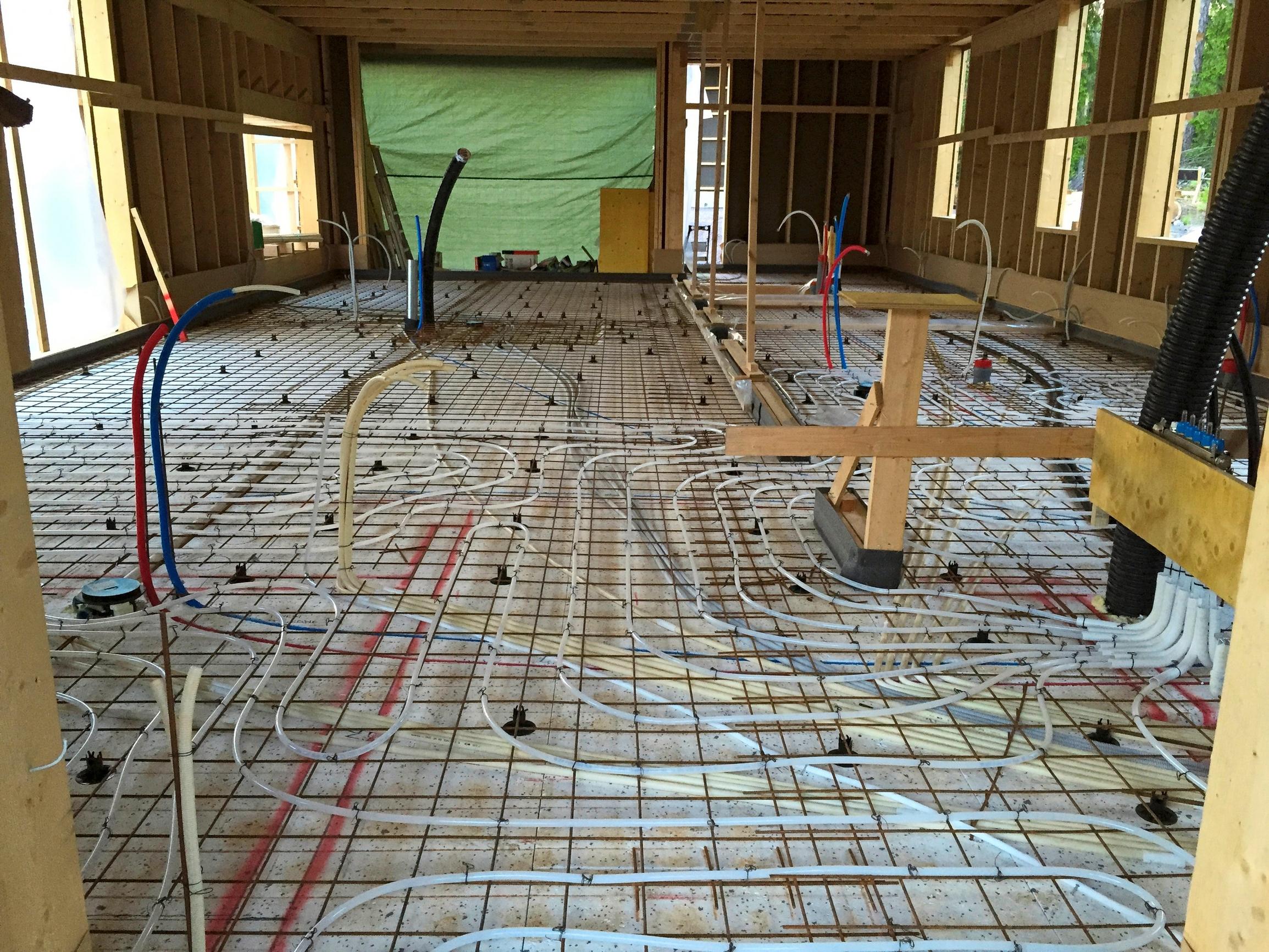 Kodin vesikiertoinen lämmitys oli alun perin suunniteltu vain päätaloa varten, mutta lopulta sillä päädyttiin lämmittämään myös autotalli- ja saunarakennukset. Takan ja aurinkokeräimien lämpö ei riitä pitämään kaikkea lämpimänä, vaan talvisin myös sähköä kuluu lämmitykseen.