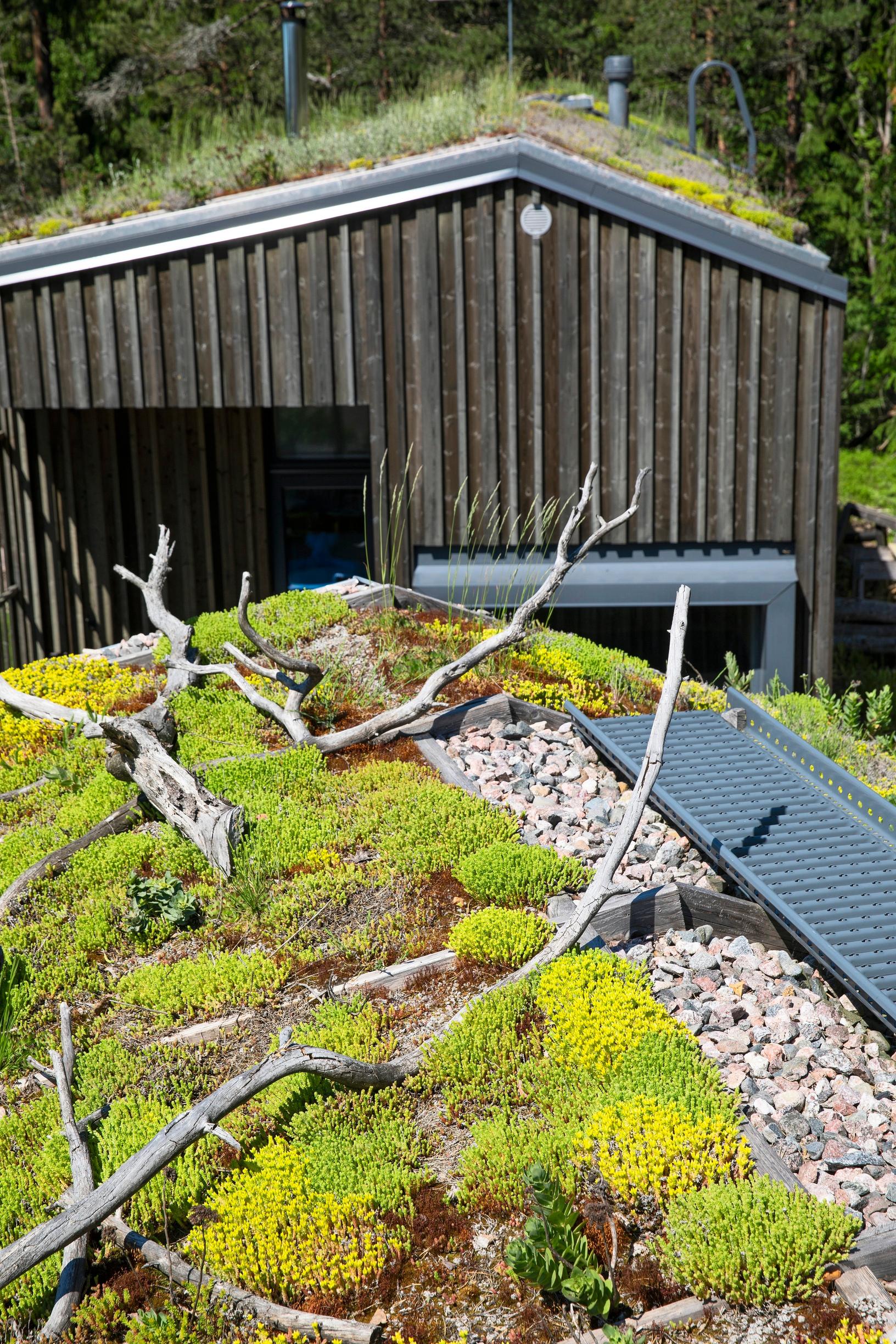 Harmaantuneella laudalla verhoillun talon katolla kukkii siankärsämöä, ahomansikkaa, ketoneilikkaa ja erilaisia maksaruohoja.