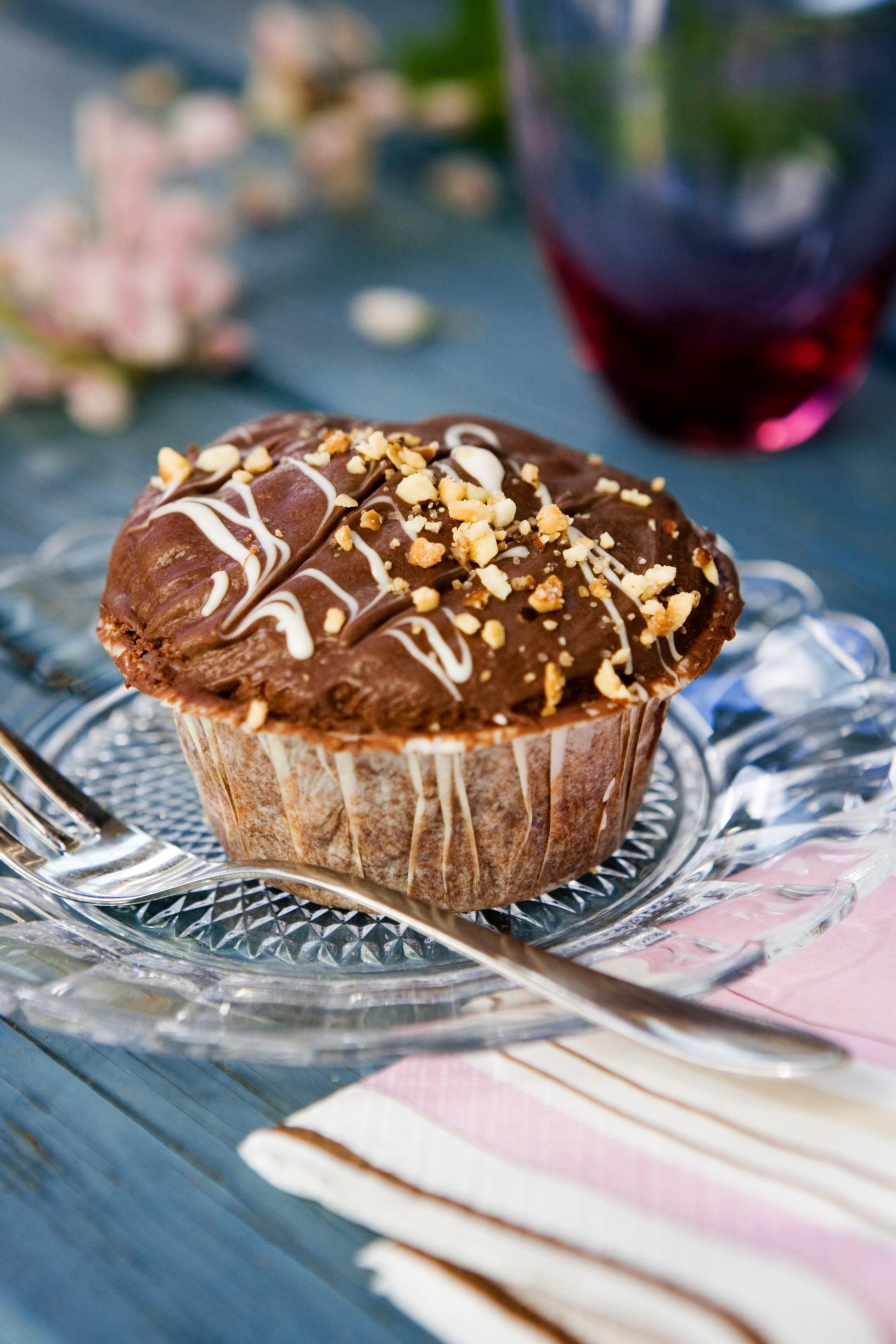 Tässä tulee todellinen tuplaherkku! Pähkinäiset muffinssit kätkevät samaan suloiseen pakettiin sekä pähkinää että suklaata. Suklaata löytyy sekä muffinssin taikinasta että kuorrutuksesta. Nam!