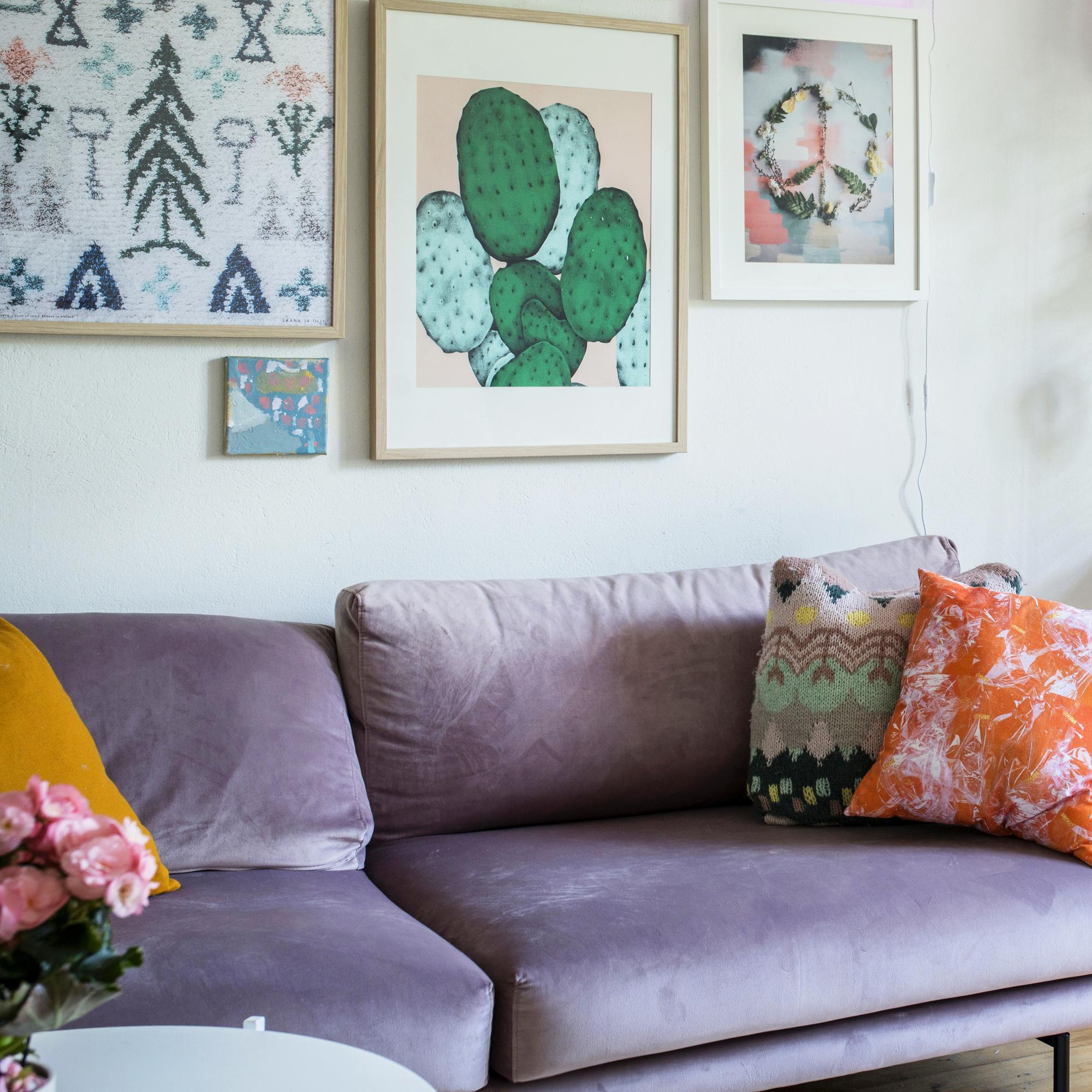 Sängyn ympärillä sataa pastellinvärisiä pisaroita. Ne Tiina on leikannut seinätarroista ja liimannut seinään asetelmaksi. Iso taulu on kehystetty printti Saana & Ollin Elonkierto-ryijyn kuosista. Tiina suunnitteli peace-merkin yhden terrori-iskun jälkeen. Kaktusjuliste on Riikka Koistisen tekemä. Yes-valaisin on ostettu Lagerhausista Ruotsista ja sohva on Hakolalta. Kaksioon mahtuu hyvin, kun olohuone toimii löhöilypaikkana, makuuhuoneena ja työhuoneena. Tiina on visuaalinen suunnittelija, käsityöläinen, bloggaaja ja luova yrittäjä. Tiina kokosi Ikean lipaston itse ja vaihtoi muutamat sen vetimistä mieleisikseen. Yhtenä vetimenä on puuhelmistä tehty helminauha.”Rakastan sitä, että tämä asunto on ylhäällä. Moni ei nuku mielellään verhot auki, mutta meillä ei edes ole verhoja. On ihanaa, kun aurinko paistaa sinne, missä nukun. Herään siihen aamuyöllä ja yritän pysyä hetken hereillä, nauttia valosta, joka tekee kuvioita seinälle. Tykkään myös, kun kahvin tuoksu leijuu sisään läheiseltä kahvipaahtimolta. Tai kun illan viimeinen ratikka kolistelee ohi varikolle.